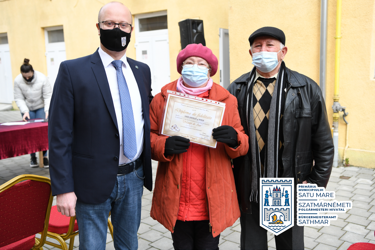 Primarul municipiului, Kereskényi Gábor, viceprimarii Gheorghe Stan și Adelin Ghiarfaș au oferit cuplurilor diplome de fidelitate şi un premiu în valoare de 1000 de lei pentru fiecare familie, felicitând-i pe seniori pentru că sunt un model pentru comunitatea sătmăreană.