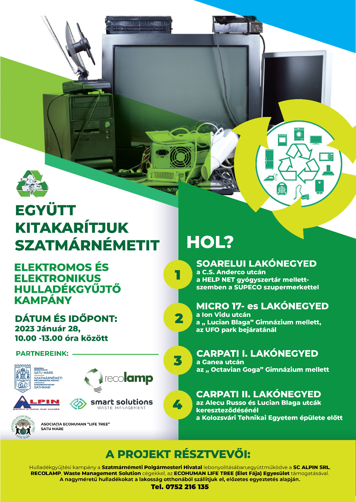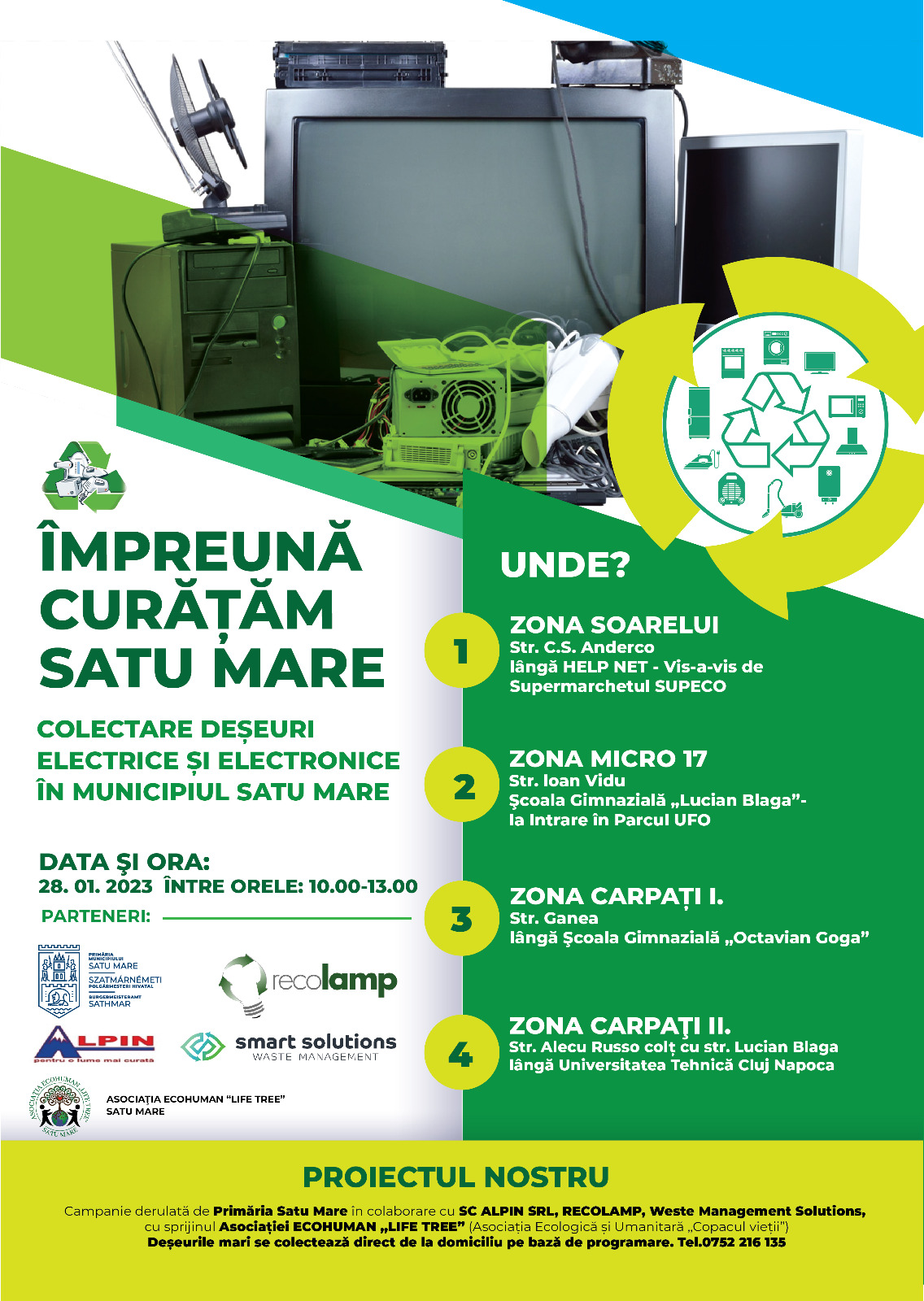 Primăria Municipiului Satu Mare și Asociația Copacul Vieții continuă campania de colectare a deșeurilor electrice și electronice. Sătmărenii au fost receptivi și la acțiunea organizată sâmbătă, 21 ianuarie. La punctele de colectare amenajate au fost depuse 2.83 tone de deșeuri. Acțiunea continuă și în această săptămână, sâmbătă, 28 ianuarie, între orele 10.00-13.00 pe malul stâng al râului Someș, la punctele de colectare enumerate mai jos: