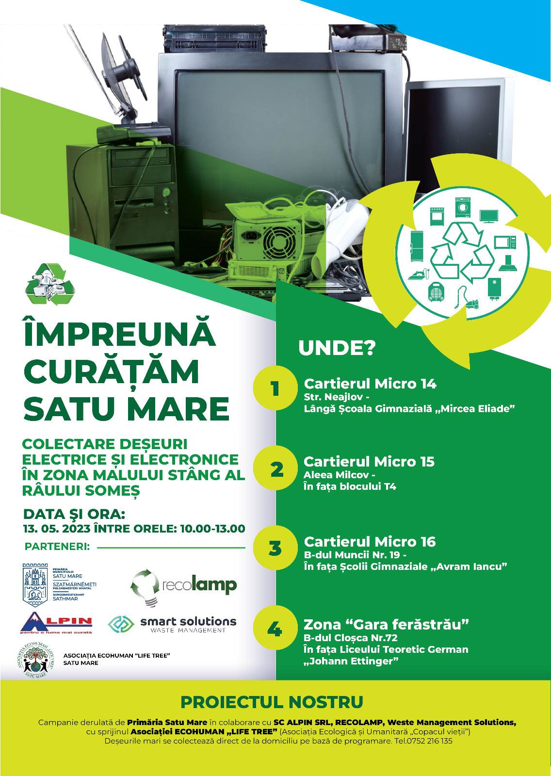 Prima campanie de colectare a deșeurilor electrice și electronice (DEEE) din luna mai, cu titlul generic ,,Împreună curățăm Satu Mare”, inițiată de către Asociația Ecologică și Umanitară ,,Copacul vieții” cu sprijinul Primăriei Municipiului Satu Mare, precum și a agenților economici autorizați pe colectarea, reciclarea și valorificarea DEEE: SC ALPIN SRL Satu Mare și Waste Management Smart Solutions București și Asociația RECOLAMP București, desfășurată sâmbătă 6 mai între orele 10.00-13.00, în patru puncte de colectare amplasate în zona centrală a municipiului Satu Mare, s-a finalizat cu succes.