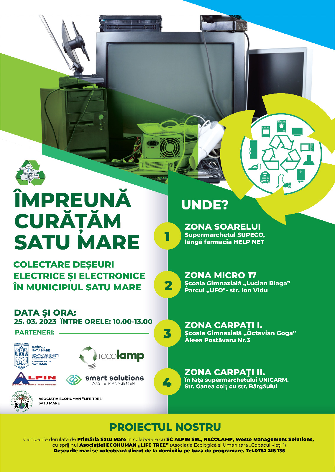 Campania de colectare a deșeurilor electrice și electronice (DEEE), derulată de Asociația ,,Copacul vieții”, cu sprijinul Primăriei Municipiului Satu Mare alături de Alpin SRL, Asociația ,,RECOLAMP” și SC Waste Management Smart Solutions București, au continuat sâmbătă, 18 martie, la cele 4 puncte de colectare.