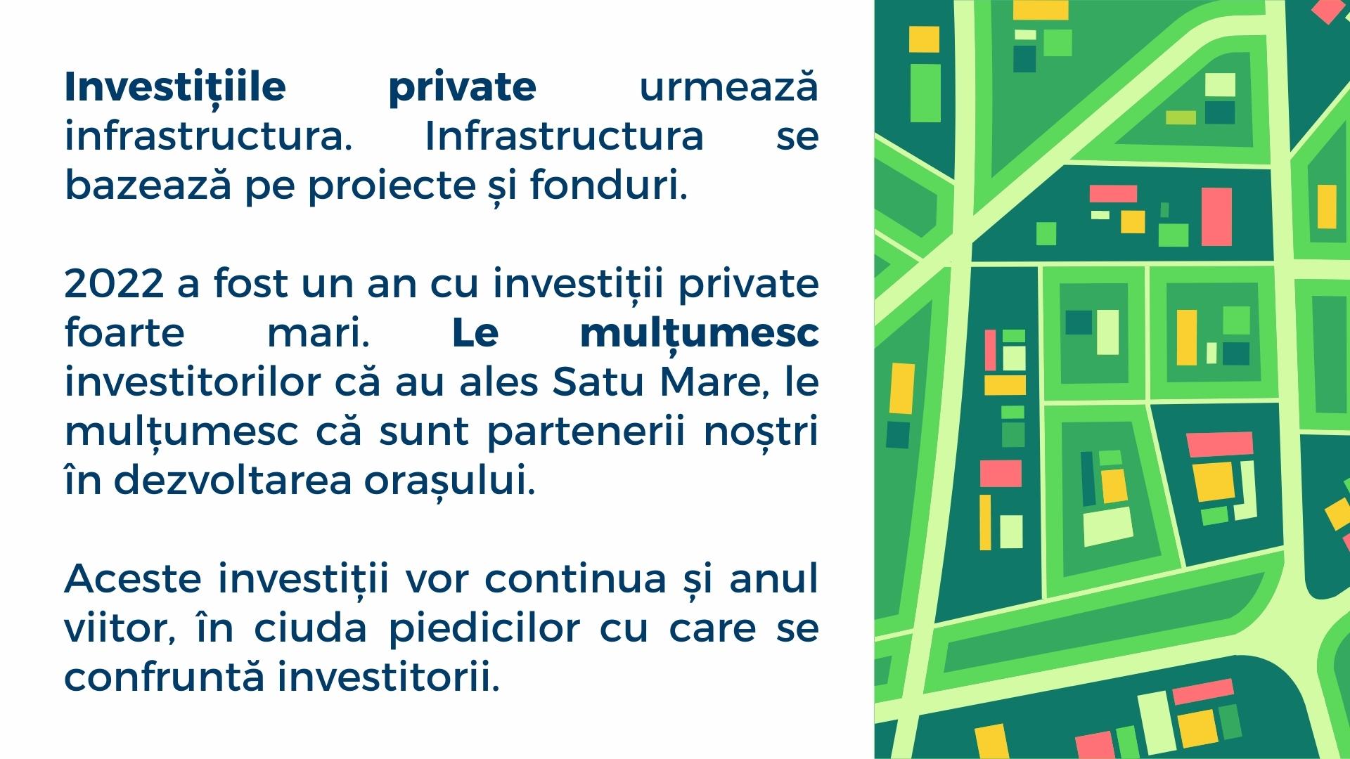Investițiile private urmează infrastructura. Infrastructura se bazează pe proiecte și fonduri. 2022 a fost un an cu investiții private foarte mari. Le mulțumesc investitorilor că au ales Satu Mare, le mulțumesc că sunt partenerii noștri în dezvoltarea orașului. Aceste investiții vor continua și anul viitor, în ciuda piedicilor cu care se confruntă investitorii.