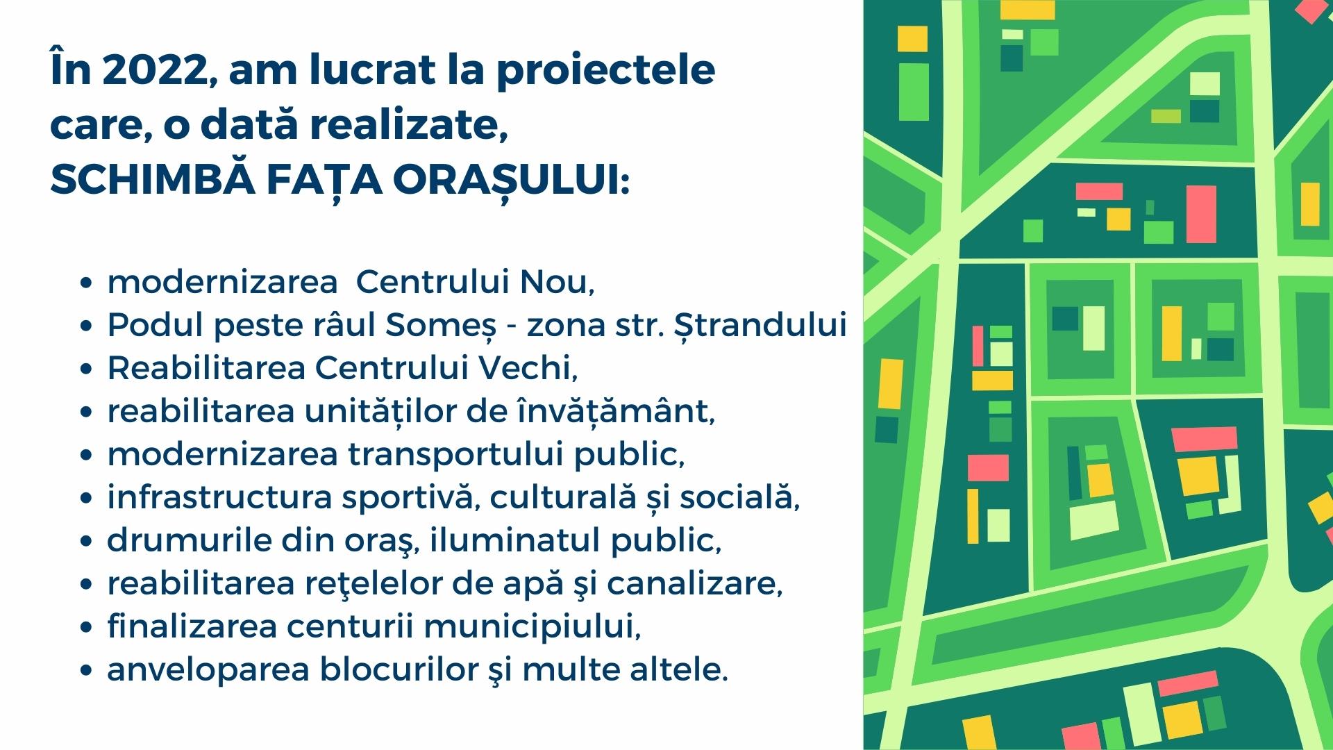 În 2022, am lucrat la proiectele care, o dată realizate, schimbă faţa oraşului: reabilitarea Centrului Nou, Podul peste râul Someș- zona str. Ștrandului, Reabilitarea Centrului Vechi, unităților de învățământ, modernizarea transportului public, infrastructurii sportive, culturale și sociale, iluminatului public, reabilitarea reţelelor de apă şi canalizare, drumurile din oraş, anveloparea blocurilor, finalizarea Centurii municipiului şi multe altele.