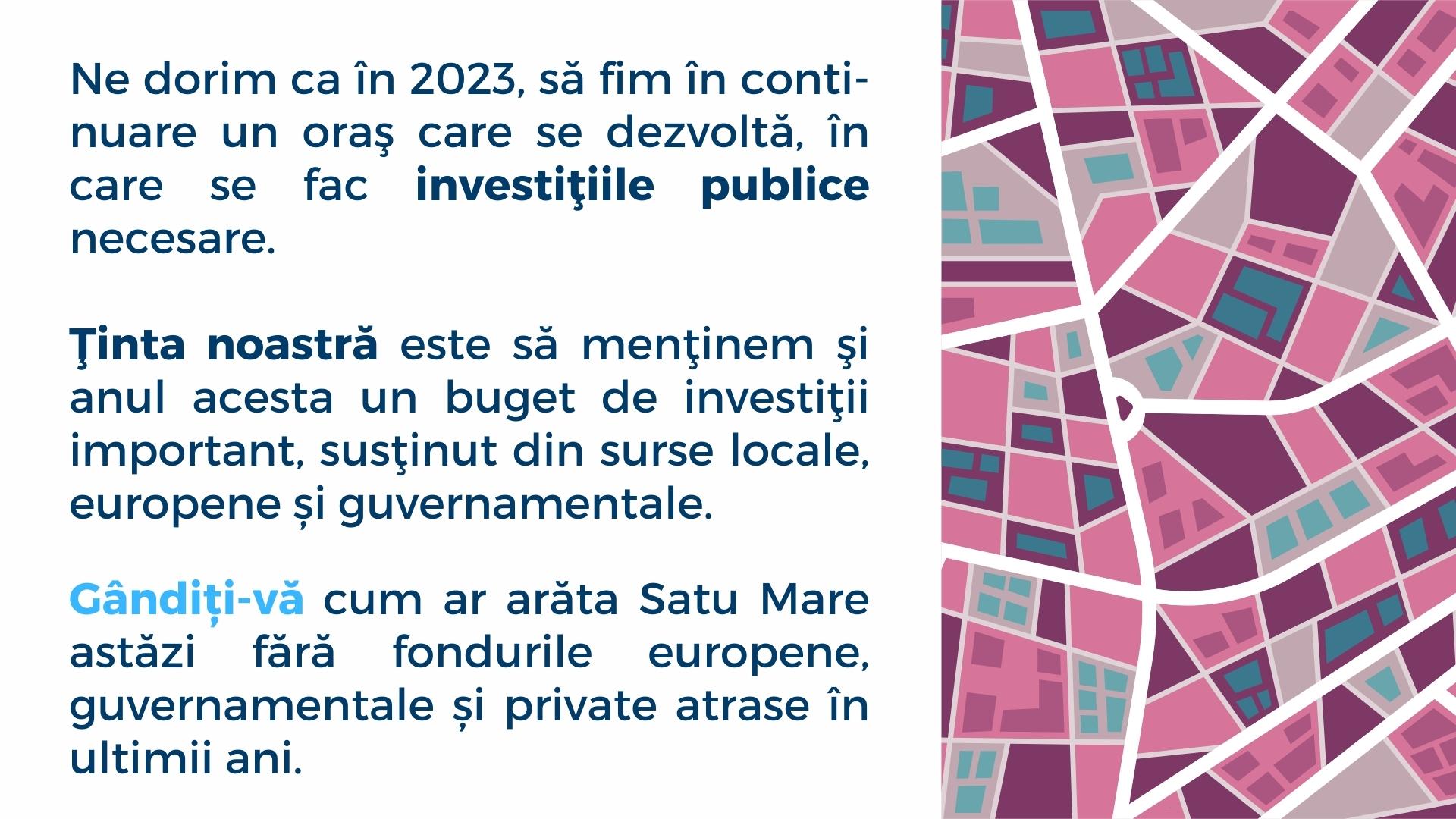 Ne dorim ca în 2023, Satu Mare să fie în continuare un oraş care se dezvoltă, în care se fac investiţiile publice necesare. Ţinta noastră este să menţinem şi anul acesta un buget de investiţii important, susţinut din surse locale, europeane și guvernamentale.