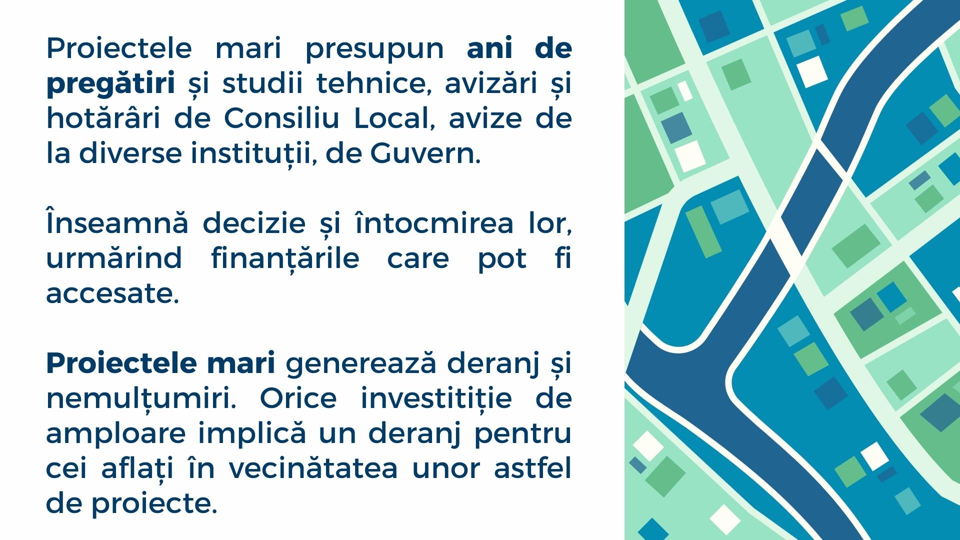 Proiectele mari presupun ani de pregătiri și studii tehnice, avizări și hotărâri de Consiliu Local, avize de la diverse instituții, de Guvern. Înseamnă decizie și întocmirea lor, urmărind finanțările care pot fi accesate.