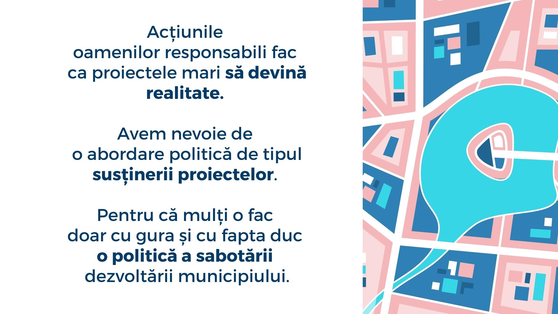 Acțiunile oamenilor responsabili fac ca proiectele mari să devină realitate. Avem nevoie de o abordare politică de tipul susținerii proiectelor. Pentru că mulți o fac doar cu gura și cu fapta duc o politică a sabotării dezvoltării municipiului.