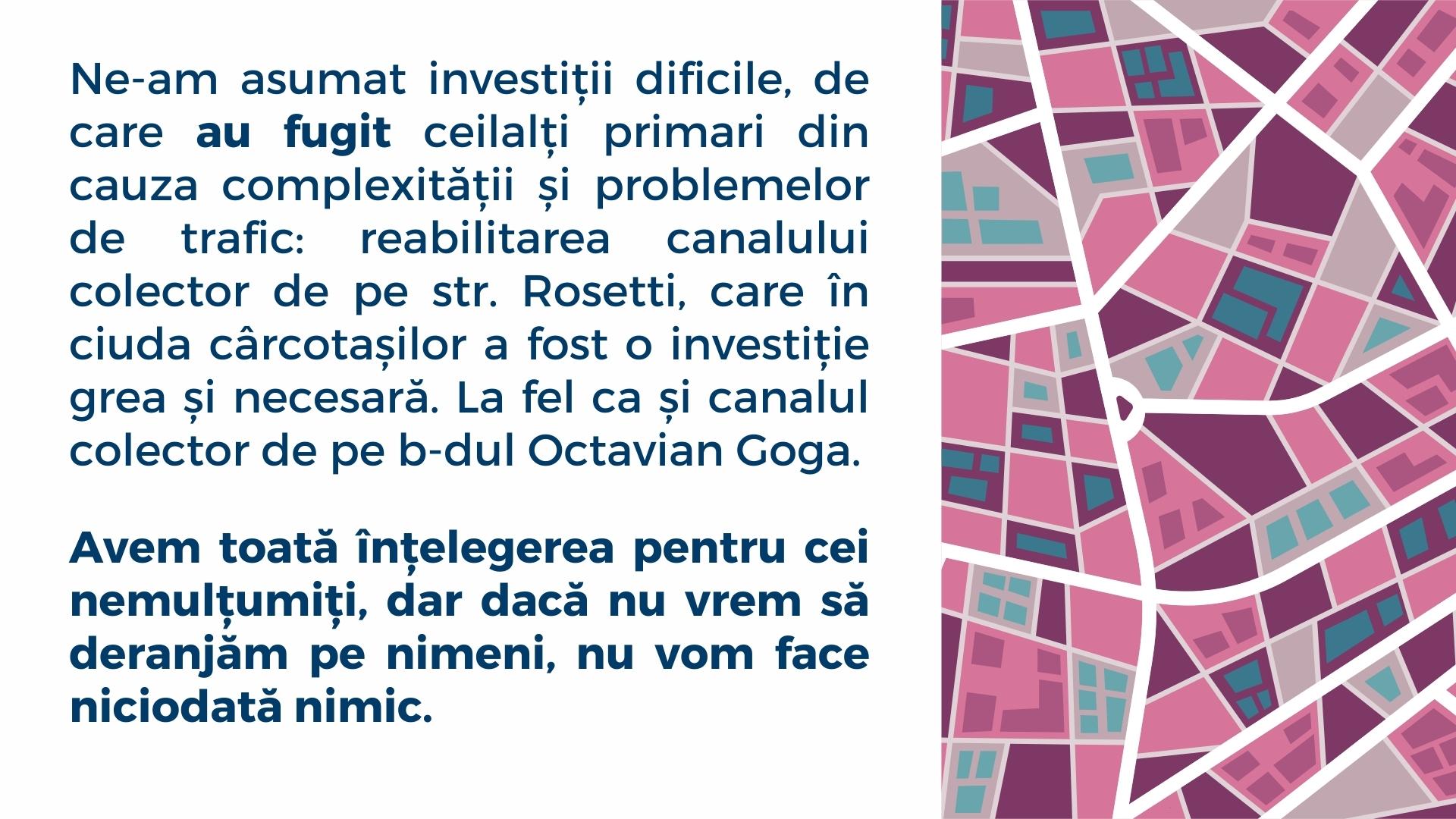 Ne-am asumat investiții dificile, de care au fugit ceilalți primari din cauza complexității și problemelor de trafic. Reabilitarea canalului colector de pe str. Rosetti, care în ciuda cârcotașilor a fost o investiție grea și necesară. La fel ca și canalul colector de pe b-dul Octavian Goga. Am toată înțelegerea pentru cei nemulțumiți, dar dacă nu vrem să deranjăm pe nimeni, nu vom face niciodată nimic. Continuăm reabilitarea Centrului Vechi va crea discomfort, dar vom reda frumusețea centrului istoric al orașului nostru.