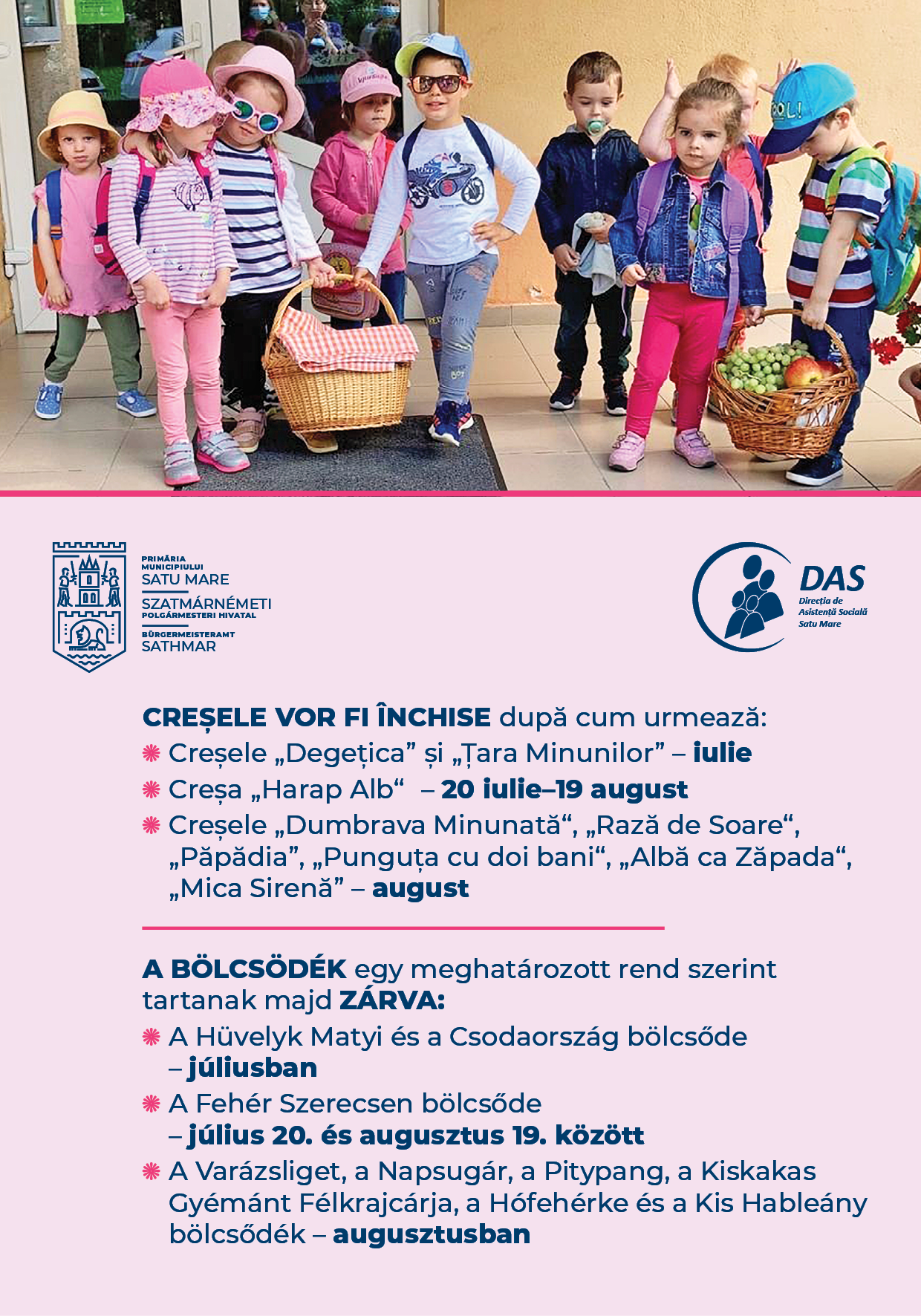 Stimați părinți, a venit momentul să vă faceți planurile de vacanță alături de cei mici. Creșele se vor închide rând pe rând, astfel încât fiecare copil să aibă posibilitatea de a petrece vacanța cu cei dragi. Vacanța pentru cei mici este importantă, iar momentele pe care le veți petrece împreună sunt spre binele celor mici, astfel încât vă recomandăm ca doar în cazuri excepționale să îi privați pe copii de această binemeritată vacanță. Pe de altă parte, vă rugăm să țineți cont că acele creșe care rămân deschise nu au capacitatea să răspundă tuturor solicitărilor deoarece sunt frecventate de proprii copii. Vă mulțumim pentru înțelegere!