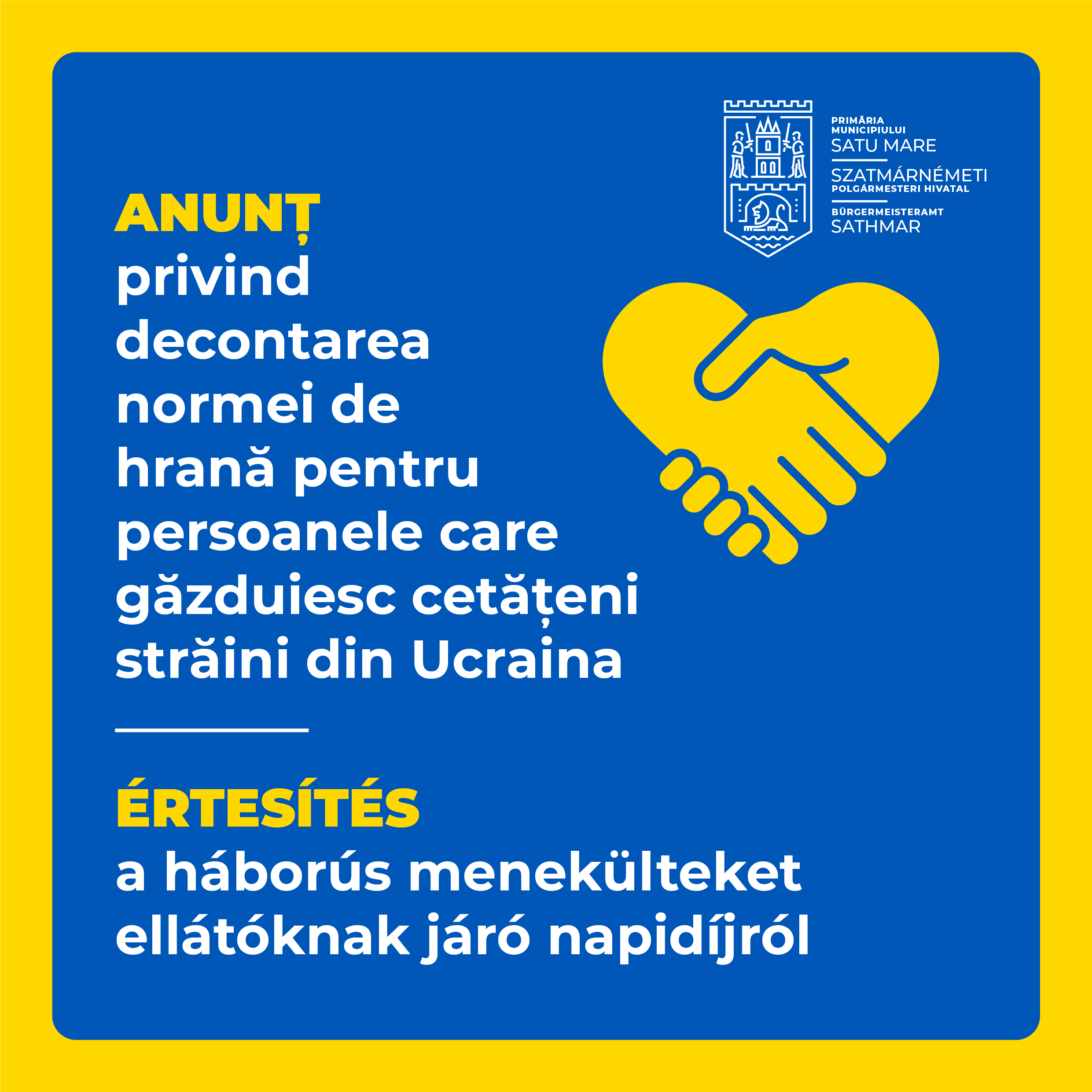 Primăria Municipiului Satu Mare, Serviciul Situații de Urgență aduce la cunoștință publică procedura de decontarea normei de hrană, în limita sumei de 20 de lei/persoană/zi pentru hrană și 50 de lei/persoană/zi pentru cazare, conform art.1, alin.10 din Ordonanța de Urgență nr.15 din 27 februarie 2022, cu modificările și completările ulterioare și a prevederilor Hotărârii nr.336 din 11.03.2022 pentru persoanele fizice care găzduiesc cetățeni străini sau apatrizi proveniți din zona conflictului armat din Ucraina.