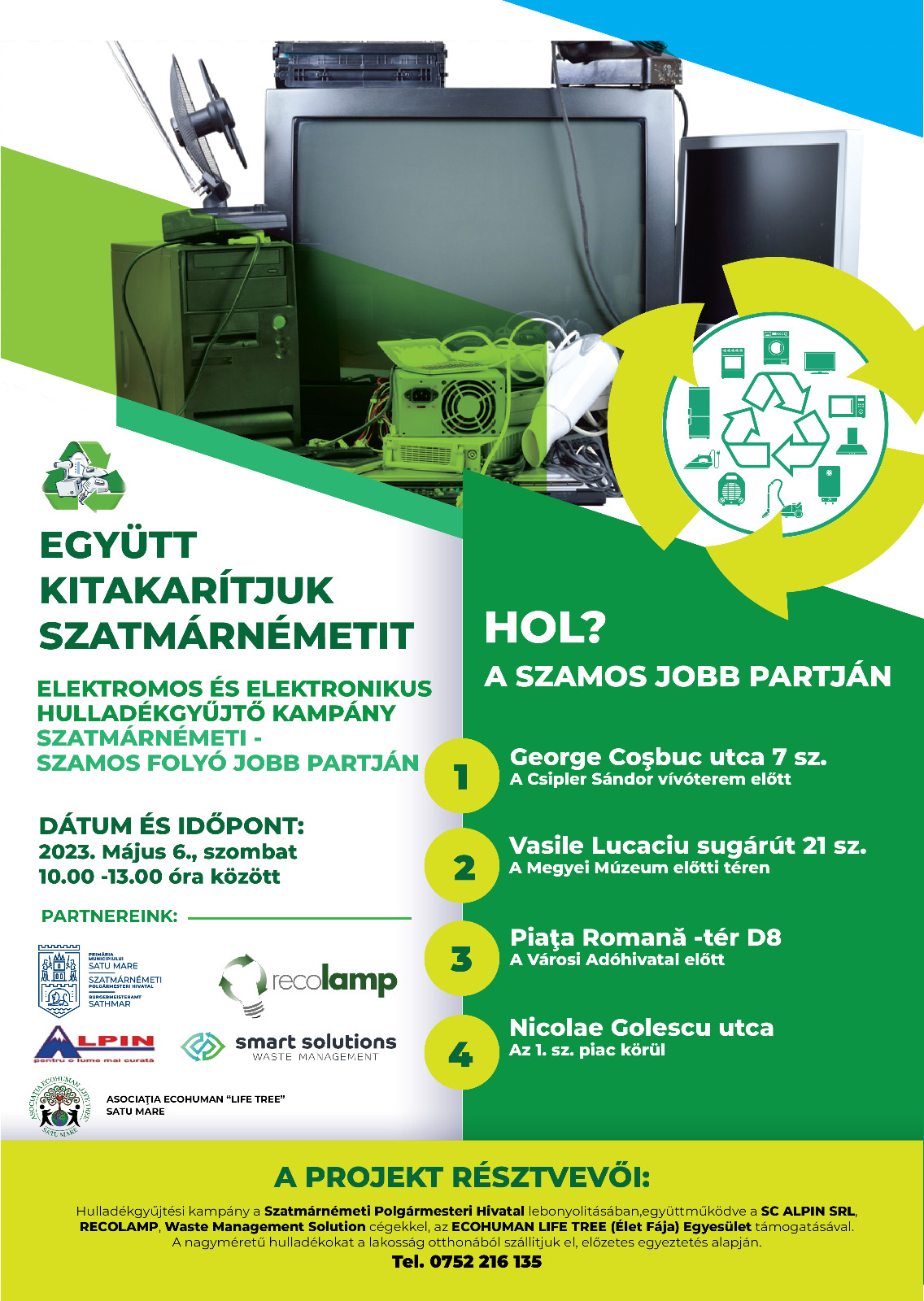 Az „Együtt kitakarítjuk Szatmárnémetit", az Élet Fája Egyesület és a közreműködő kereskedelmi egységek 10 és 13 óra között négy ponton gyűjtik össze a feleslegessé vált elektronikai cikkeket.