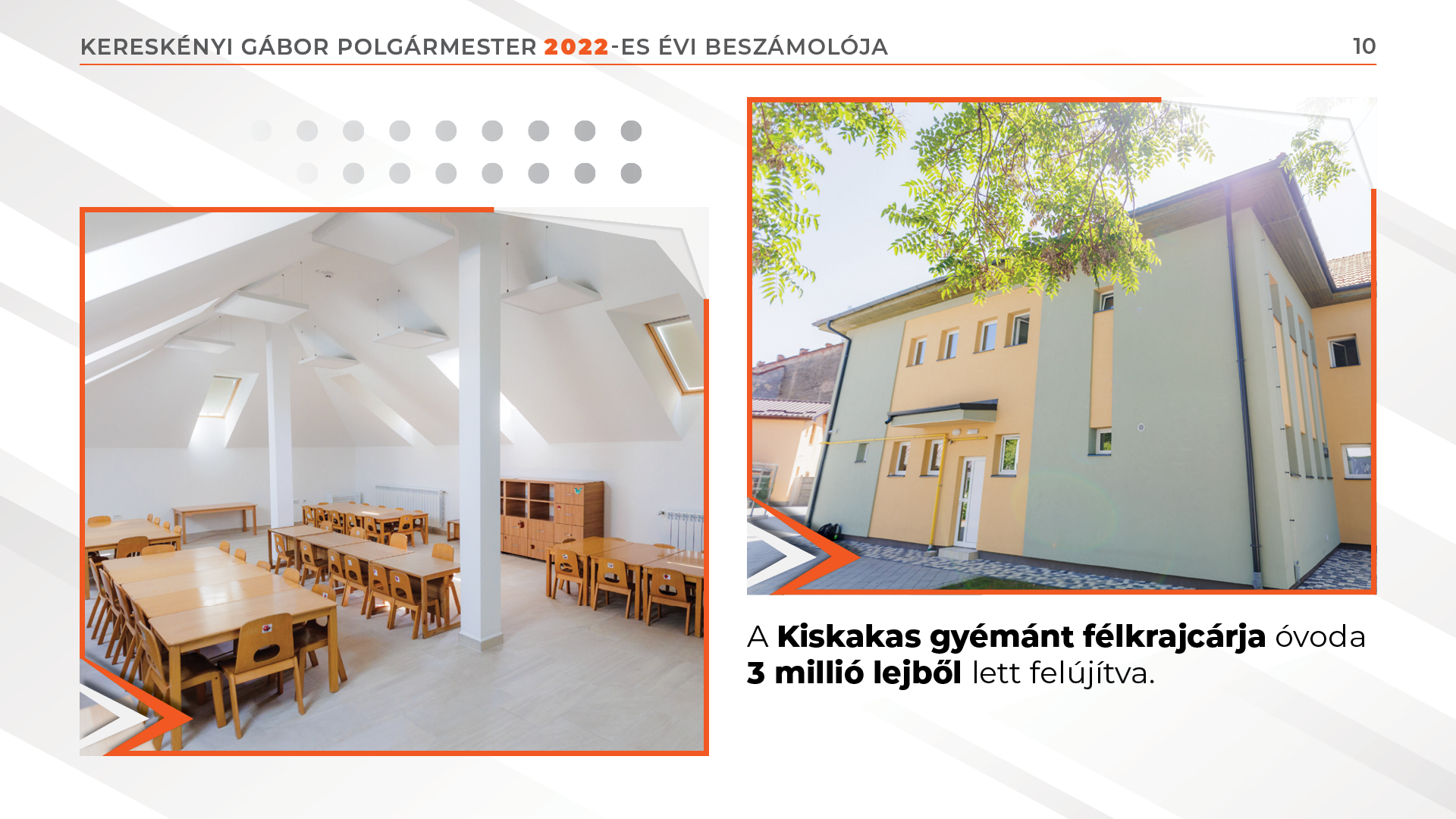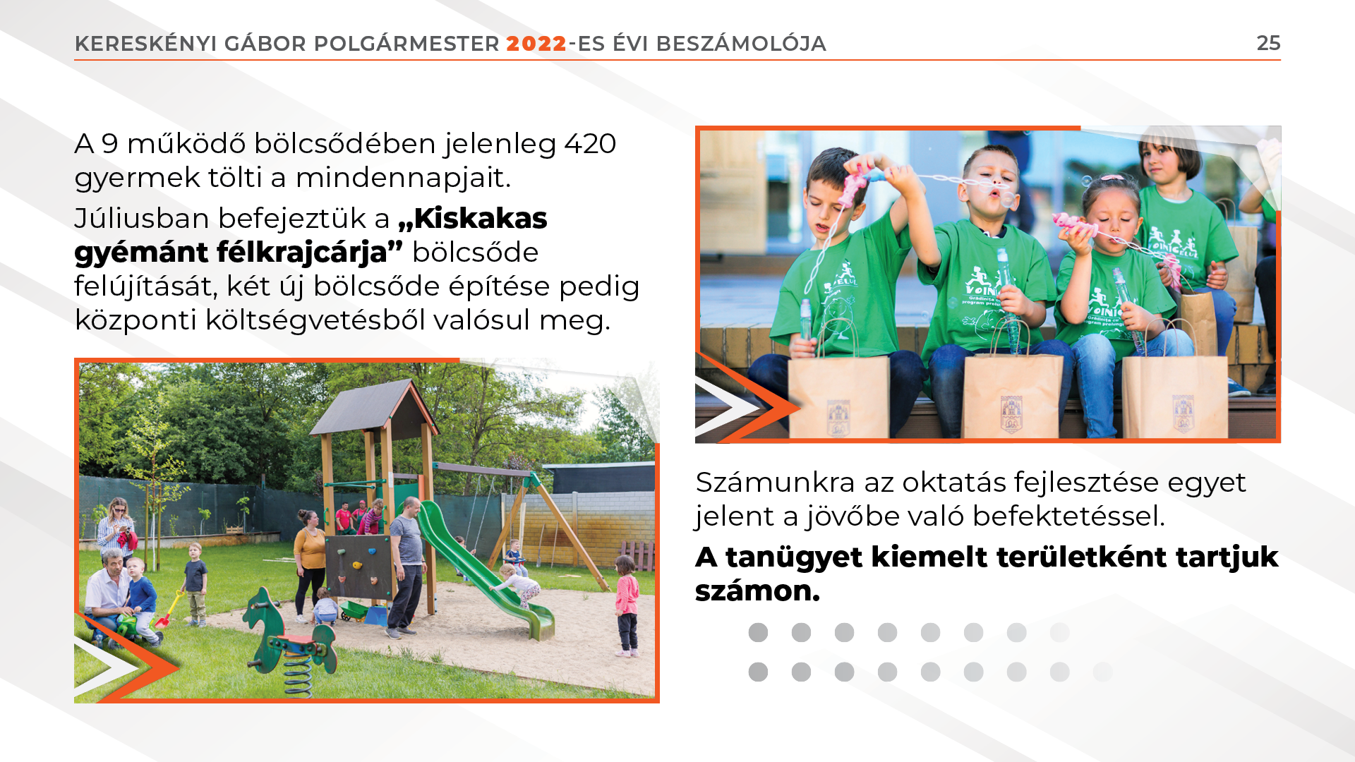 Júliusban befejeztük a „Kiskakas gyémánt félkrajcárja” bölcsőde felújítását, két új bölcsőde építése pedig központi költségvetésből valósul meg.