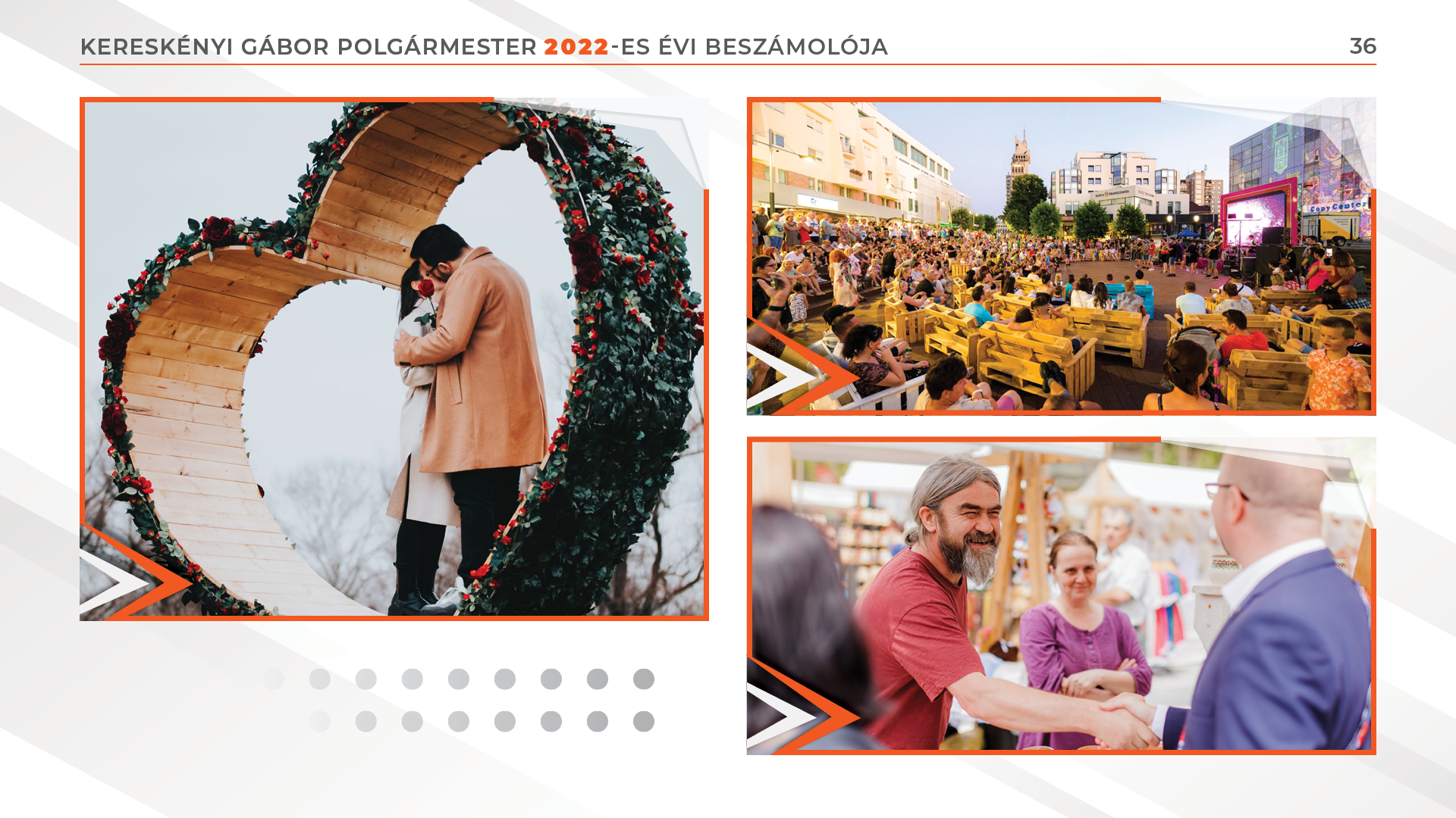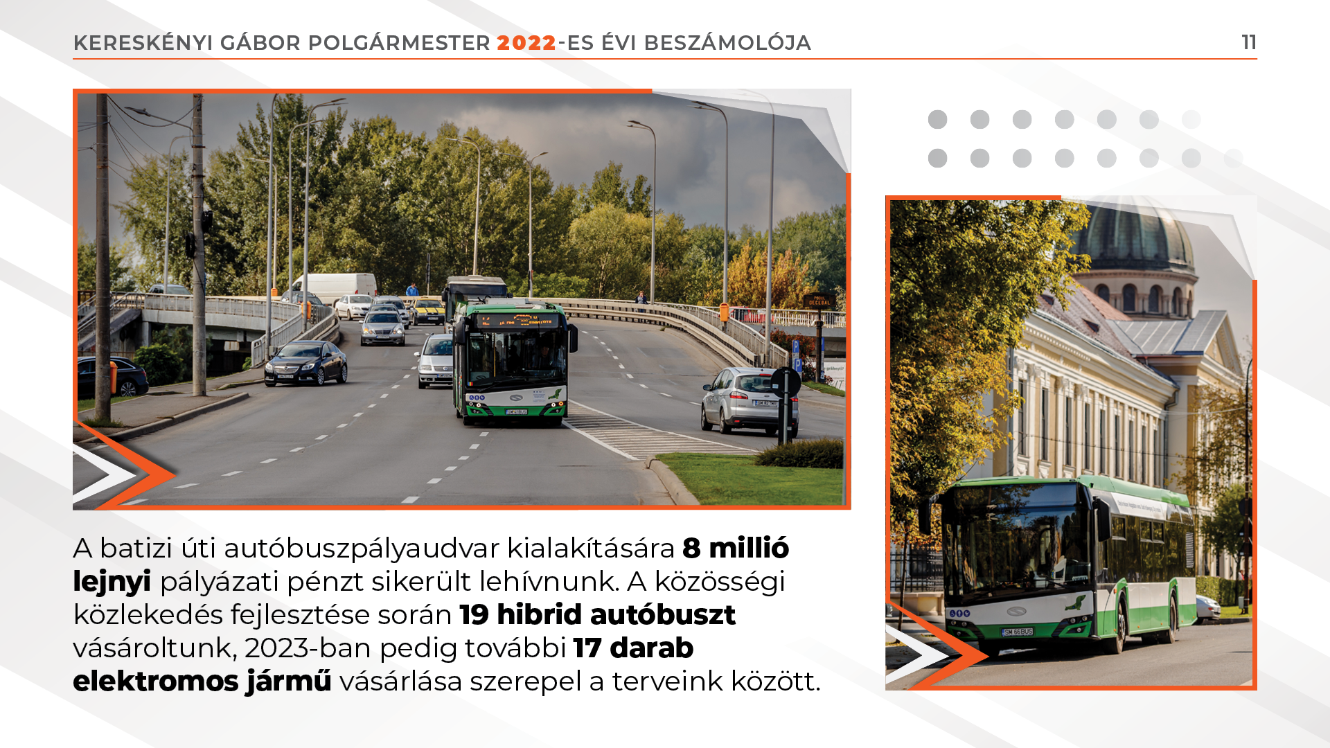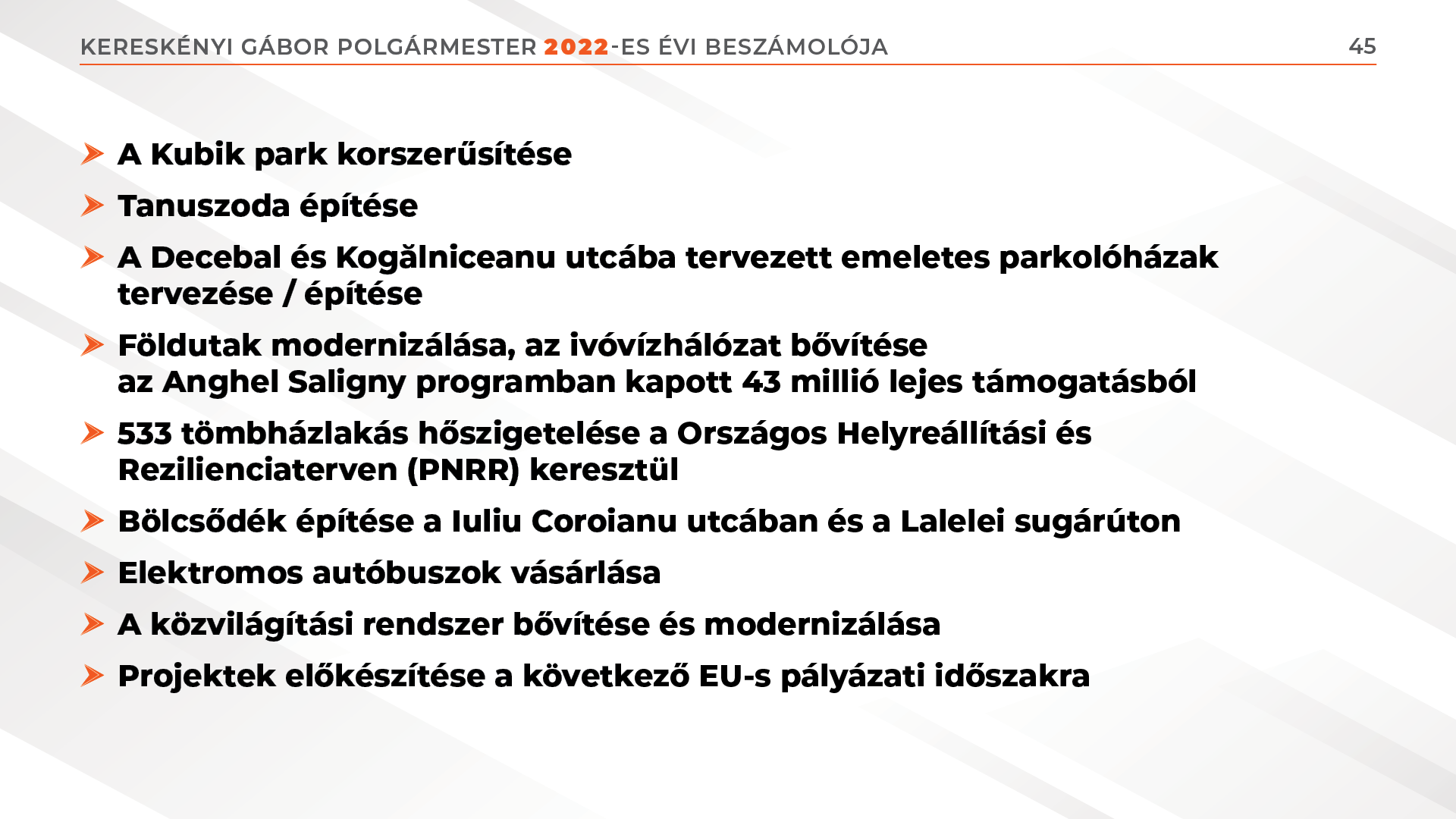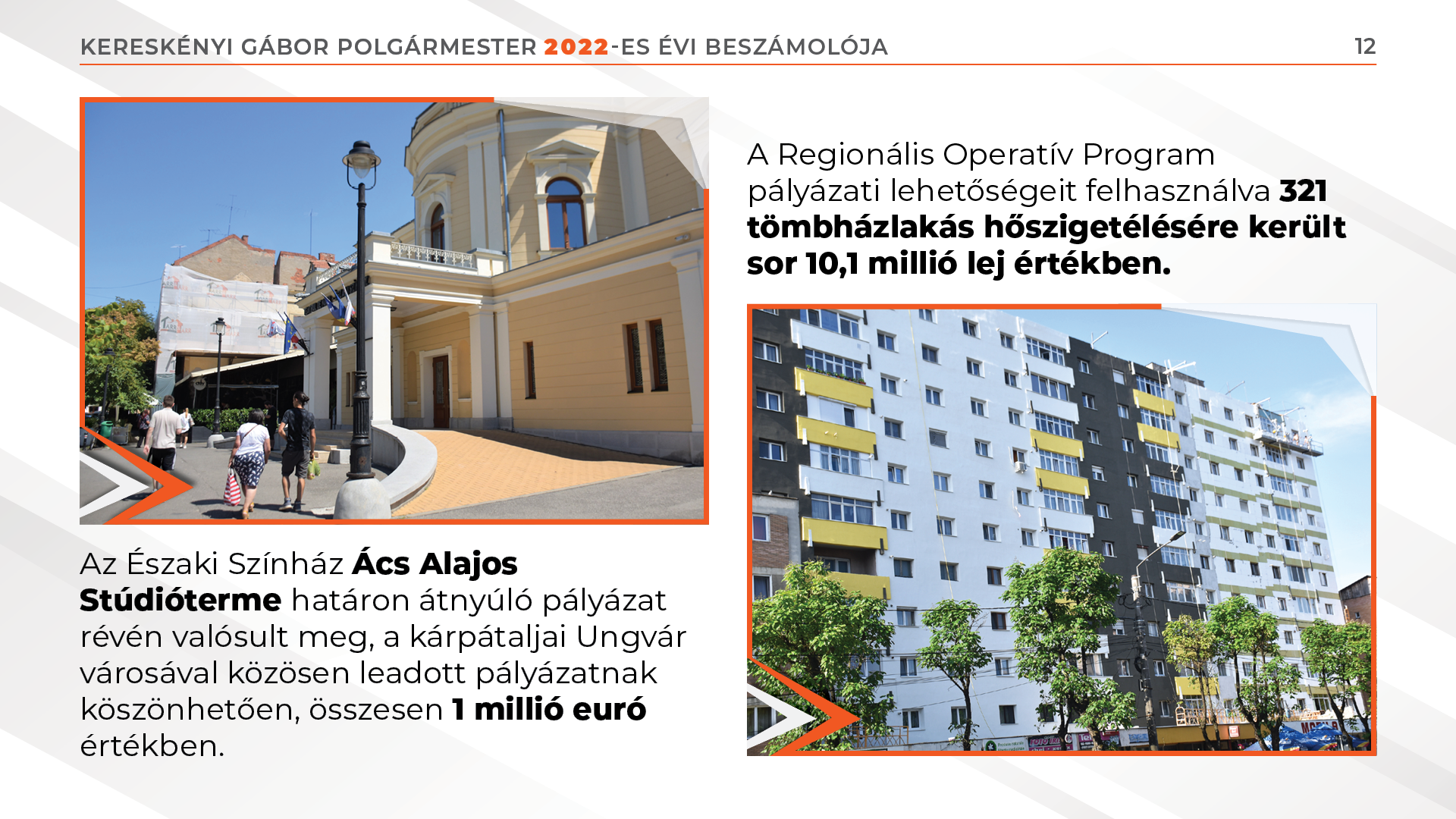 A beruházás értéke 6,8 millió lej. A Kiskakas gyémánt félkrajcárja óvoda 3 millió lejből lett felújítva. A batizi úti autóbuszpályaudvar kialakítására 8 millió lejnyi pályázati pénzt sikerült lehívnunk. A közösségi közlekedés fejlesztése során 19 hibrid autóbuszt vásároltunk, 2023-ban pedig további 17 darab elektromos jármű vásárlása szerepel a terveink között. Az Északi Színház Ács Alajos Stúdióterme határon átnyúló pályázat révén valósult meg, a kárpátaljai Ungvár városával közösen leadott pályázatnak köszönhetően, összesen 1 millió euró értékben. A Regionális Operatív Program pályázati lehetőségeit felhasználva 321 tömbházlakás hőszigetélésére került sor 10,1 millió lej értékben.