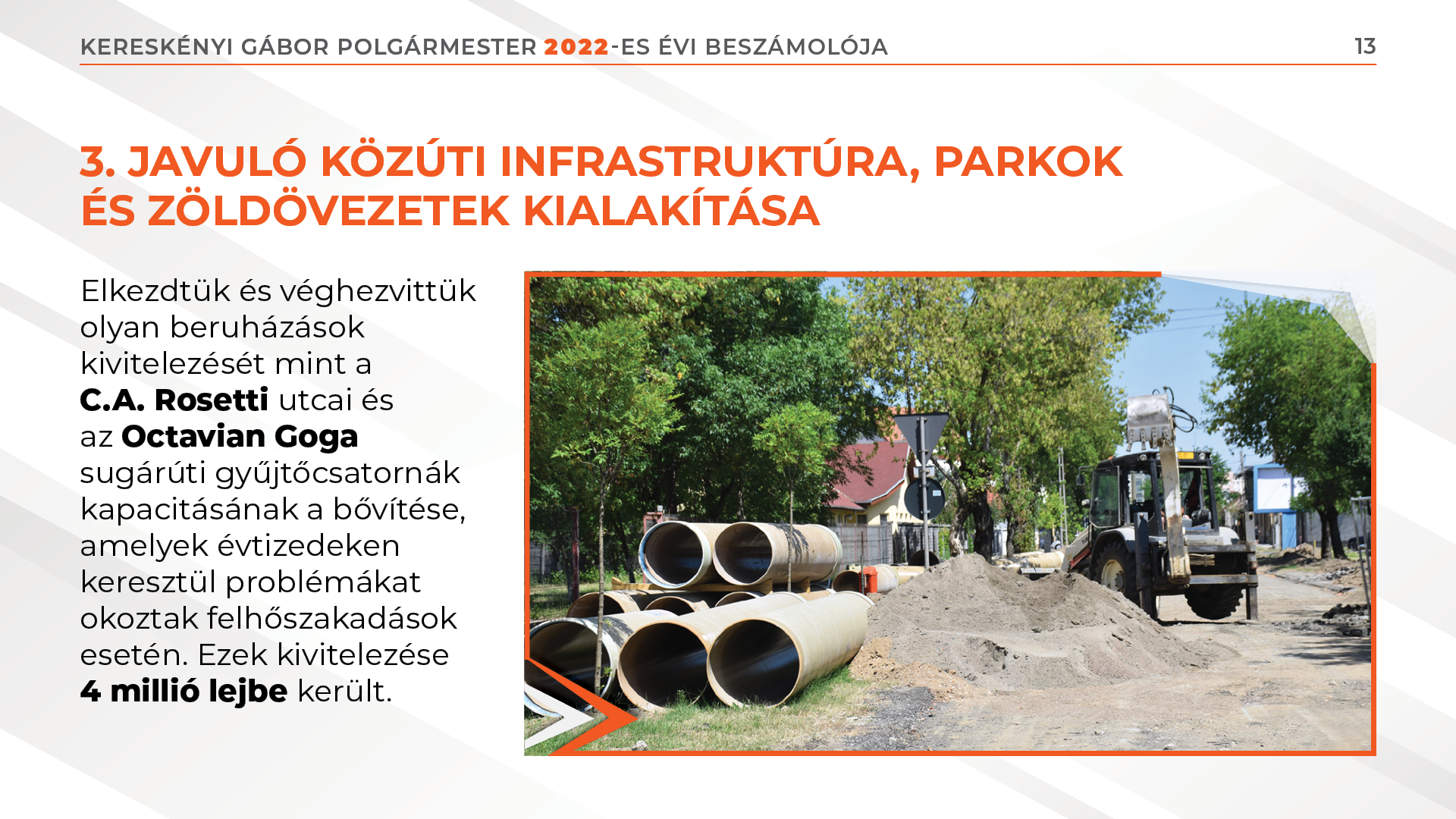Elkezdtük és véghezvittük olyan beruházások kivitelezését mint a C.A. Rosetti utcai és az Octavian Goga sugárúti gyűjtőcsatornák kapacitásának a bővítése, amelyek évtizedeken keresztül problémákat okoztak felhőszakadások esetén. Ezek kivitelezése 4 millió lejbe került.