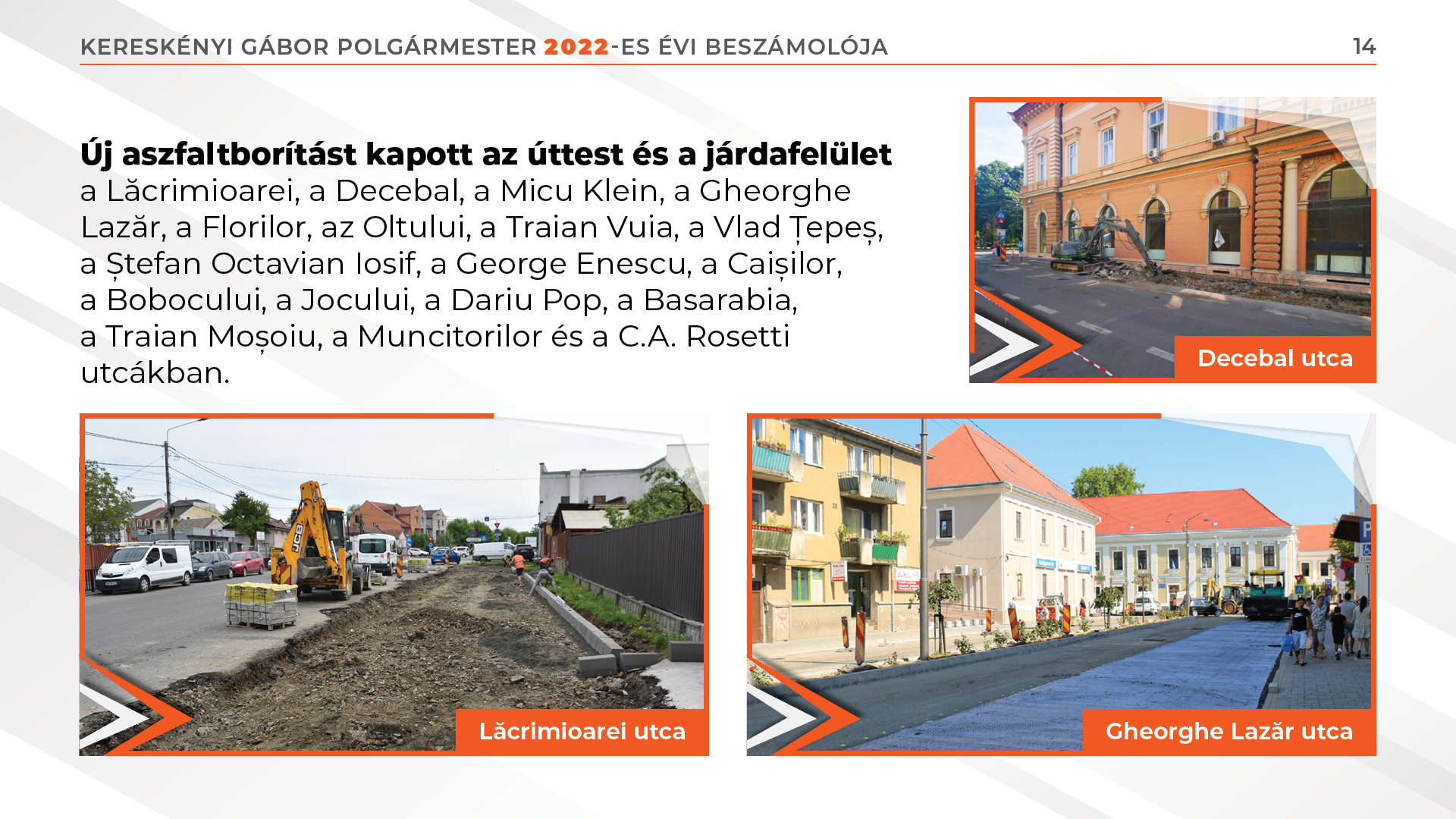 Új aszfaltborítást kapott az úttest és a járdafelület a Lăcrimioarei, a Decebal, a Micu Klein, a Gheorghe Lazăr, a Florilor, az Oltului, a Traian Vuia, a Vlad Țepeș, a Ștefan Octavian Iosif, a George Enescu, a Caișilor, a Bobocului, a Jocului, a Dariu Pop, a Basarabia, a Traian Moșoiu, a Muncitorilor és a C.A. Rosetti utcákban.