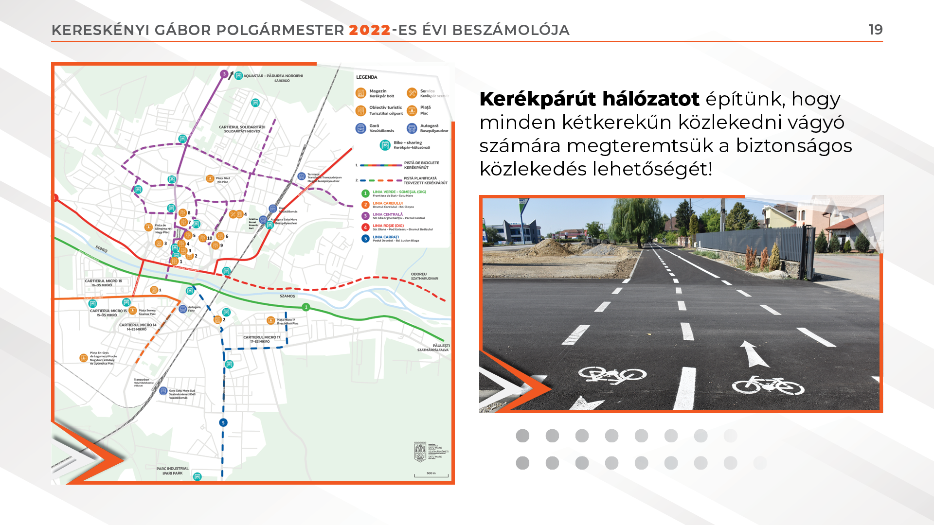 Korszerű járda készült a Trandafirilor, a Liviu Rebreanu és a Mihai Eminescu utcákban, valamint a Sugárúton és a Batizi úton is. Utóbbi mentén elkészült az új kerékpárút, a Szamos bal töltésén pedig felújítottuk azt a kerekezők nagy örömére.