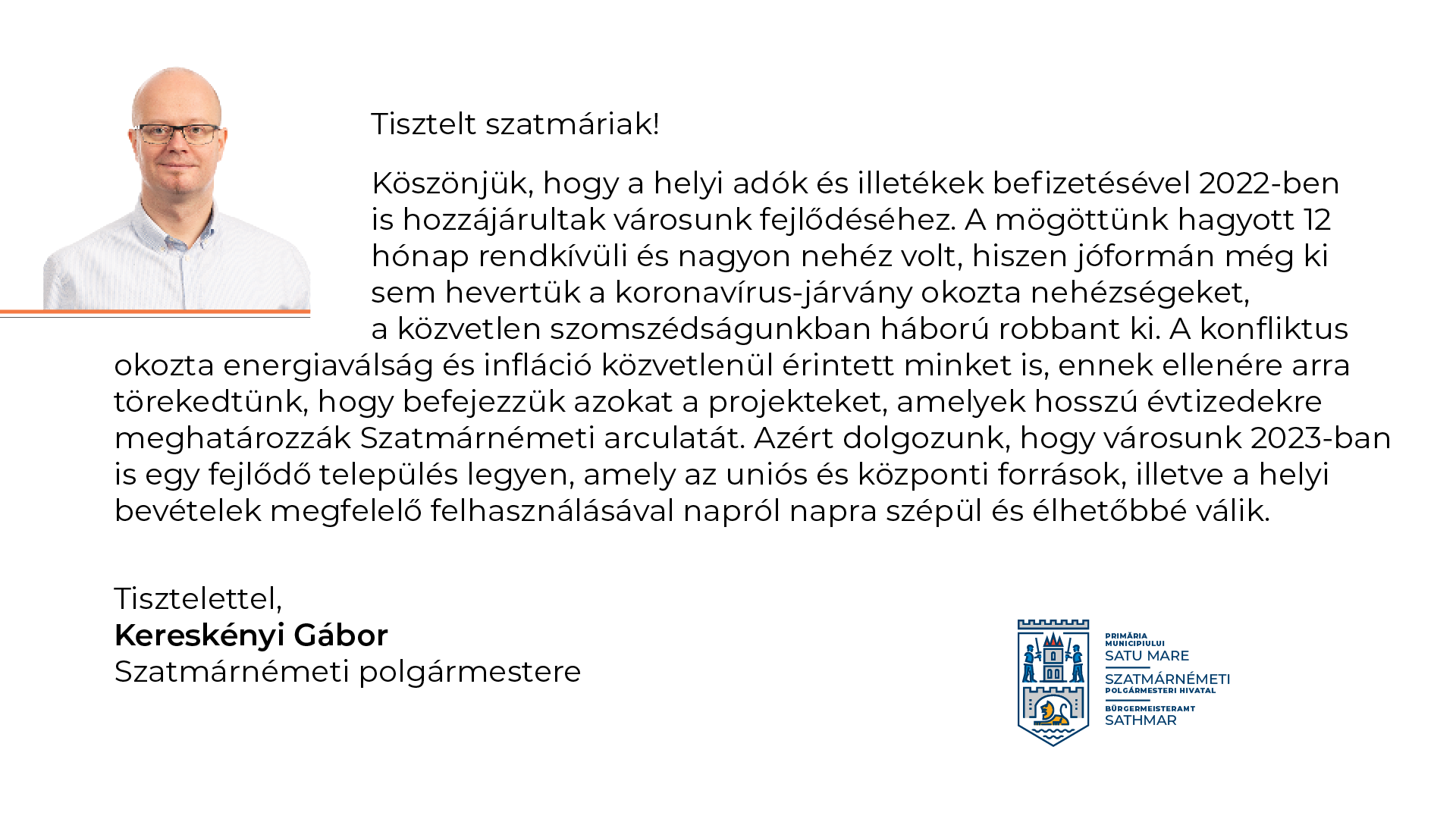 Azt akarjuk, hogy Szatmárnémeti 2023-ban is egy folyamatosan fejlődő város legyen, ahol elvégzik a szükséges közérdekű beruházásokat. Köszönetet mondok a helyi tanácsosoknak, a két alpolgármesternek – Adelin Cristian Ghiarfașnak, Cristina Tămășan Ilieșnek –, ahogyan Maskulik Csaba városmenedzsernek is a munkájukért. Köszönöm az elmúlt évi jó együttműködést a polgármesteri hivatal dolgozóinak, az alárendelt intézmények munkatársainak és a sajtó képviselőinek. Köszönet illeti a szatmáriakat is, akik továbbra is a legfőbb partnereink maradnak.