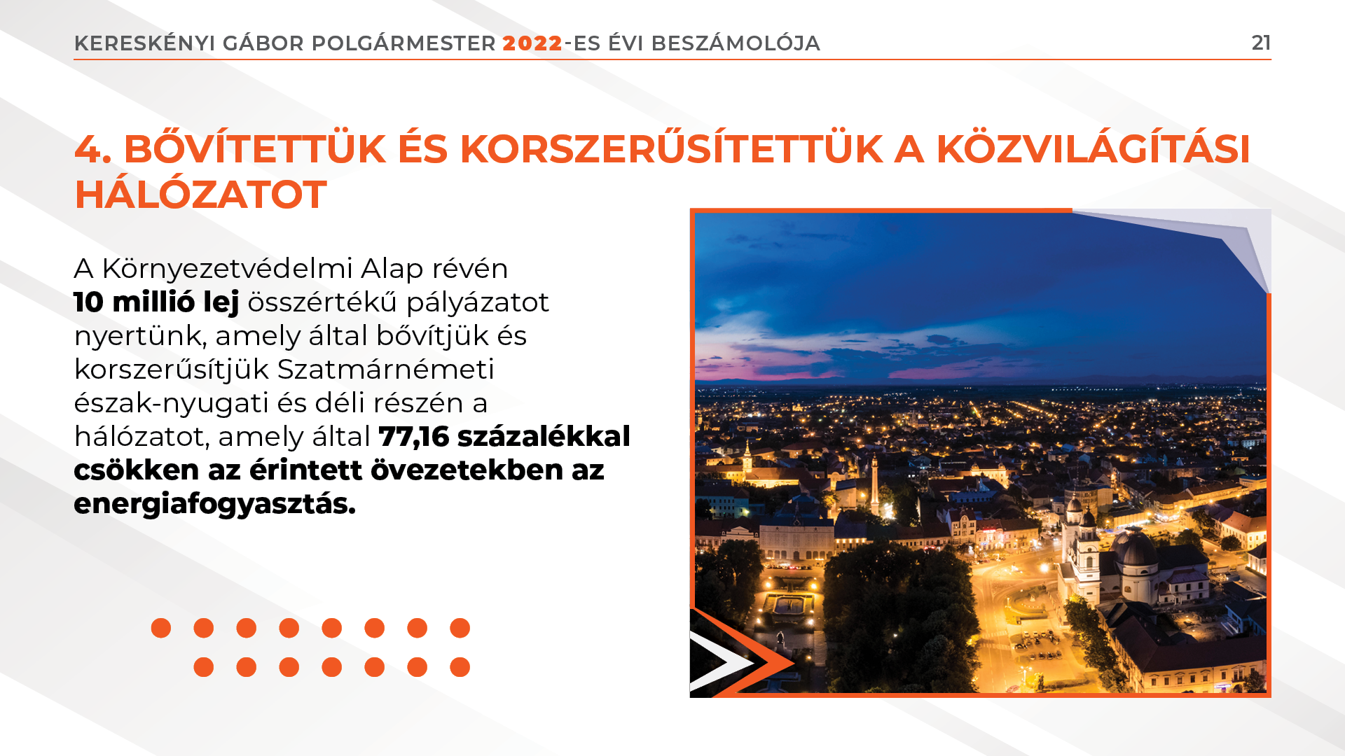 A Környezetvédelmi Alap révén 10 millió lej összértékű pályázatot nyertünk, amely által bővítjük és korszerűsítjük Szatmárnémeti észak-nyugati és déli részén a hálózatot, amely által 77,16 százalékkal csökken az érintett övezetekben az energiafogyasztás.