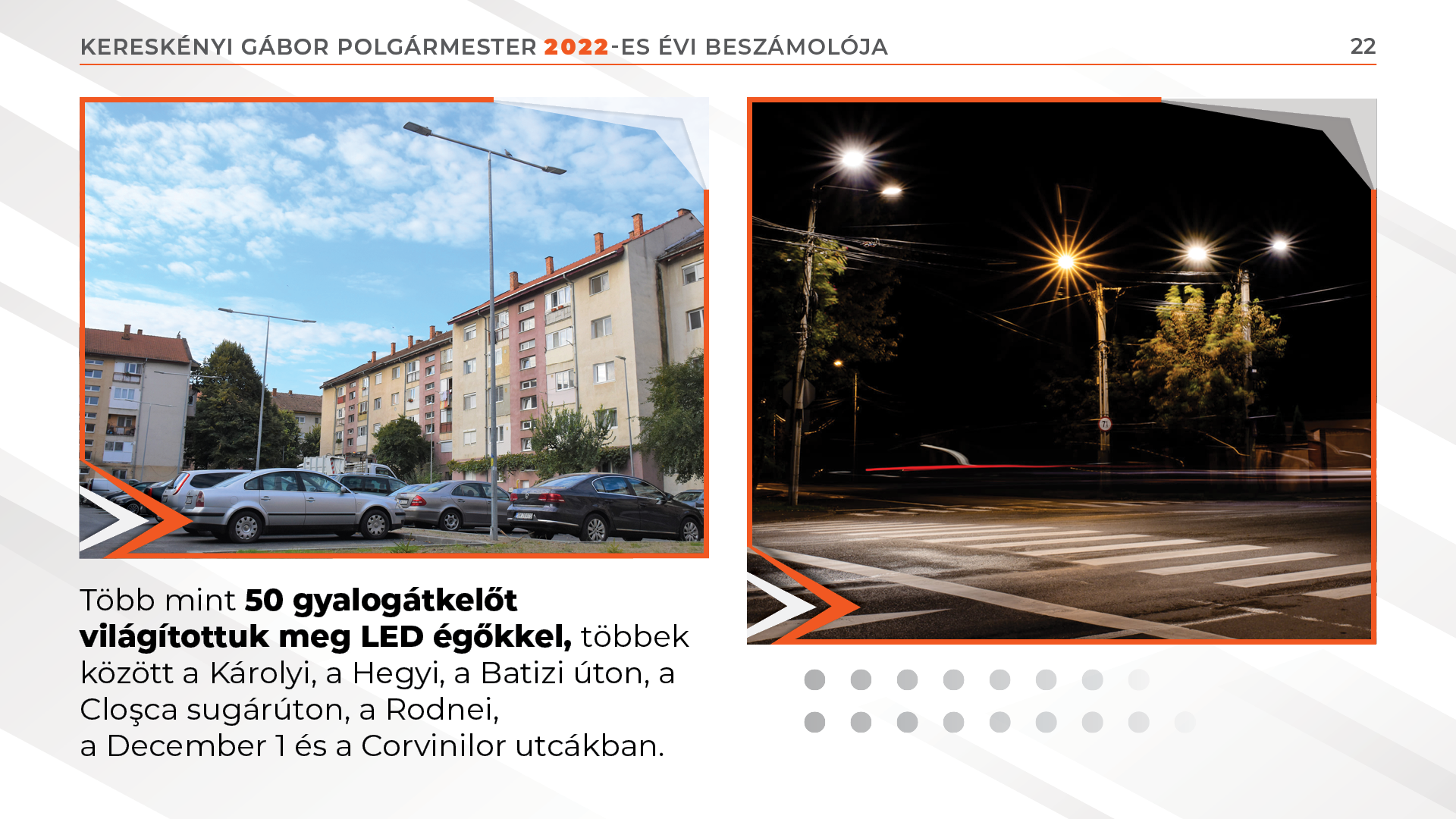 Több mint 50 gyalogátkelőt világítottuk meg LED égőkkel, többek között a Károlyi, a Hegyi, a Batizi úton, a Cloşca sugárúton, a Rodnei, a December 1 és a Corvinilor utcákban.