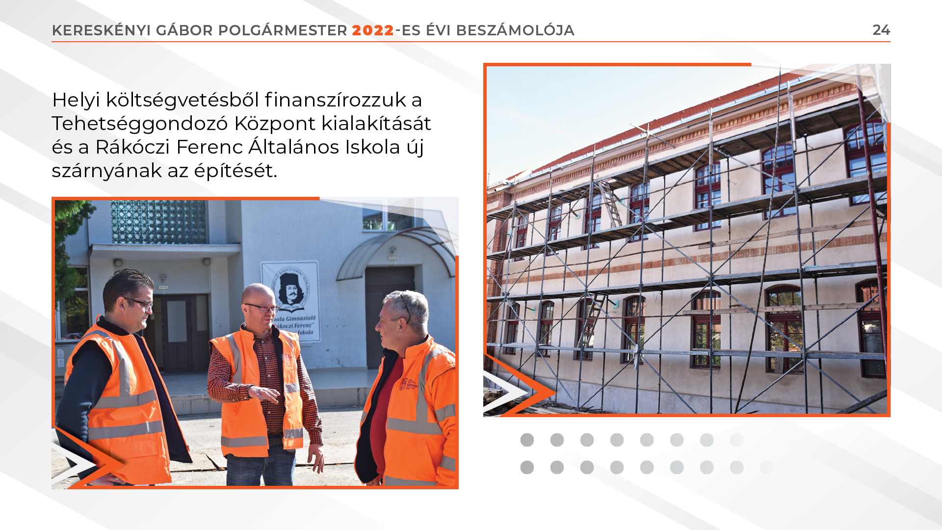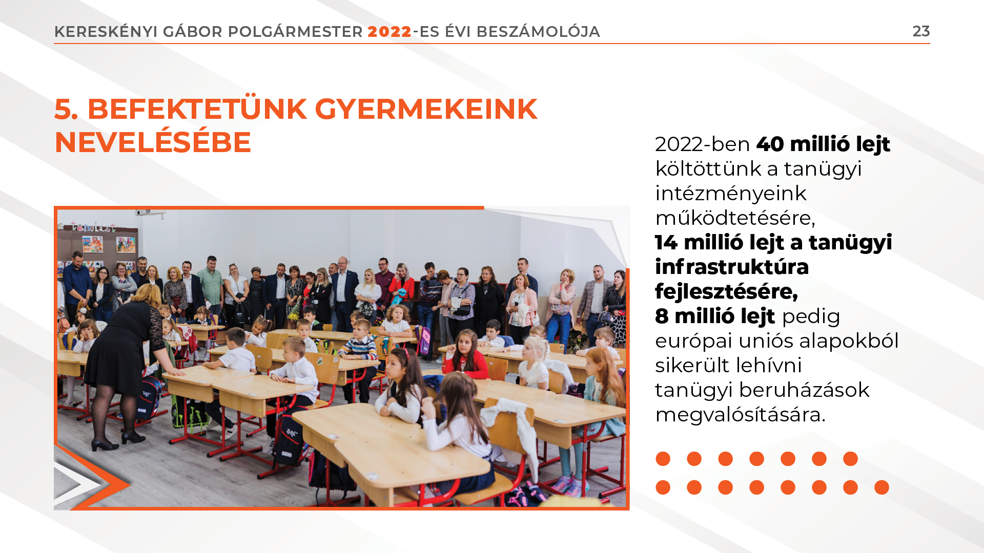 2022-ben 40 millió lejt költöttünk a tanügyi intézményeink működtetésére, 14 millió lejt a tanügyi infrastruktúra fejlesztésére, 8 millió lejt pedig európai uniós alapokból sikerült lehívni tanügyi beruházások megvalósítására. Helyi költségvetésből finanszírozzuk a Tehetséggondozó Központ kialakítását és a Rákóczi Ferenc Általános Iskola új szárnyának az építését. A 9 működő bölcsődében jelenleg 420 gyermek tölti a mindennapjait.