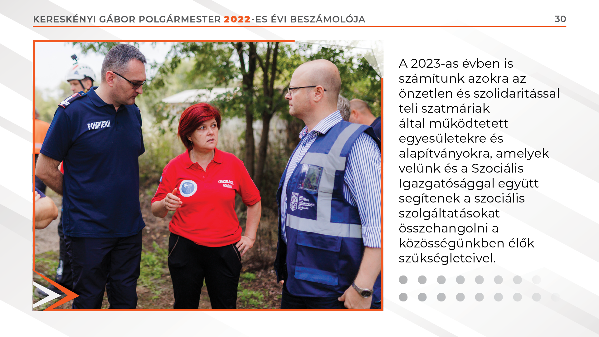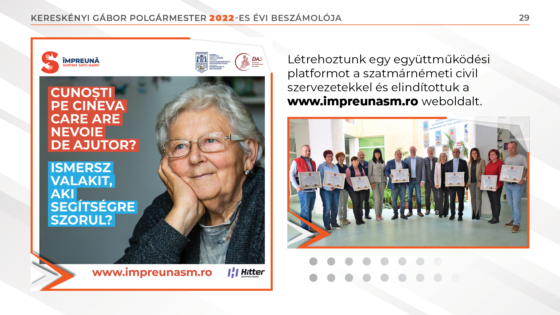 Az orosz–ukrán háború kitörését követően a Szociális Igazgatóság révén és a civil szervezetekkel összefogva azonnal kárpátaljai testvérvárosaink segítségére siettünk. Több mint 500 tonna élelmiszercsomagot, valamint 150 ezer euró összértékű, vészhelyzet esetén szükséges technikai eszközöket – áramfejlesztők, ivóvízhálózat működtetéséhez szükséges alkatrészek, stb. – szállítottunk Beregszásznak és Ungvárnak. Létrehoztunk egy együttműködési platformot a szatmárnémeti civil szervezetekkel és elindítottuk a www.impreunasm.ro weboldalt.