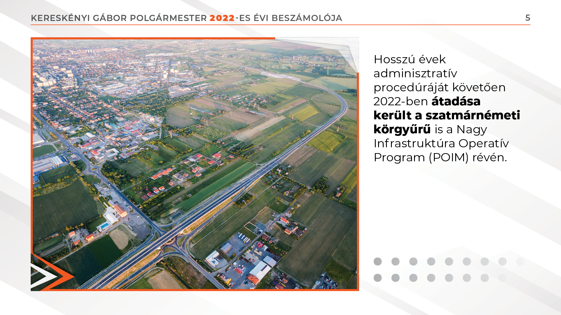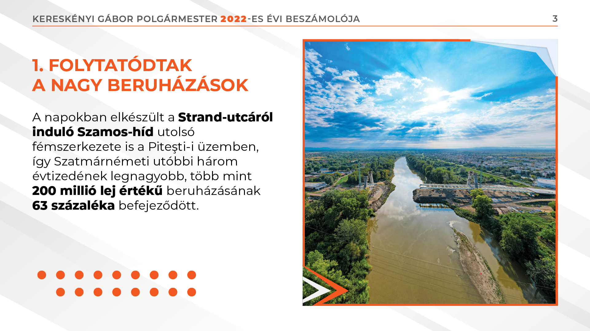 A napokban elkészült a Strand-utcáról induló Szamos-híd utolsó fémszerkezete is a Piteşti-i üzemben, így Szatmárnémeti utóbbi három évtizedének legnagyobb, több mint 200 millió lej értékű beruházásának 63 százaléka befejeződött. Hosszú évek adminisztratív procedúráját követően 2022-ben átadása került a szatmárnémeti körgyűrű is a Nagy Infrastruktúra Operatív Program (POIM) révén.