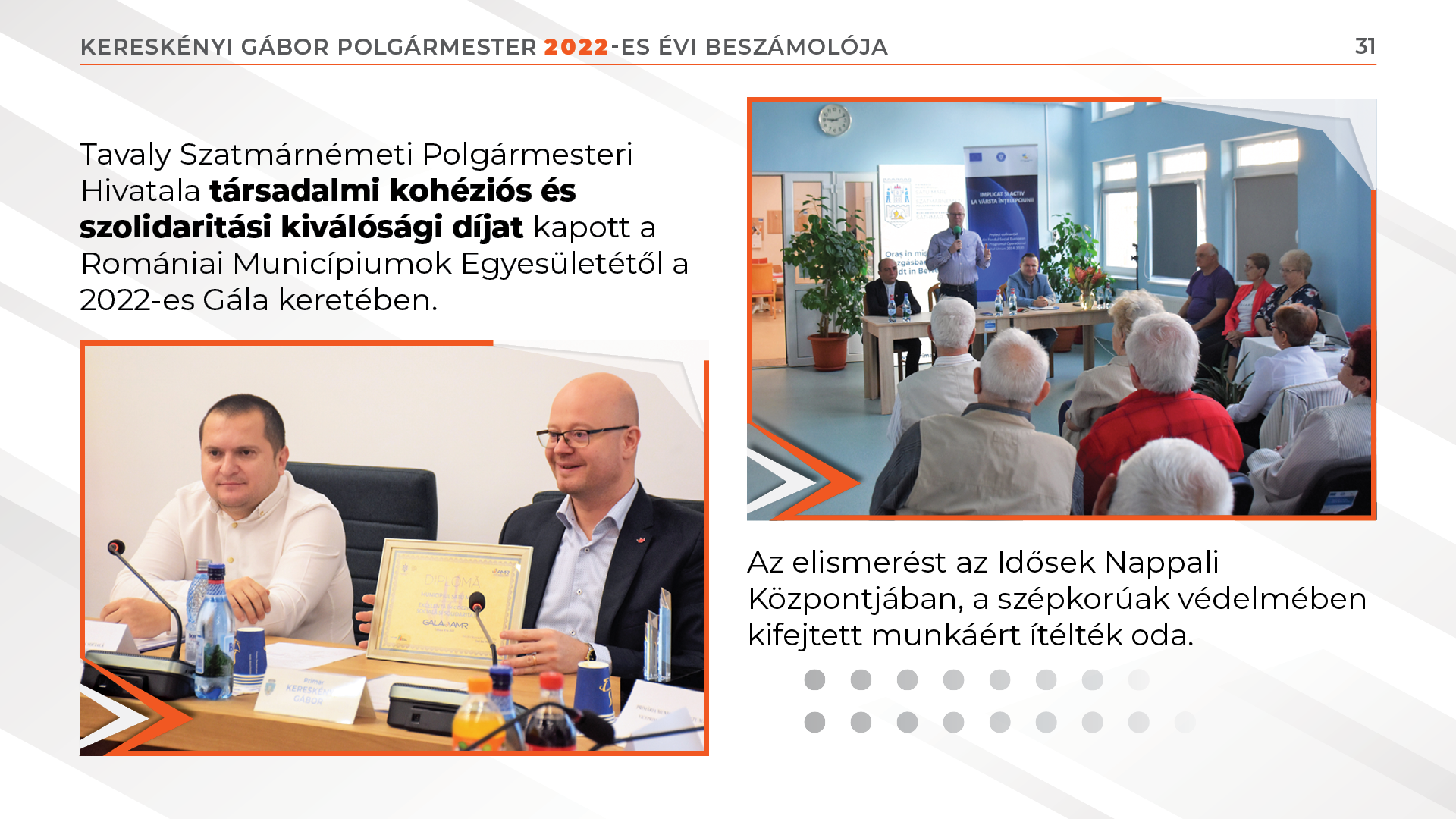 Tavaly Szatmárnémeti Polgármesteri Hivatala társadalmi kohéziós és szolidaritási kiválósági díjat kapott a Romániai Municípiumok Egyesületétől a 2022-es Gála keretében.