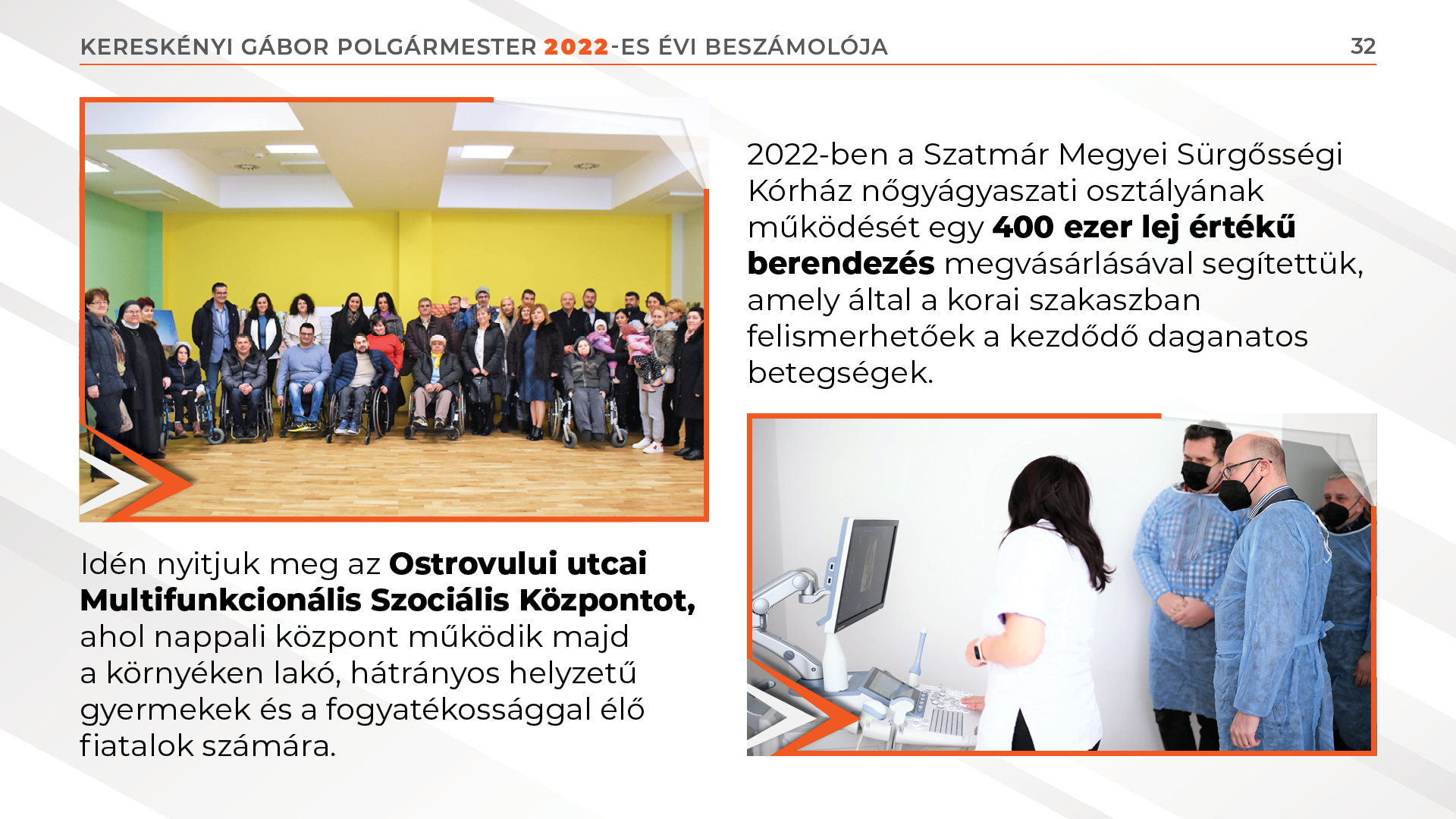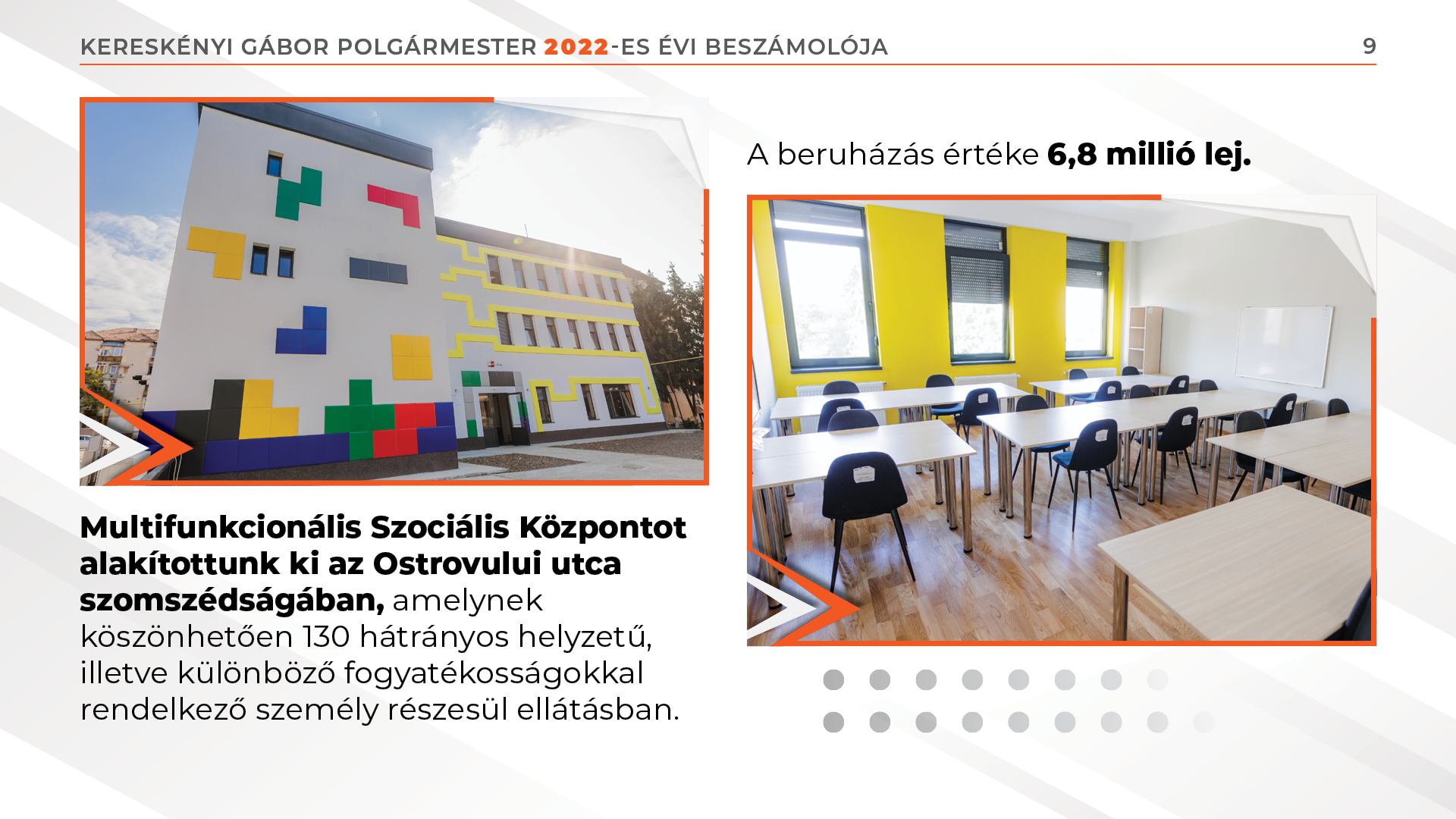 Multifunkcionális Szociális Központot alakítottunk ki az Ostrovului utca szomszédságában, amelynek köszönhetően 130 hátrányos helyzetű, illetve különböző fogyatékosságokkal rendelkező személy részesül ellátásban.