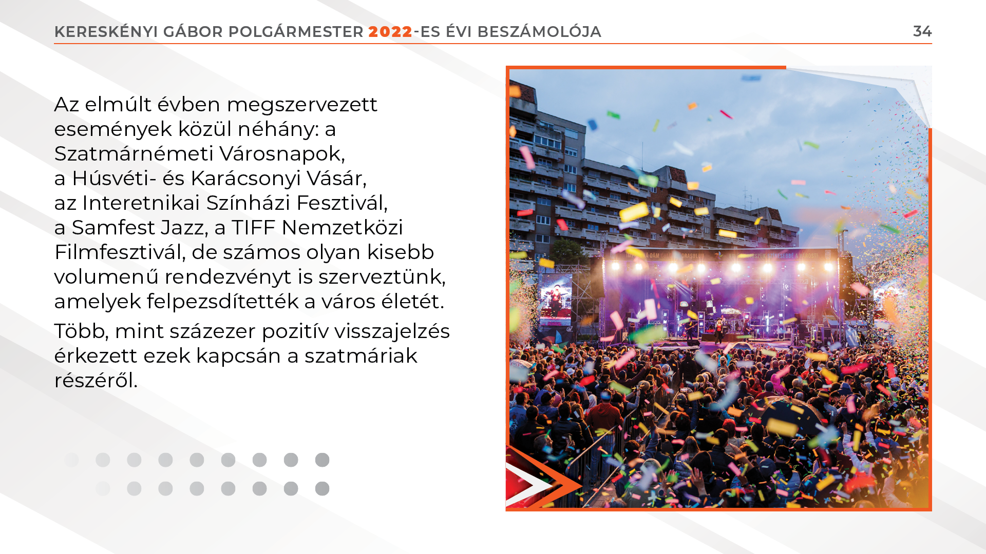 a Húsvéti- és Karácsonyi Vásár, az Interetnikai Színházi Fesztivál, a Samfest Jazz, a TIFF Nemzetközi Filmfesztivál, de számos olyan kisebb volumenű rendezvényt is szerveztünk, amelyek felpezsdítették a város életét.