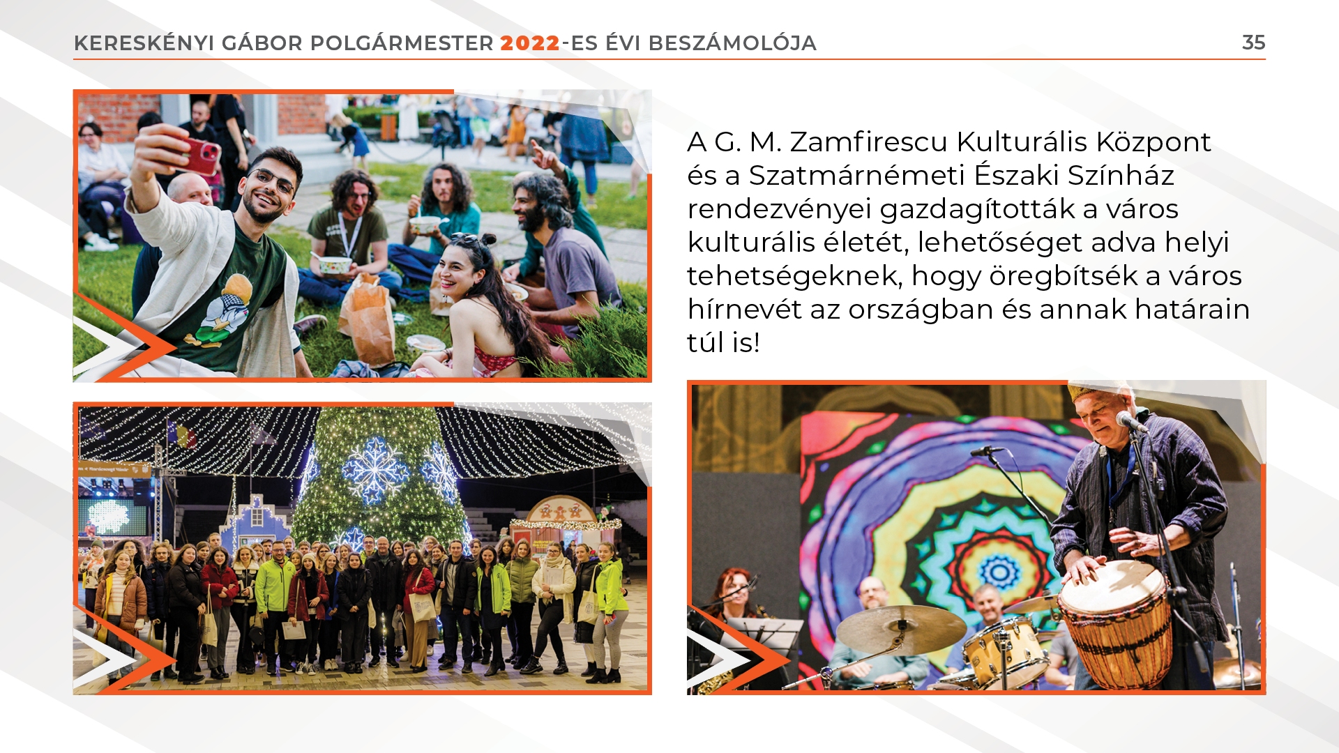 Több, mint százezer pozitív visszajelzés érkezett ezek kapcsán a szatmáriak részéről. A G. M. Zamfirescu Kulturális Központ és a Szatmárnémeti Északi Színház rendezvényei gazdagították a város kulturális életét, lehetőséget adva helyi tehetségeknek, hogy öregbítsék a város hírnevét az országban és annak határain túl is!