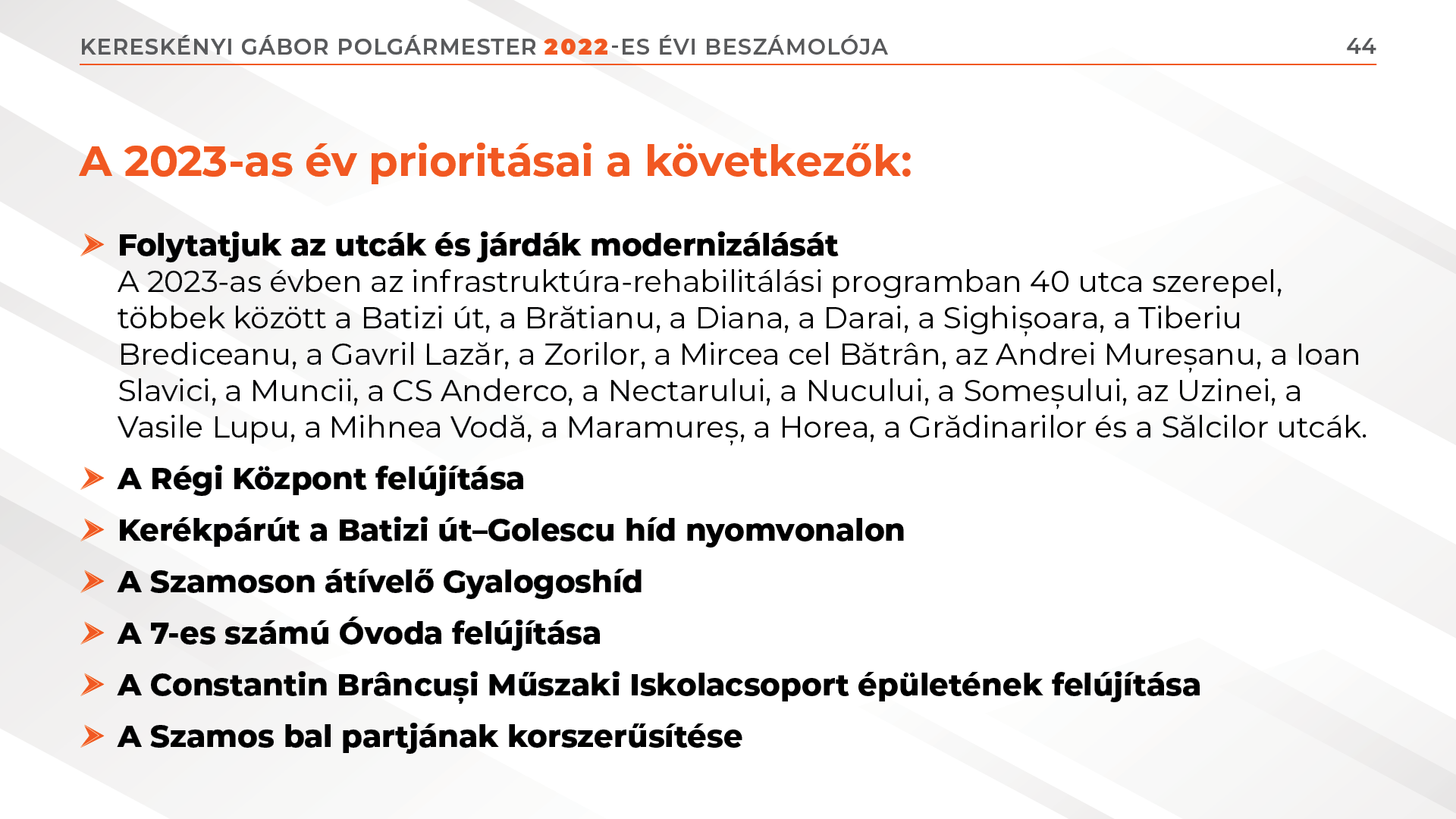 A 2023-as évben az infrastruktúra-rehabilitálási programban 40 utca szerepel, többek között a Batizi út, a Brătianu, a Diana, a Darai, a Sighișoara, a Tiberiu Brediceanu, a Gavril Lazăr, a Zorilor, a Mircea cel Bătrân, az Andrei Mureșanu, a Ioan Slavici, a Muncii, a CS Anderco, a Nectarului, a Nucului, a Someșului, az Uzinei, a Vasile Lupu, a Mihnea Vodă, a Maramureș, a Horea, a Grădinarilor és a Sălcilor utcák.