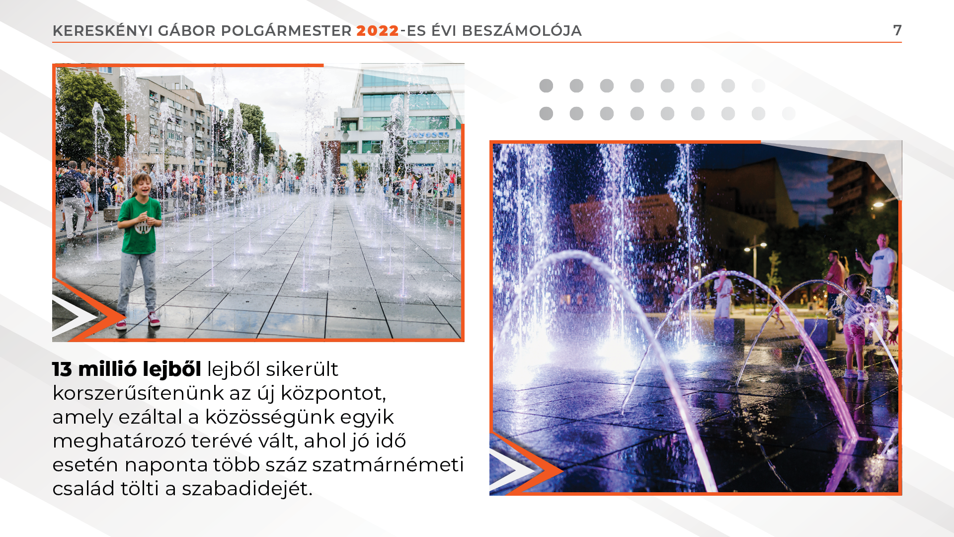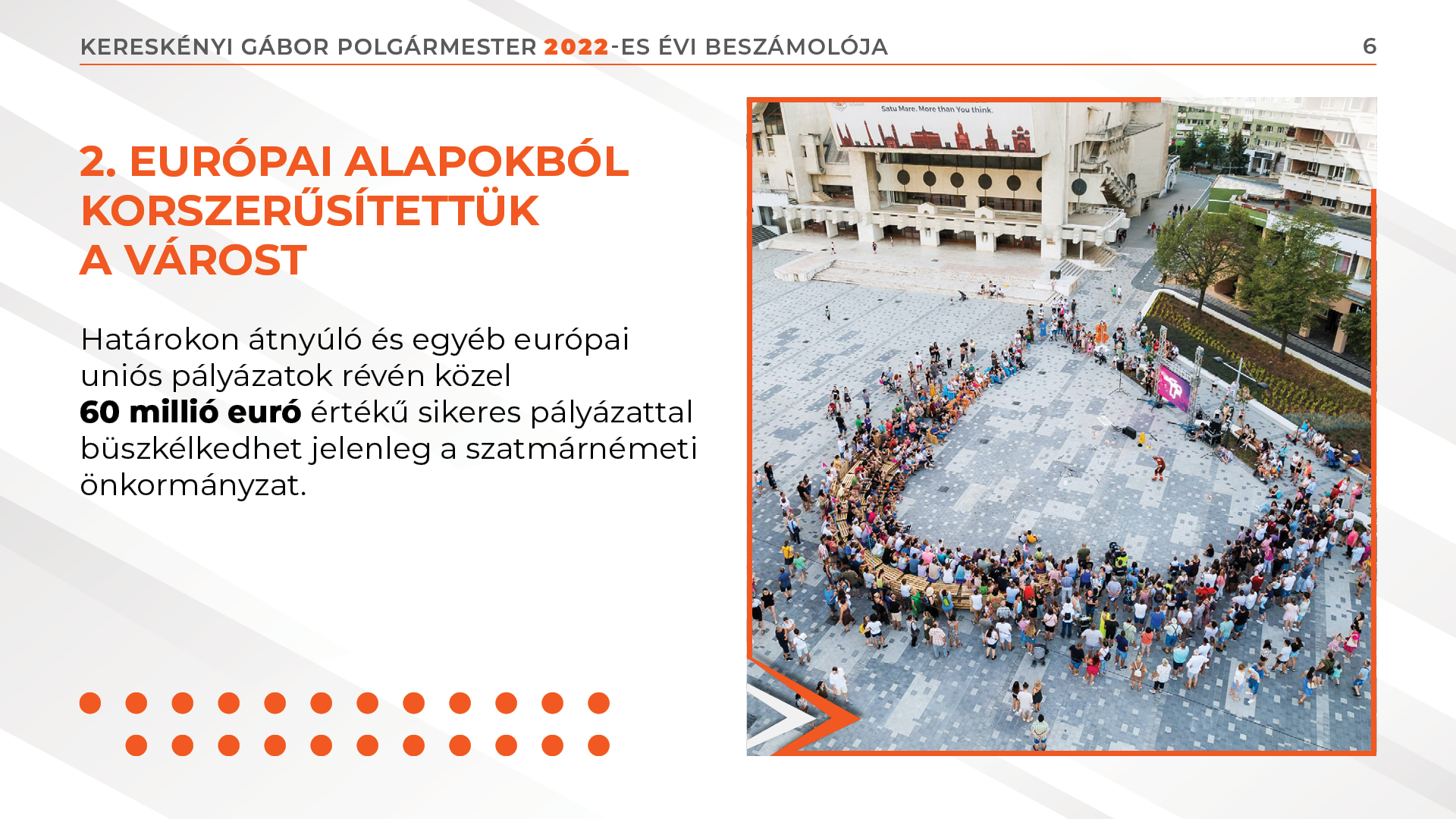 Határokon átnyúló és egyéb európai uniós pályázatok révén közel 60 millió euró értékű sikeres pályázattal büszkélkedhet jelenleg a szatmárnémeti önkormányzat. 13 millió lejből lejből sikerült korszerűsítenünk az új központot, amely ezáltal a közösségünk egyik meghatározó terévé vált, ahol jó idő esetén naponta több száz szatmárnémeti család tölti a szabadidejét.