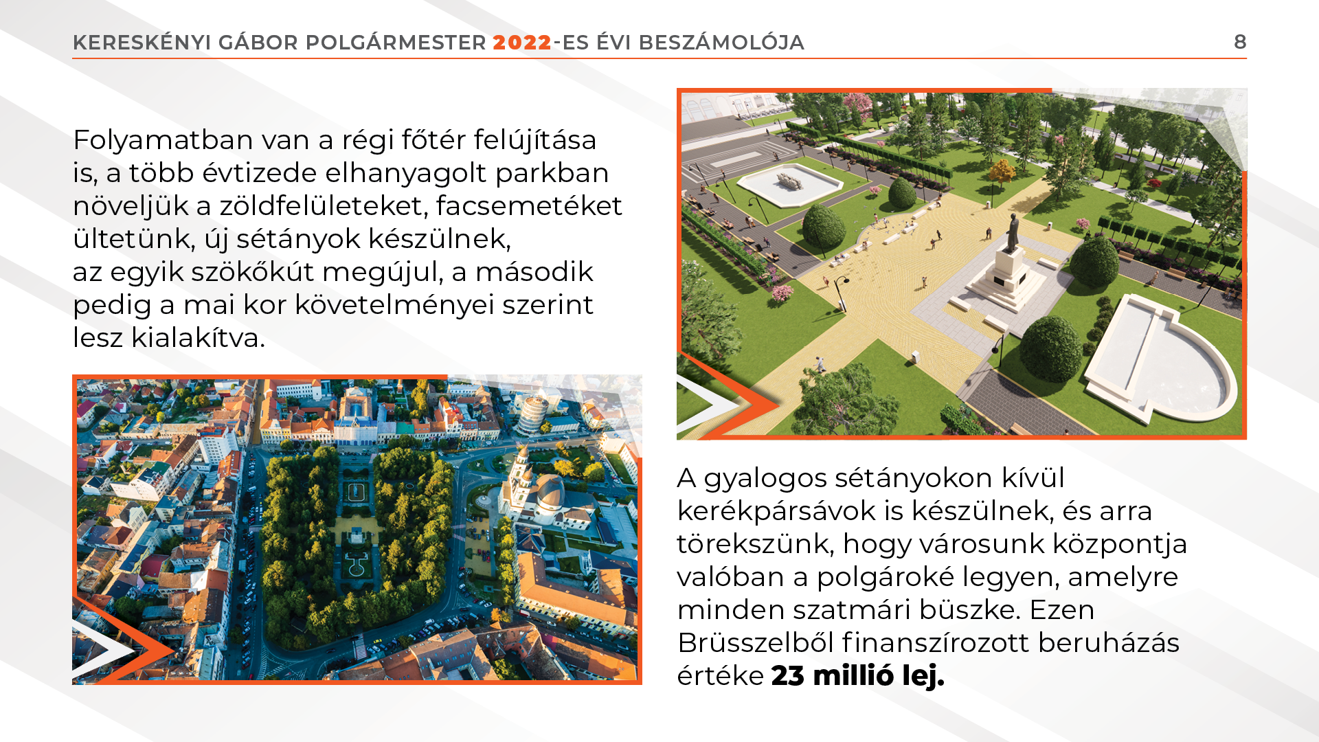 Folyamatban van a régi főtér felújítása is, a több évtizede elhanyagolt parkban növeljük a zöldfelületeket, facsemetéket ültetünk, új sétányok készülnek, az egyik szökőkút megújul, a második pedig a mai kor követelményei szerint lesz kialakítva. A gyalogos sétányokon kívül kerékpársávok is készülnek, és arra törekszünk, hogy városunk központja valóban a polgároké legyen, amelyre minden szatmári büszke. Ezen Brüsszelből finanszírozott beruházás értéke 23 millió lej.