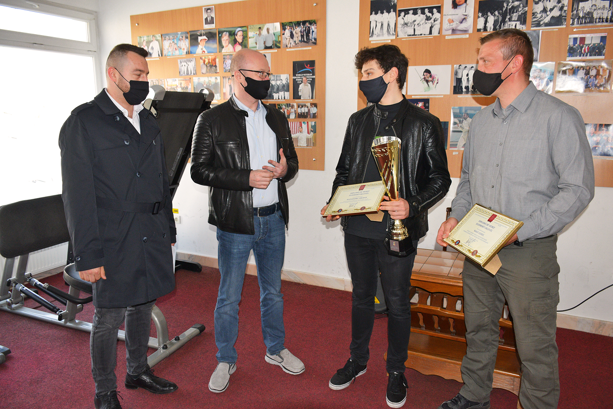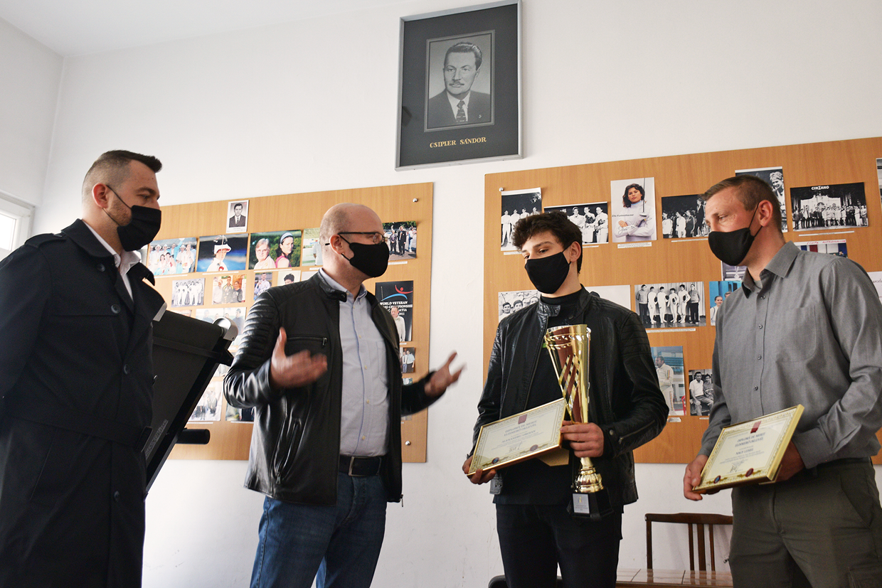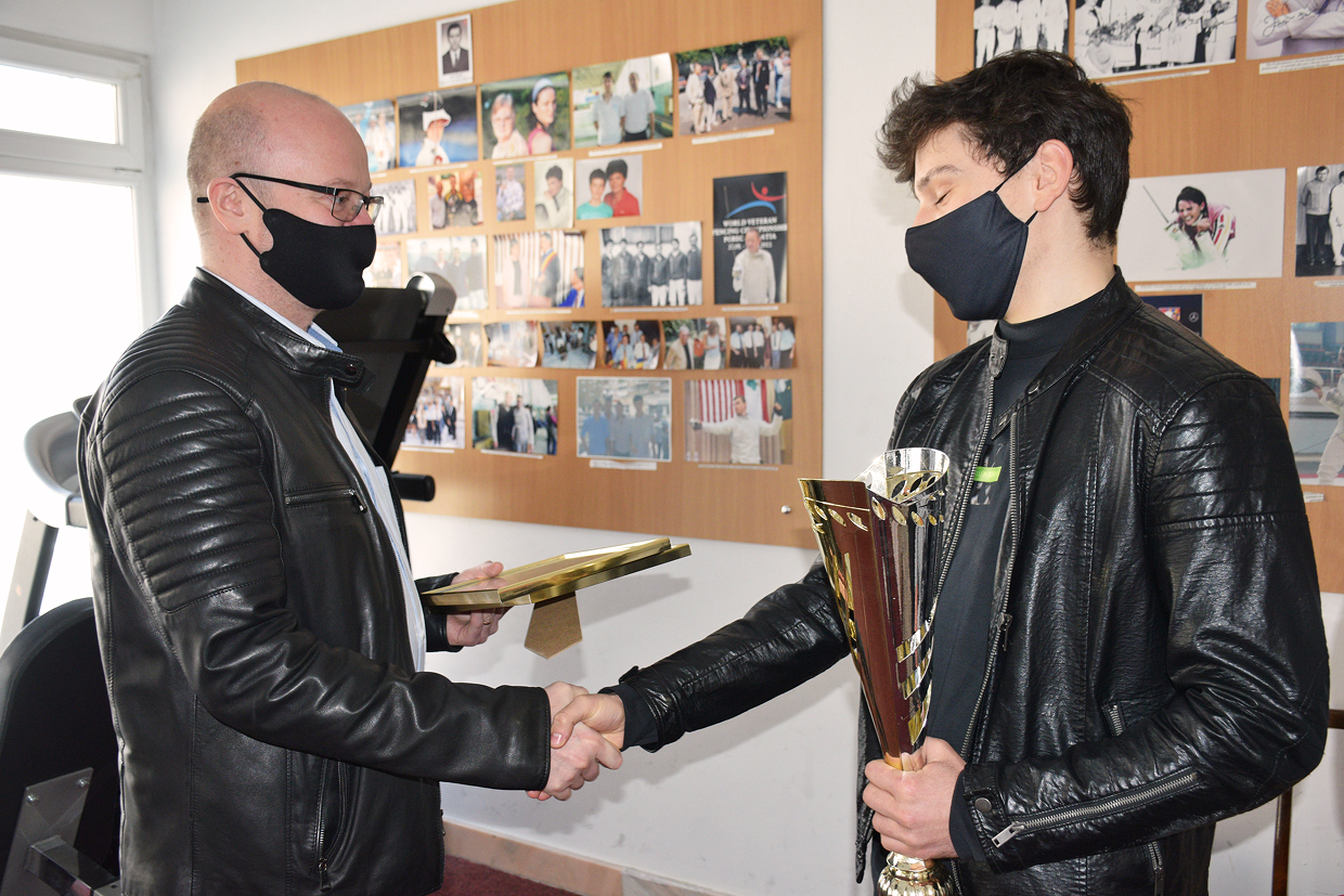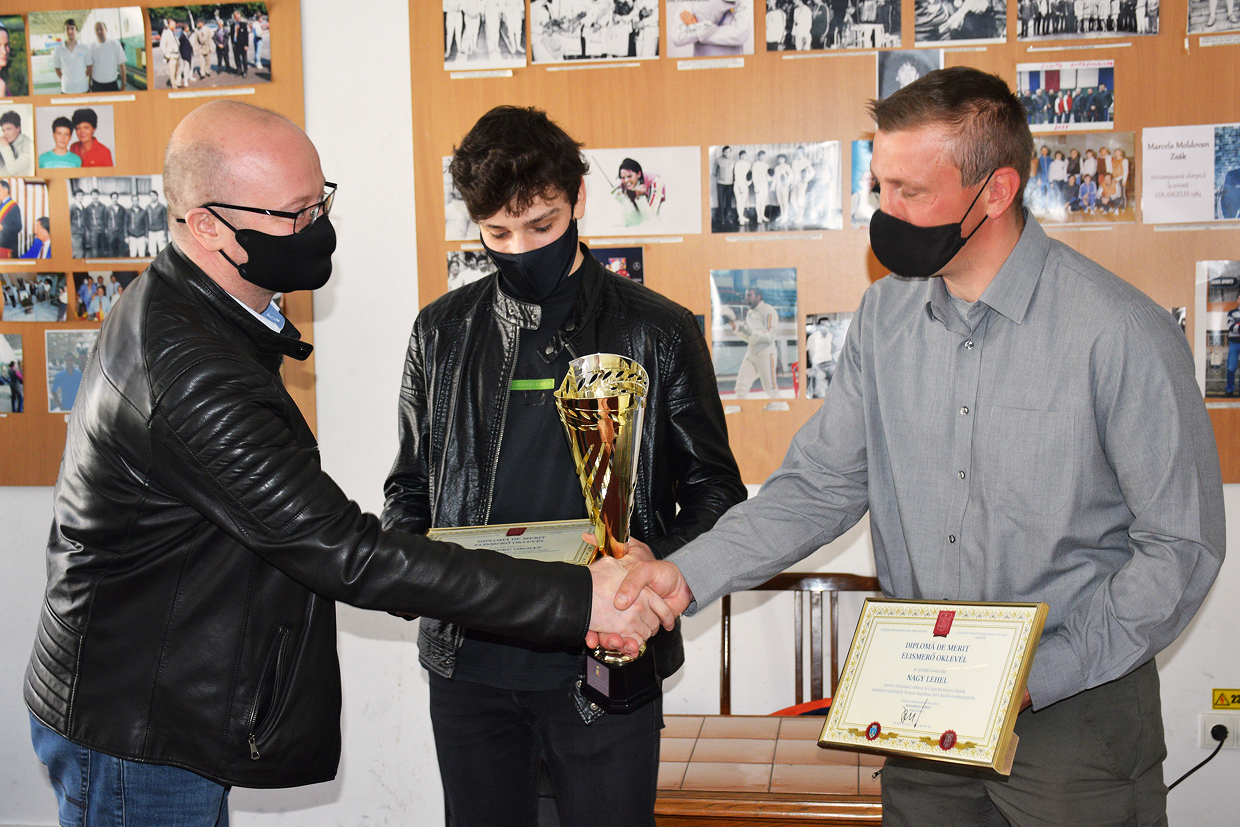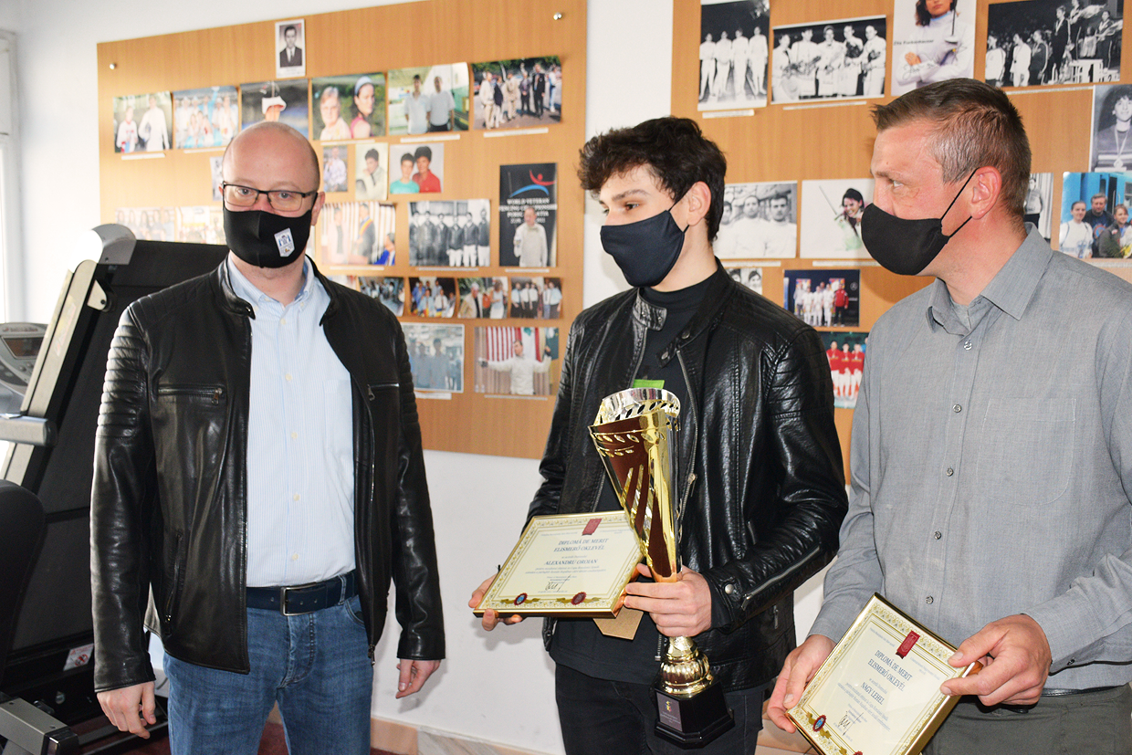 Elismerő oklevél és pénzjutalom a Román Kupa győztes párbajtőröző bajnokunknak Alex Oroian-nak és edzőjének, Nagy Lehelnek.