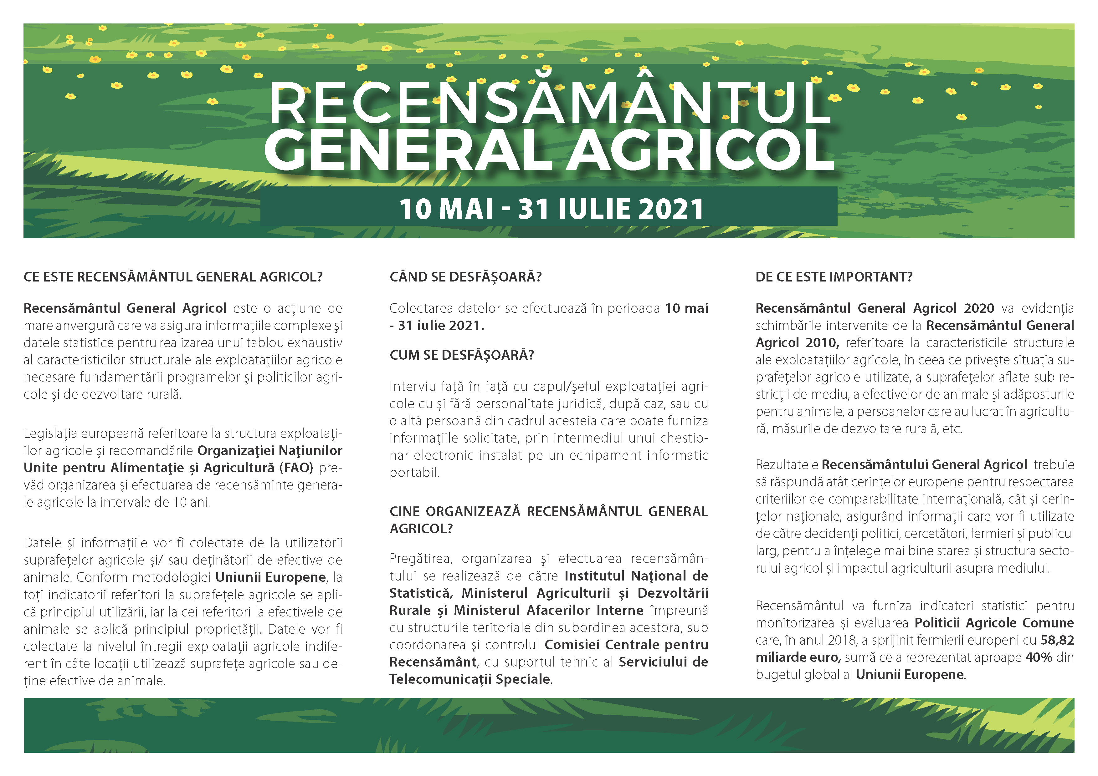 Tisztelt szatmáriak! Tájékoztatjuk Önöket, hogy május 10. és július 31. között Szatmárnémetiben is sor kerül a mezőgazdasági összeírásra, amely során a számláló biztosok minden területet és háziállatot nyilvántartásba vesznek. Az összeírás a következő időszak agrárstratégiájának és mezőgazdasági programjainak minél hatékonyabb kialakításához szükséges. A biztosok a Mezőgazdasági Igazgatóság által kibocsájtott kártyával igazolják magukat.