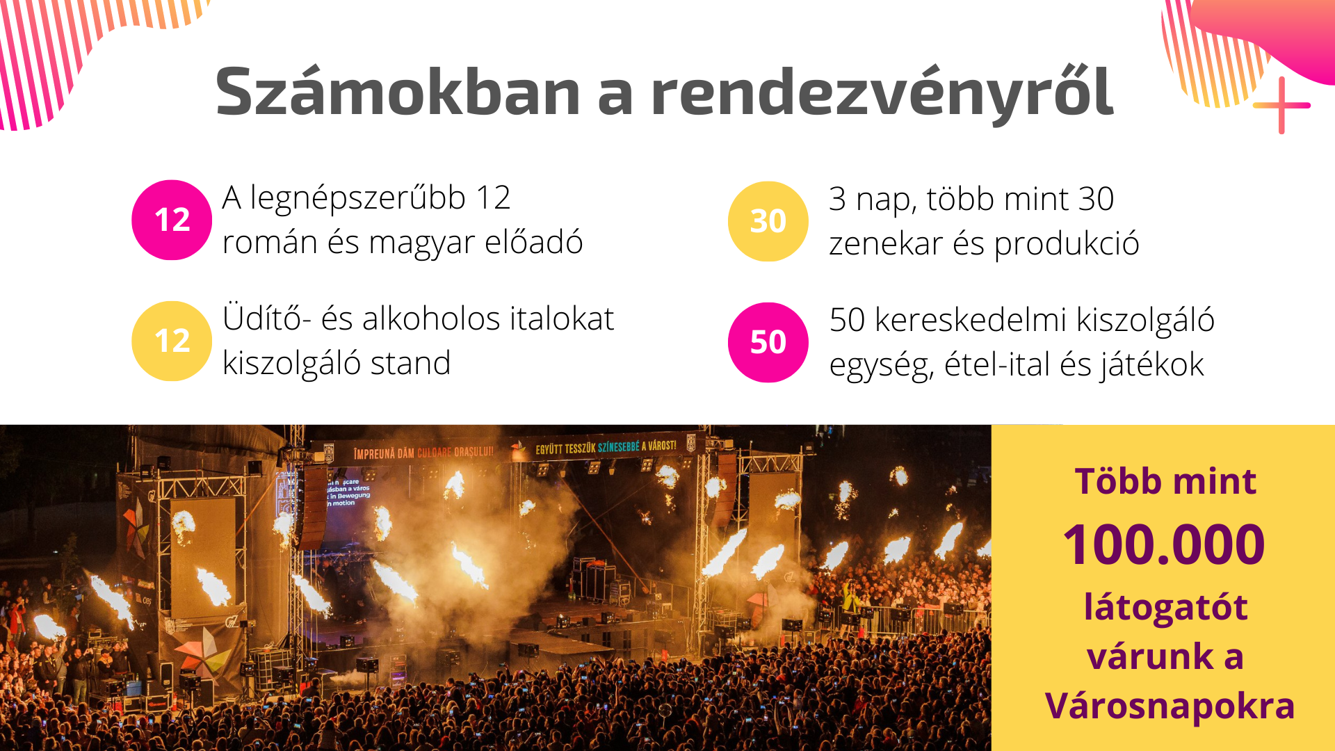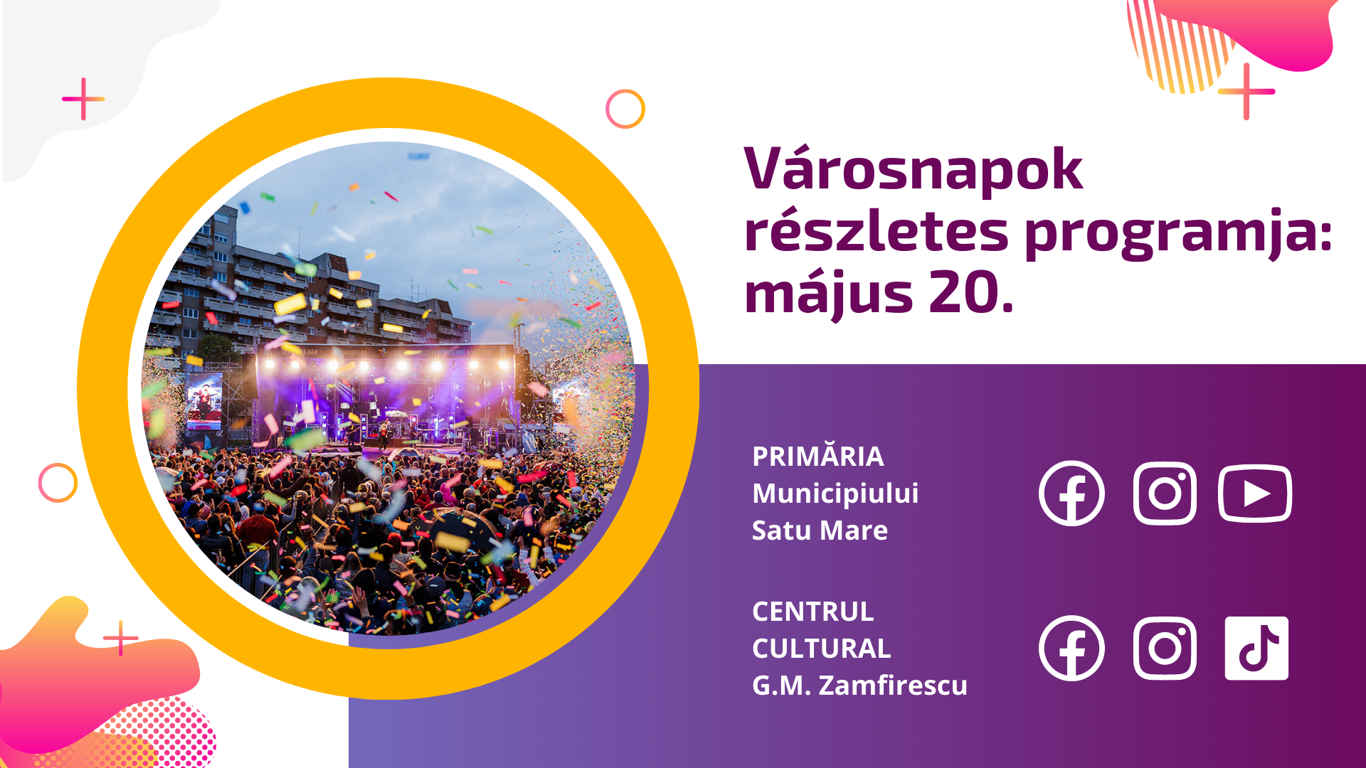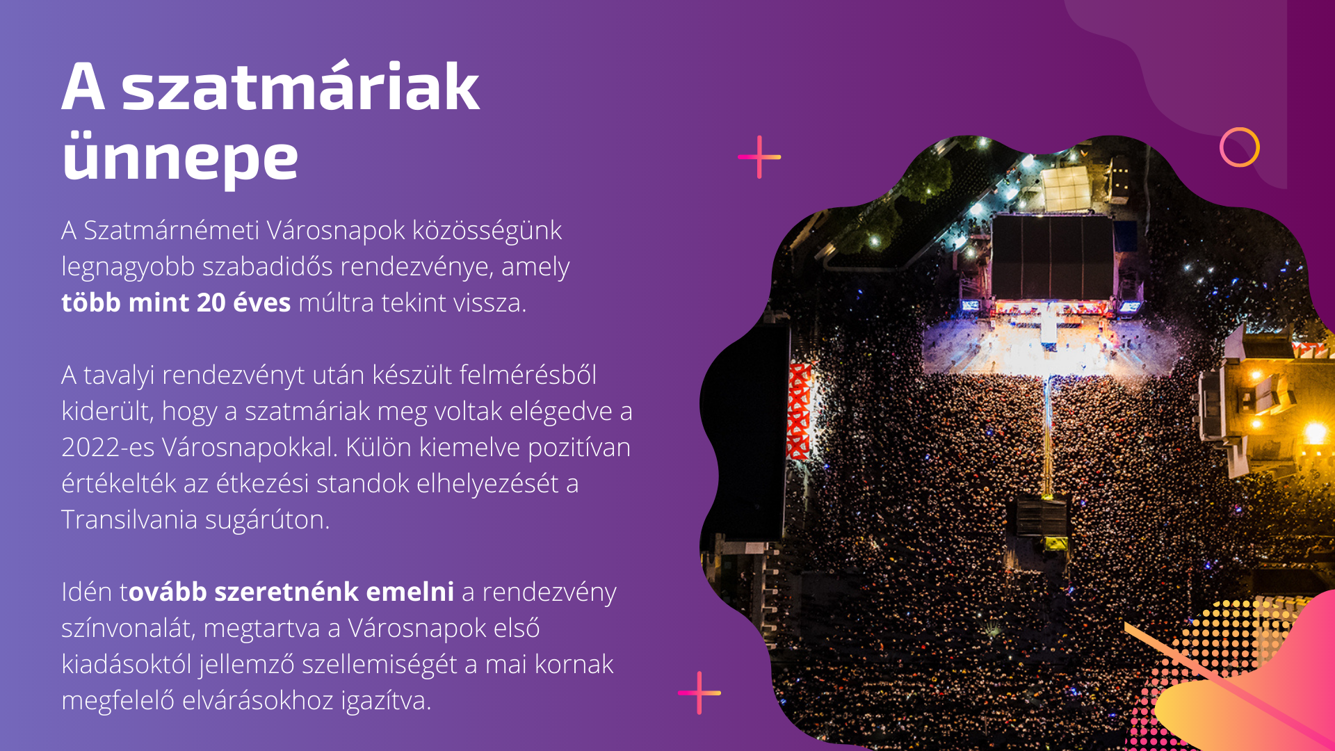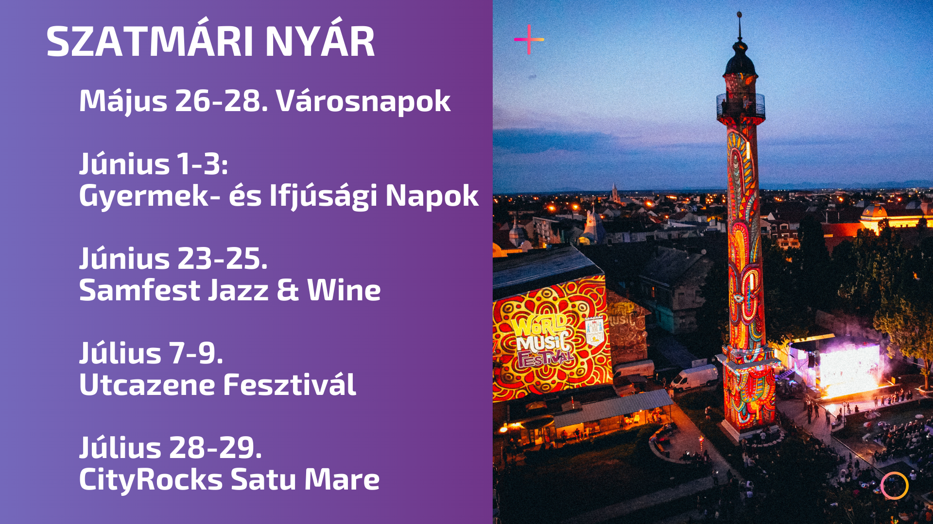 Tisztelt szatmáriak! Azon dolgozunk, hogy idén is rendkívüli szórakozást garantáljon Önöknek városunk legnagyobb ünnepsége, a Szatmárnémeti Városnapok, amely május utolsó hétvégéjén kerül megrendezésre. Már ismert a népszerű fellépők listája is! Meglepetésekkel, változatos programokkal és végül de nem utolsó sorban fantasztikus koncertekkel várunk mindenkit.