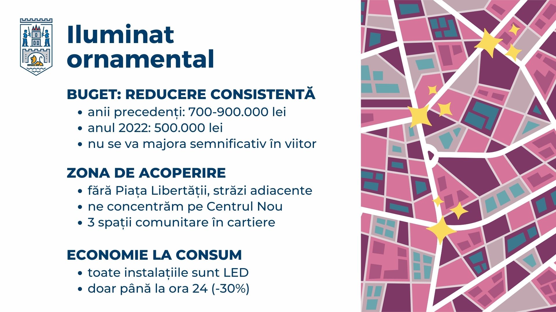 Anul acesta suma alocată este de 500.000 de lei pentru iluminatul ornamental, nicidecum 6 milioane de lei. Aceste afirmații sunt FALSE! Iluminatul de Sărbători nu este o risipă. Nu vom accepta să le fie furat sătmărenilor Crăciunul, însă am decis ca în acest an să ne concentrăm pe Centrul Nou. Vom face tot posibilul ca din bugetul alocat să creăm o atmosferă de sărbătoare, vom avea un orășel atractiv pentru copii, un trenuleț care va circula pe Pasajul Corneliu Coposu, atelierul Moșului și 25 de producători locali.