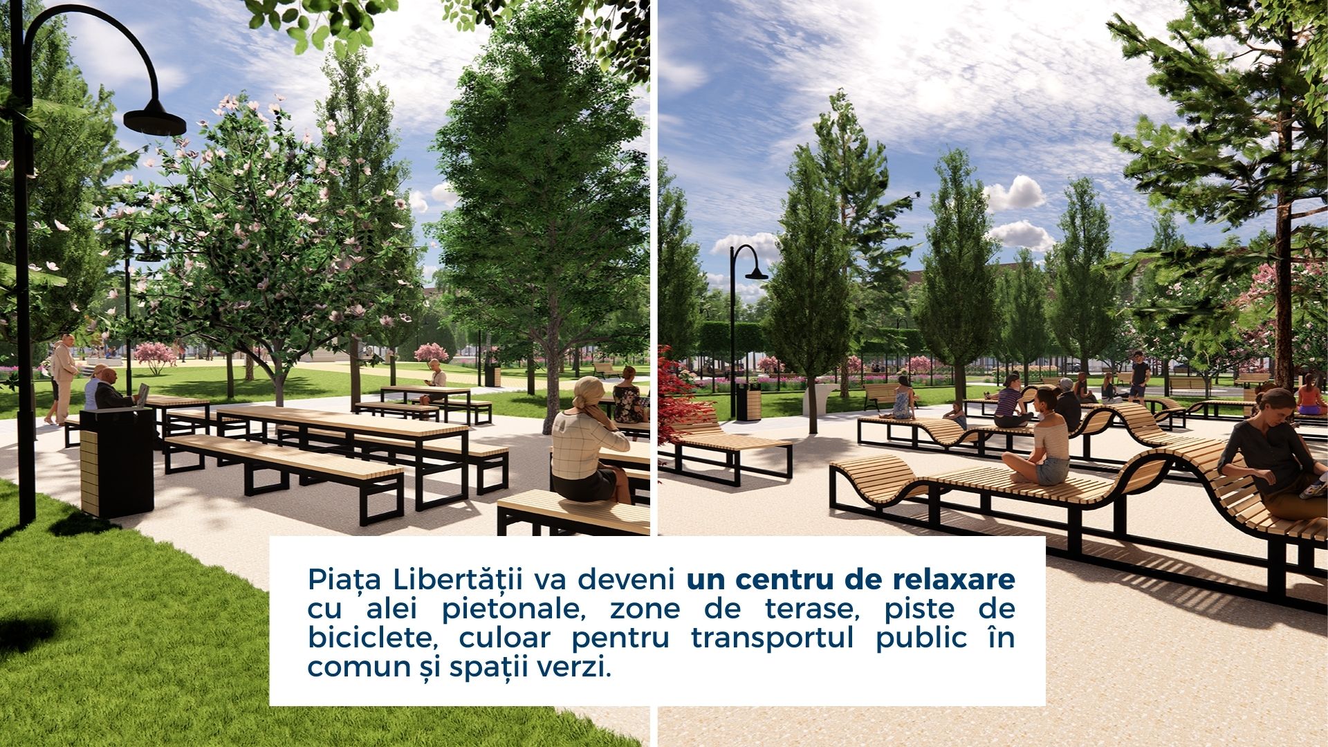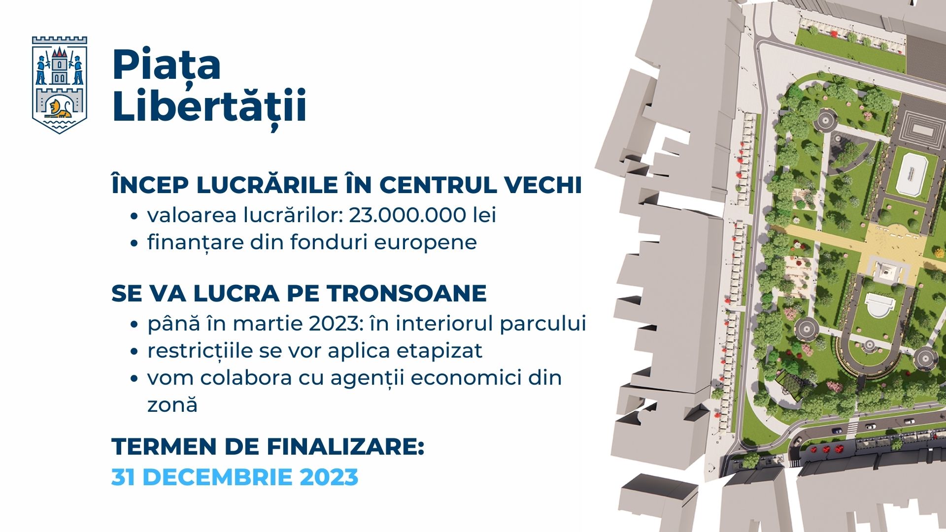 Lucrările vor începe în zona parcului, urmând ca lucrările pe tronsoanele din jurul parcului să înceapă din martie 2023. În zona parcului, suprafața de spații verzi se va mări cu o treime, iar în funcție de evoluția lucrărilor în jurul parcului, executantul și-a asumat responsabilitatea de a veni în sprijinul agenților economici pentru a efecuta etapizat lucrările, astfel încât afacerile lor să nu fie foarte afectate de restricțiile ce trebuie luate pe amplasamentul șantierului în lucru. Vor fii înlocuite reţelele electrice vechi, se vor monta stâlpi de iluminat LED, se vor reface fântânile, după care se va trece la refacerea aleilor și a trotuarelor. Piața Libertății va deveni astfel un centru de relaxare cu alei pietonale, zone de terase, piste de biciclete, culoar pentru transportul public în comun și spații verzi.