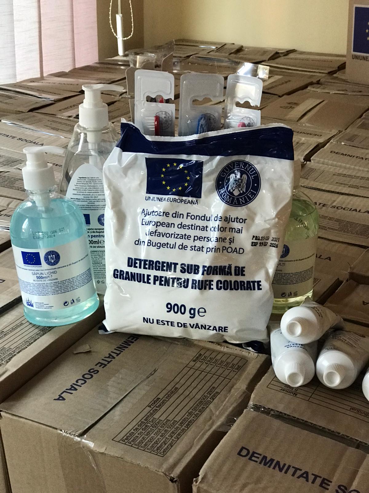 În fiecare cutie cu produse de igienă sunt 5 periuţe de dinți, 4 tuburi de pastă de dinţi, 500 ml săpun lichid, 800 ml şampon pentru copii şi 500 ml şampon pentru adulți, 900 de grame detergent pudră pentru rufe colorate şi 1.800 grame detergent pudră pentru rufe albe.