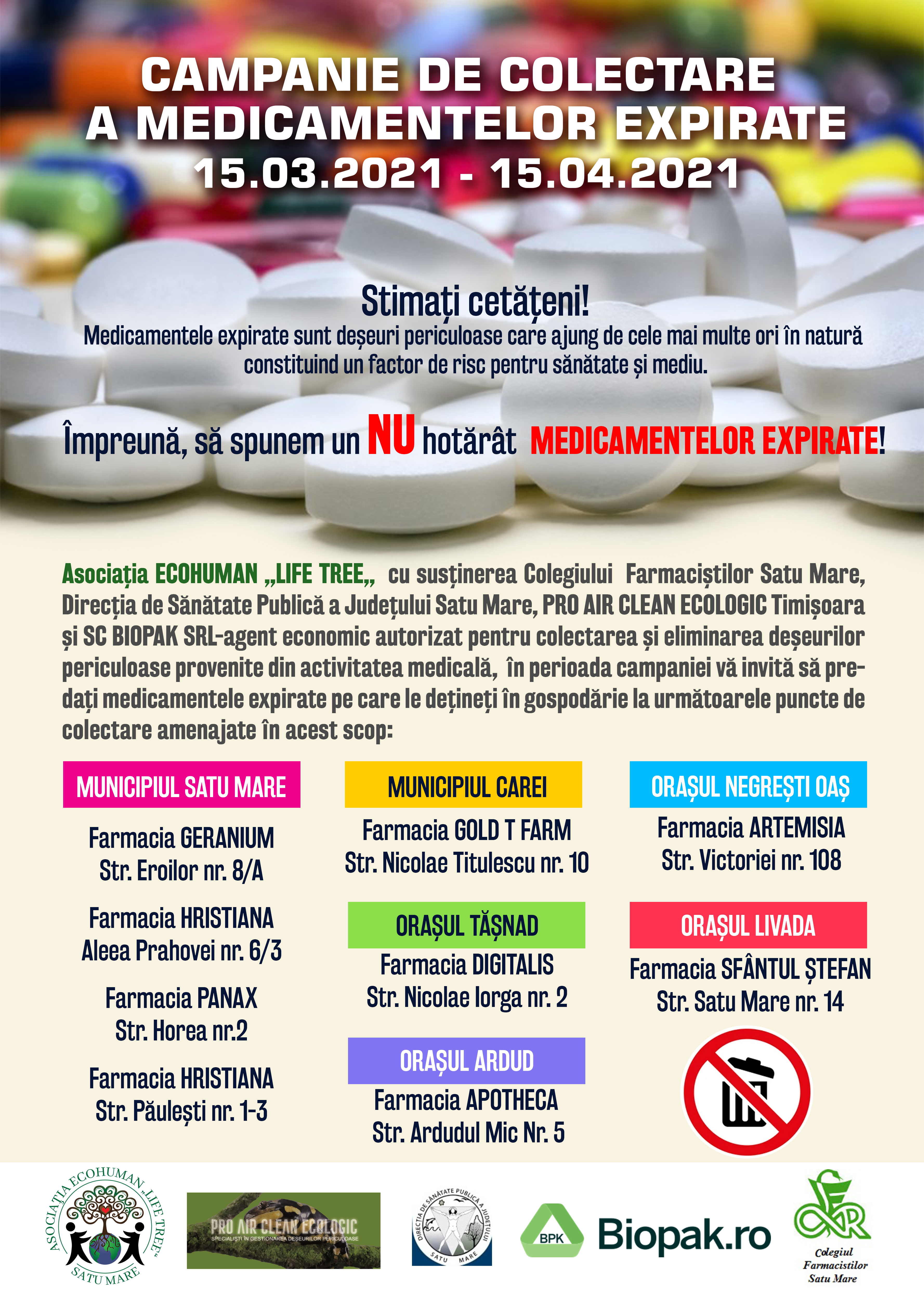 Stimați sătmăreni, în perioada 15 martie–15 aprilie 2021 vă rugăm să predați medicamentele expirate la cele patru puncte de colectare amenajate în municipiul Satu Mare.