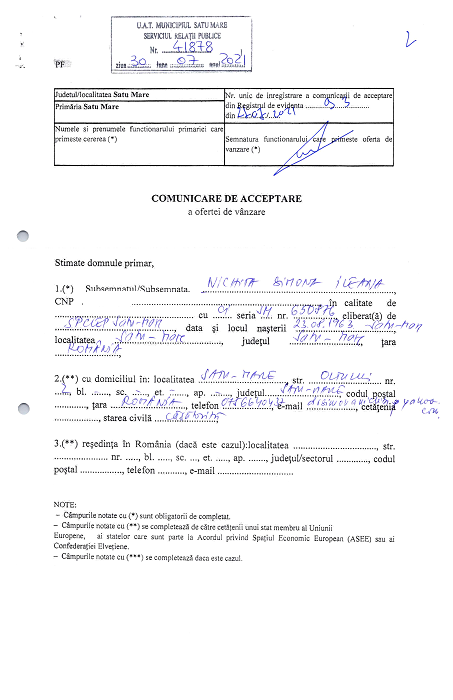 Primăria municipiului Satu Mare aduce la cunoștință publică ofertă de vânzare 93-2021-CF -166416