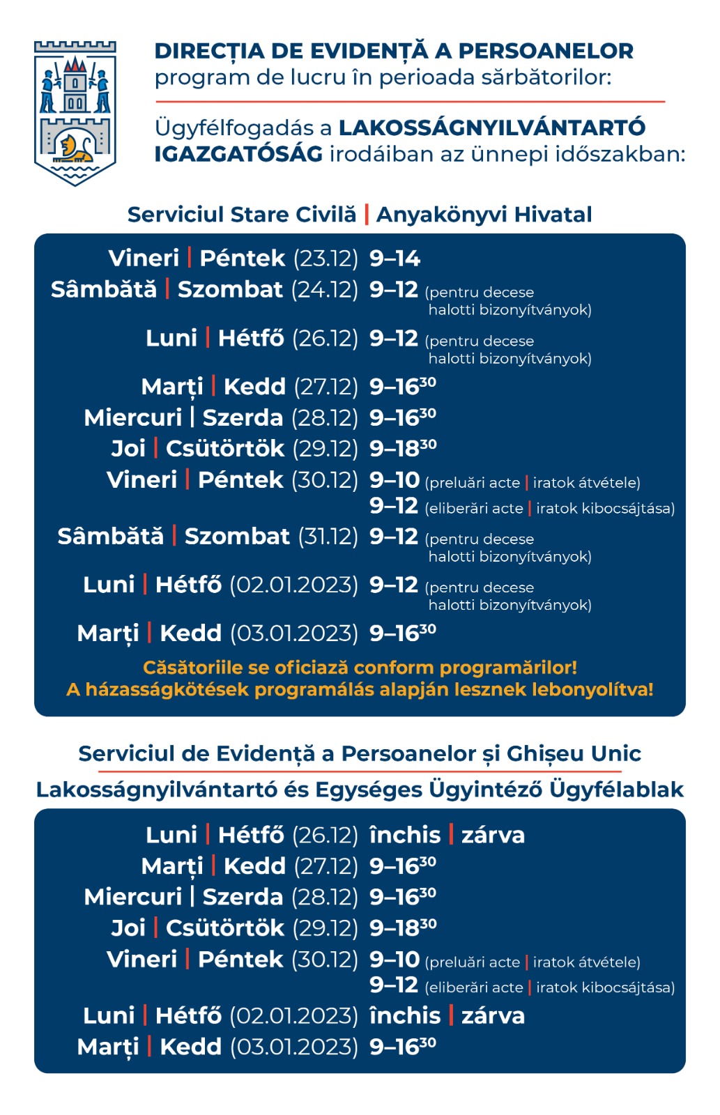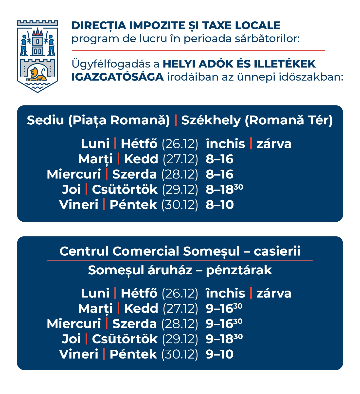 Primăria Municipiului Satu Mare anunță program special la Direcția de Evidență a Persoanelor și Ghișeu Unic și la Direcția de Impozite și Taxe Locale.