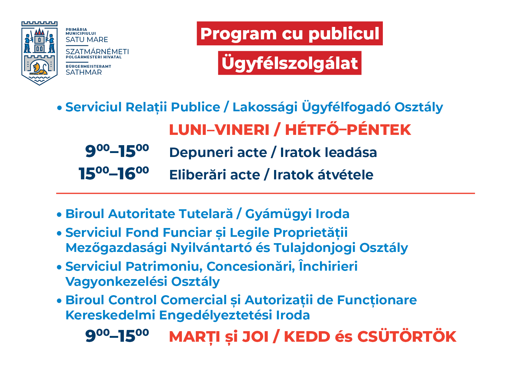 Primăria Municipiului Satu Mare vine în sprijinul cetățenilor și prelungește programul cu publicul. Astfel, pentru depunerea actelor cetățenii se pot adresa instituției de luni până vineri între orele 9.00-15.00, iar pentru eliberări acte între 15.00 -16.00.