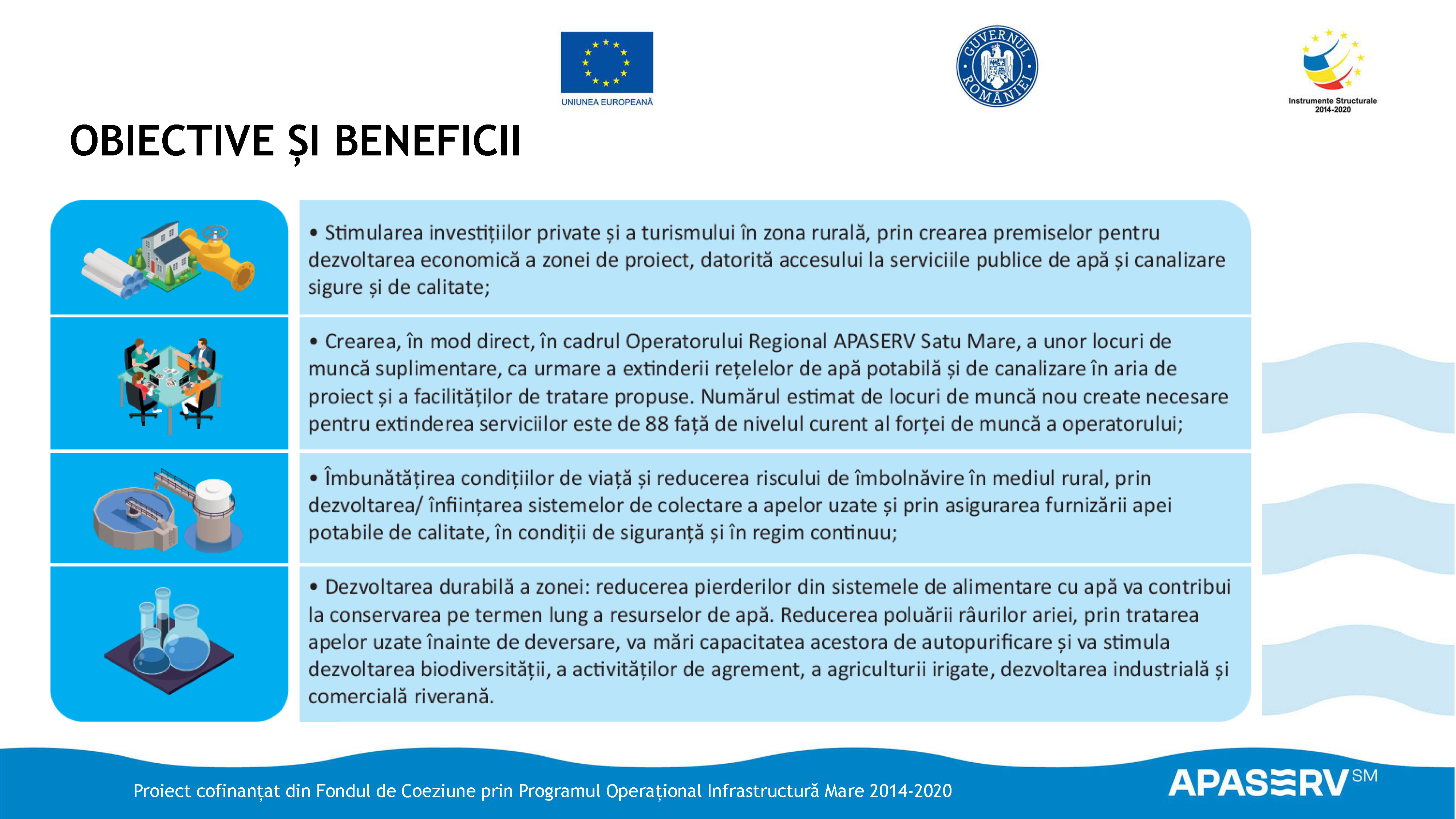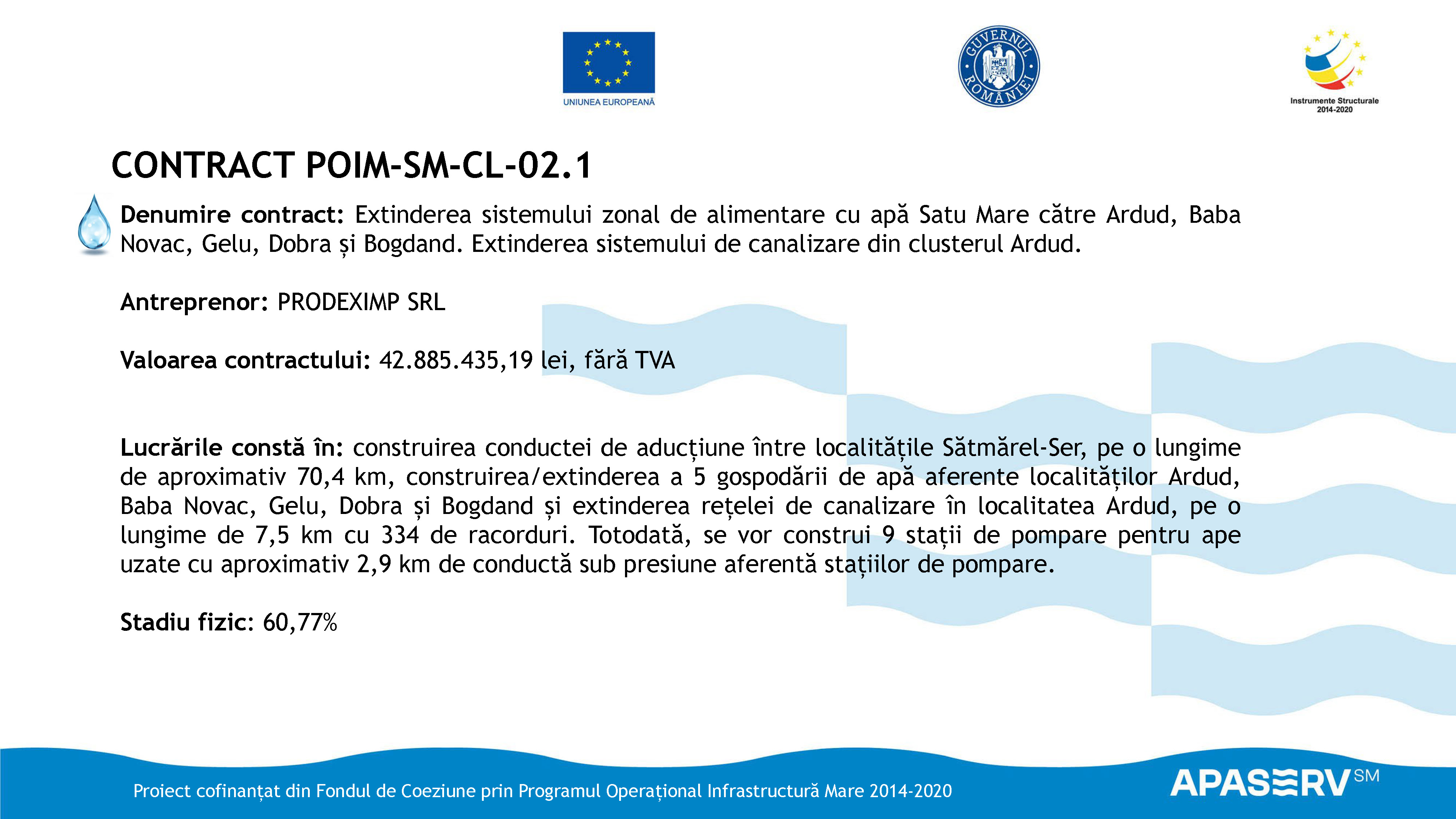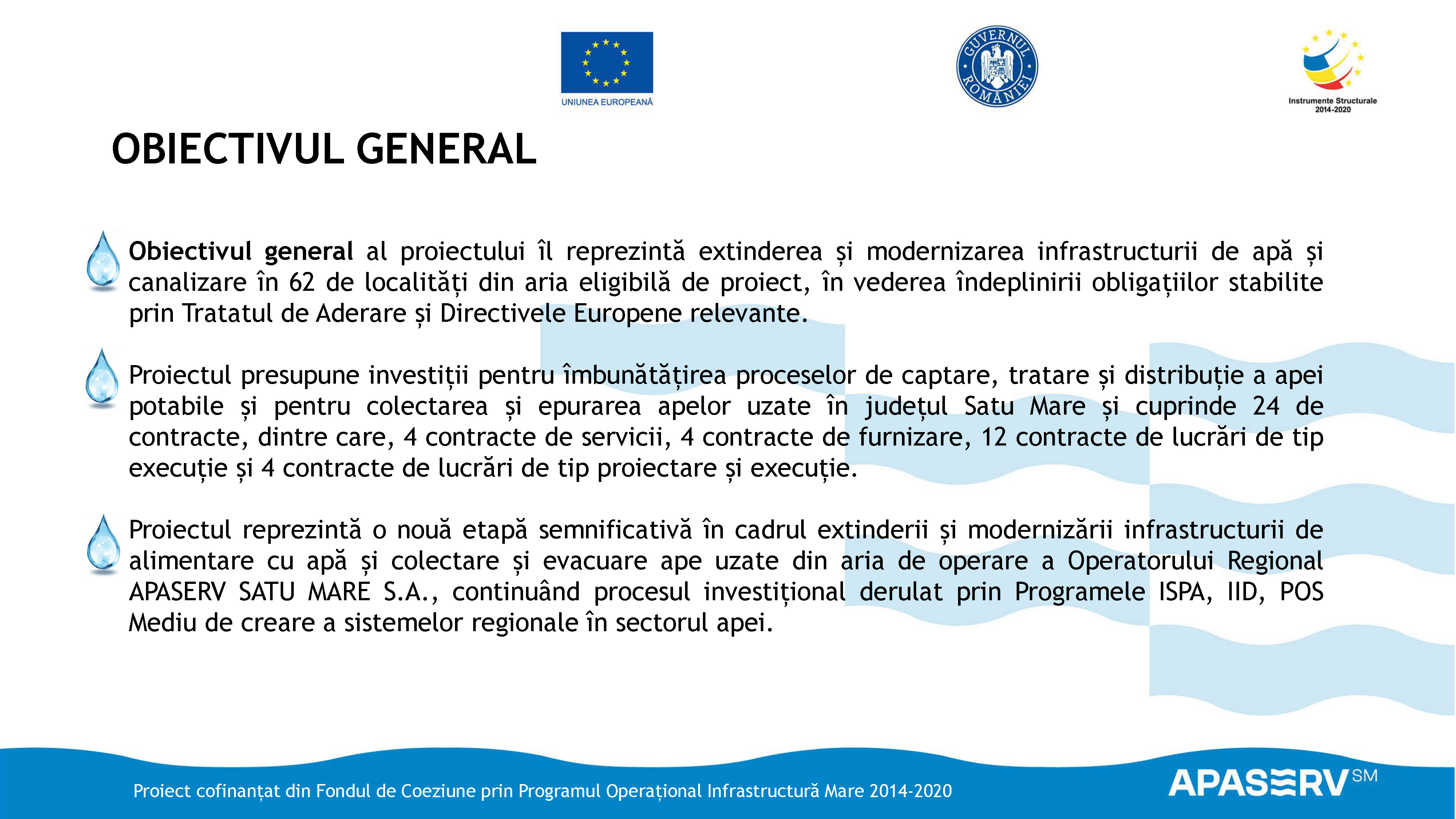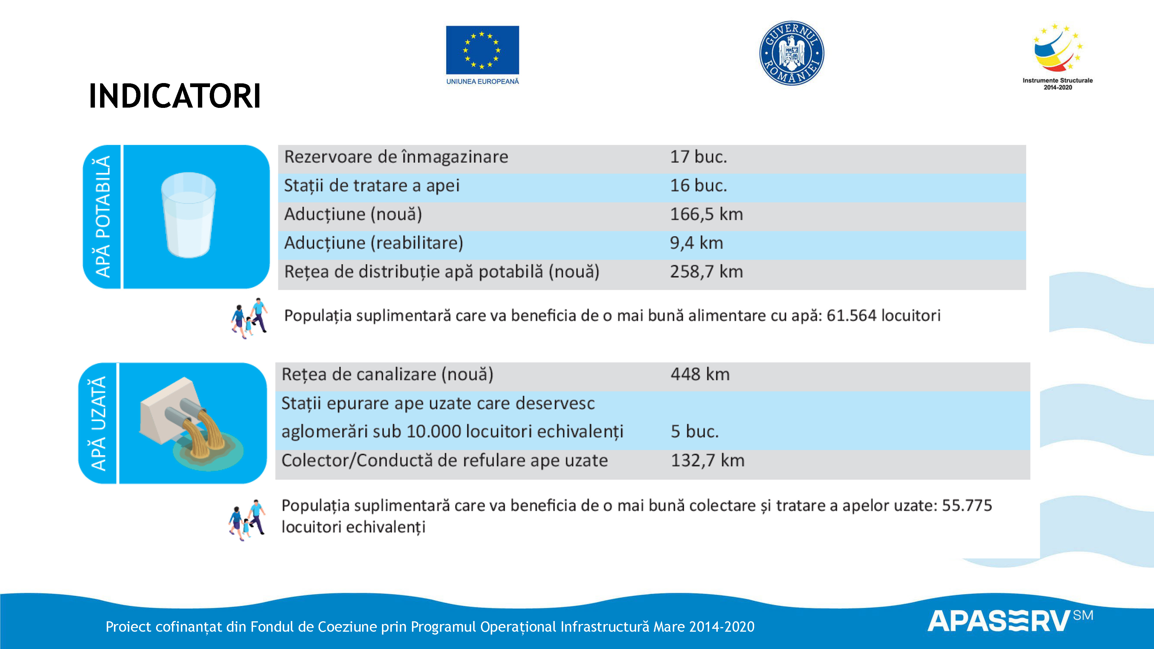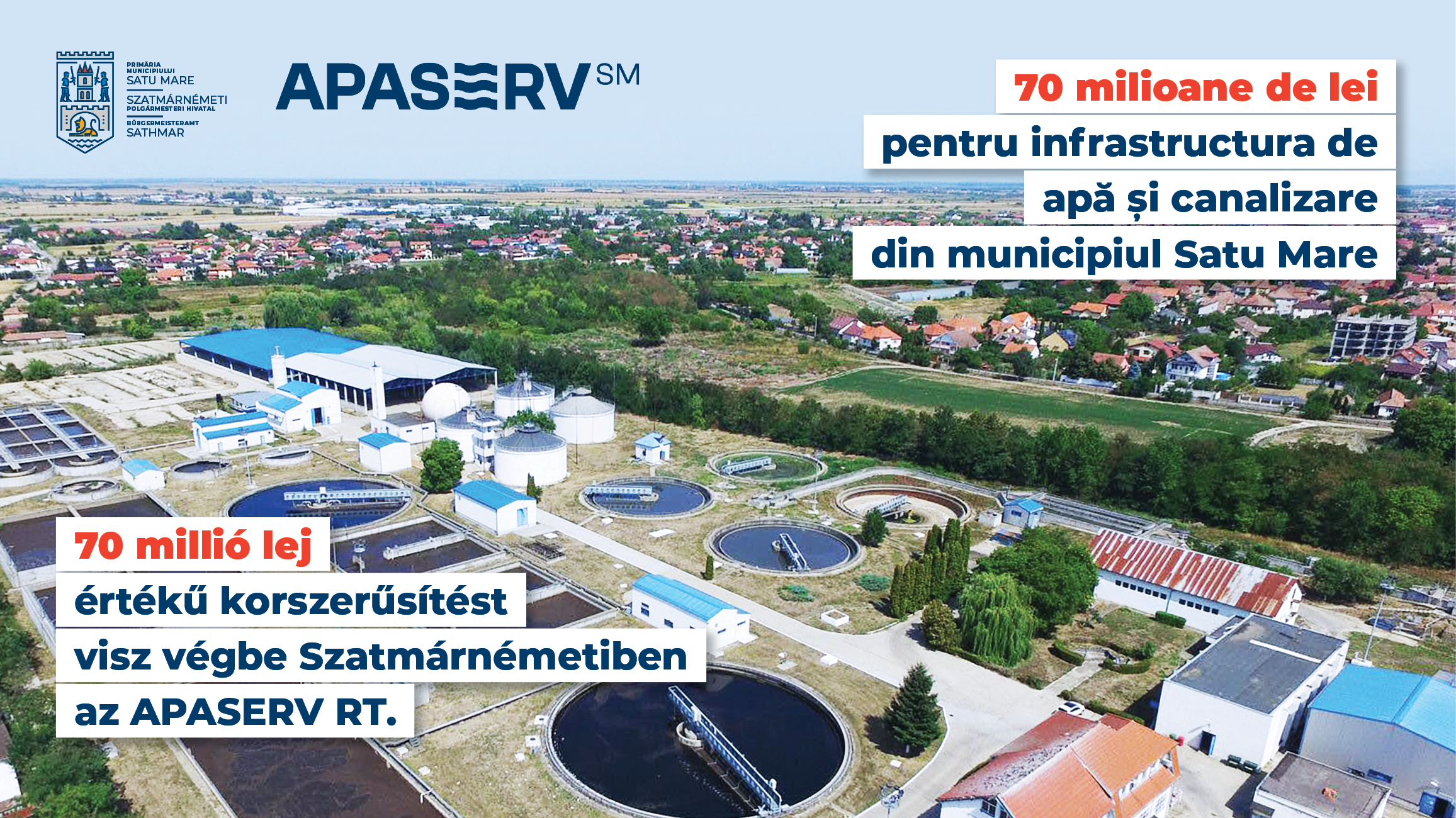 Apaserv S.A derulează cel mai mare proiect de infrastructură din județul Satu Mare. 1,2 miliarde de lei. Satu Mare va beneficia de investiții de 70 milioane de lei. Se vor realiza 16 stații de tratare a apei potabile, 166.5 km de conducte de aducțiune, 258.7 km de rețele de distribuție apă potabilă, 5 stații noi de epurare a apei uzate, 448 km de rețele de canalizare și 132.7 km de colector/conductă de refulare a apei uzate.