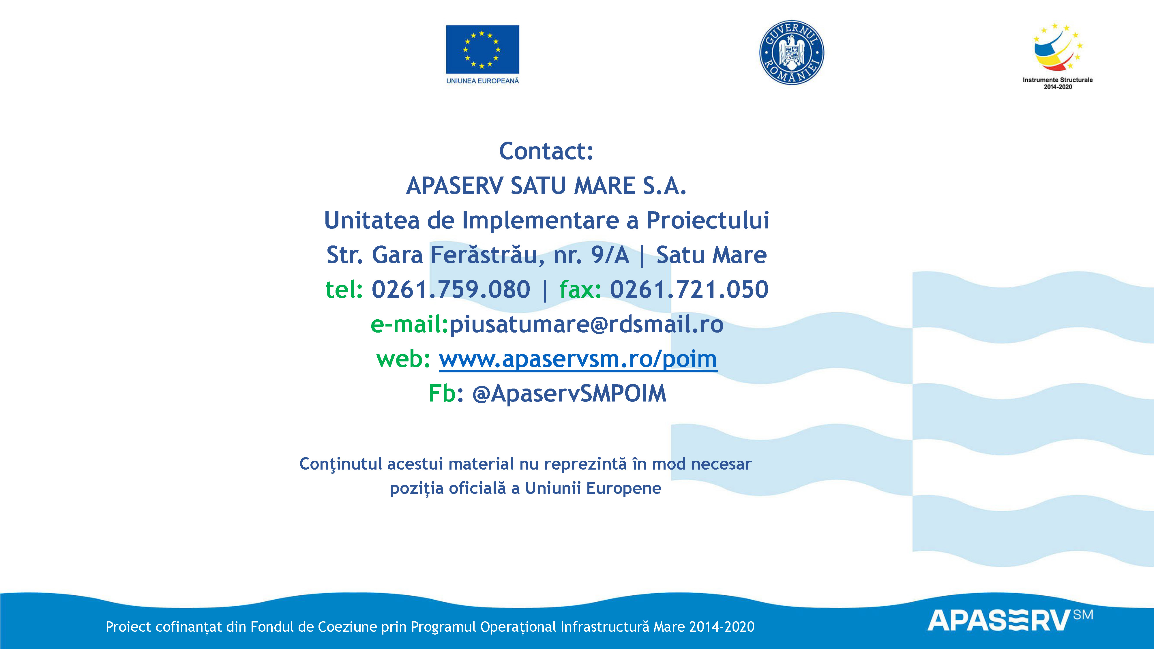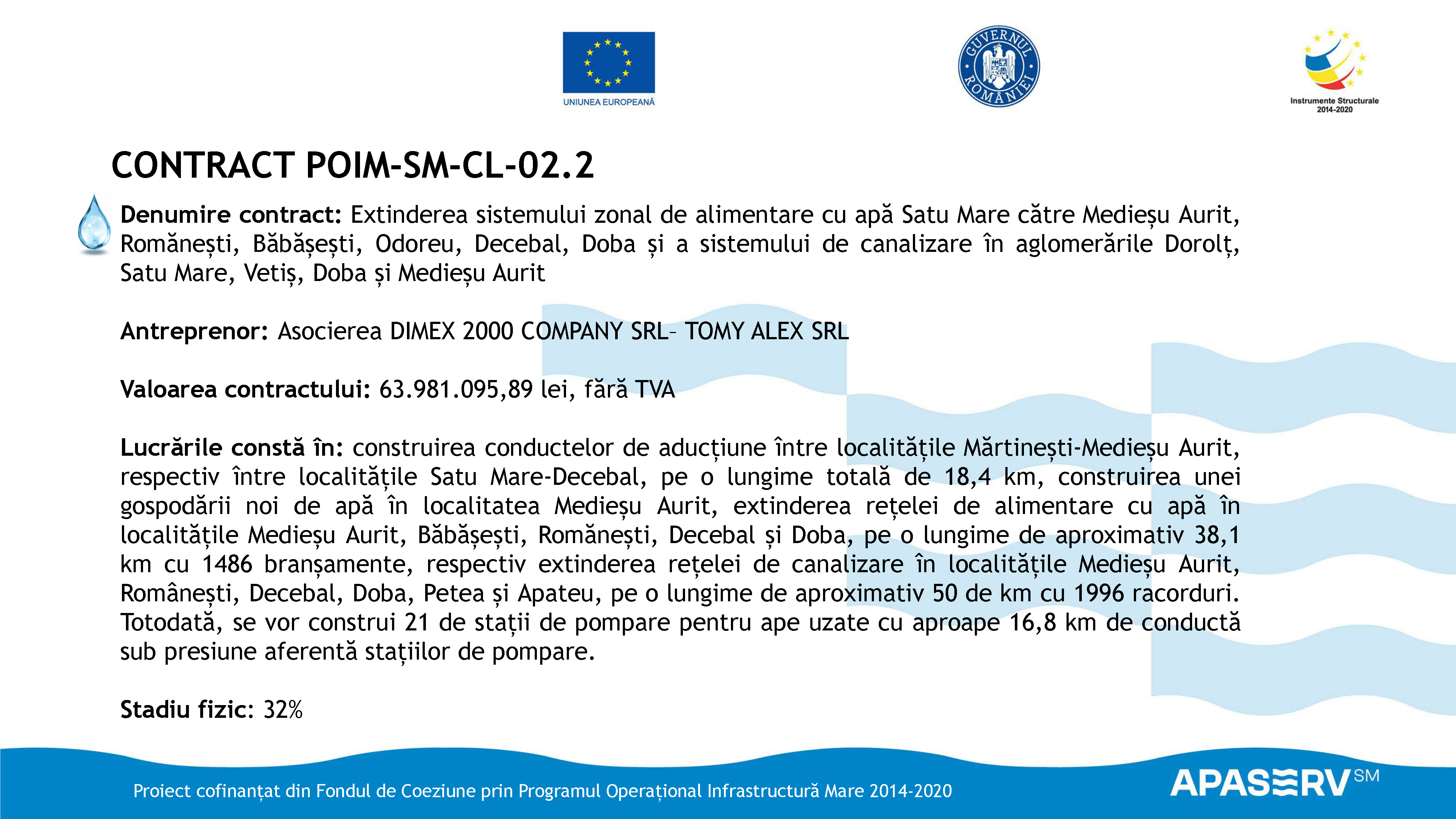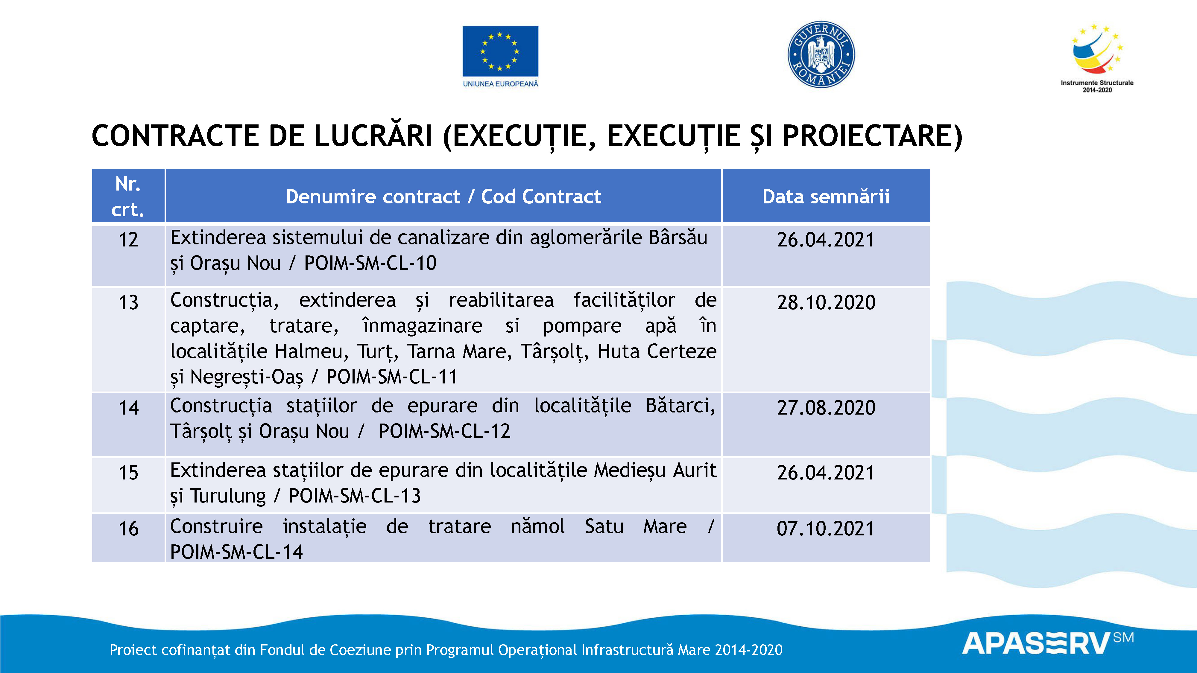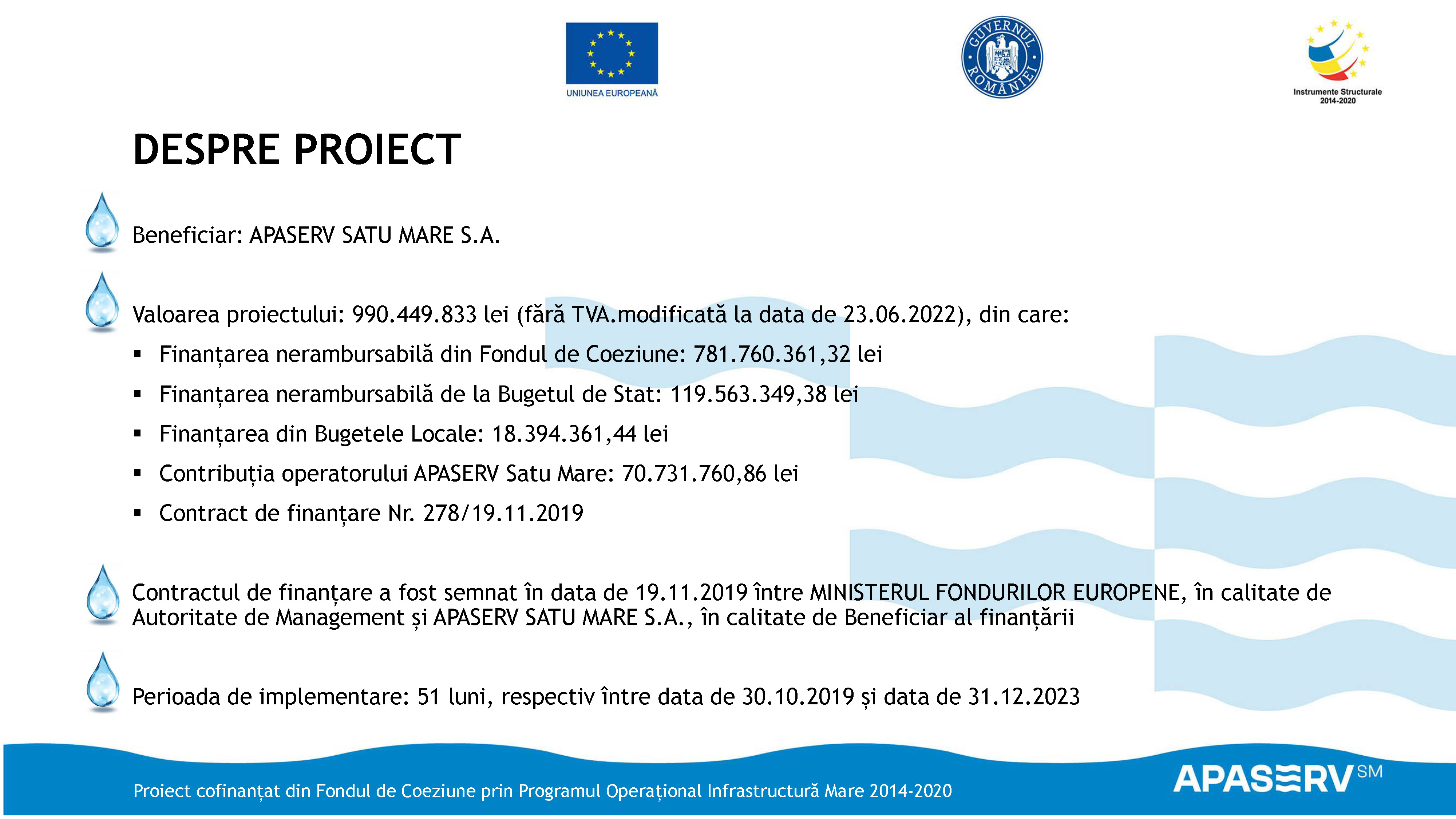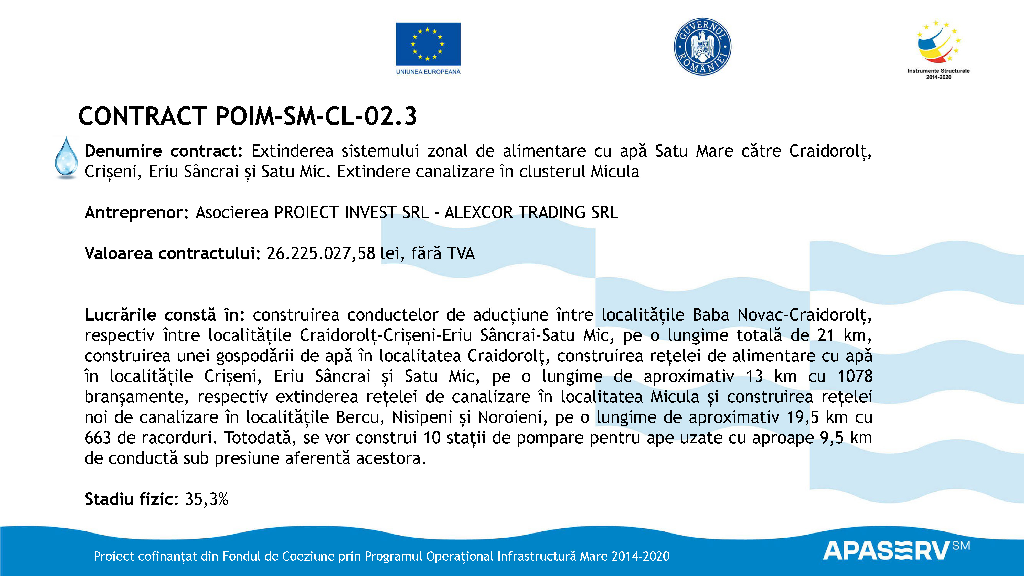 Apaserv S.A derulează cel mai mare proiect de infrastructură din județul Satu Mare. 1,2 miliarde de lei. Satu Mare va beneficia de investiții de 70 milioane de lei. Se vor realiza 16 stații de tratare a apei potabile, 166.5 km de conducte de aducțiune, 258.7 km de rețele de distribuție apă potabilă, 5 stații noi de epurare a apei uzate, 448 km de rețele de canalizare și 132.7 km de colector/conductă de refulare a apei uzate.