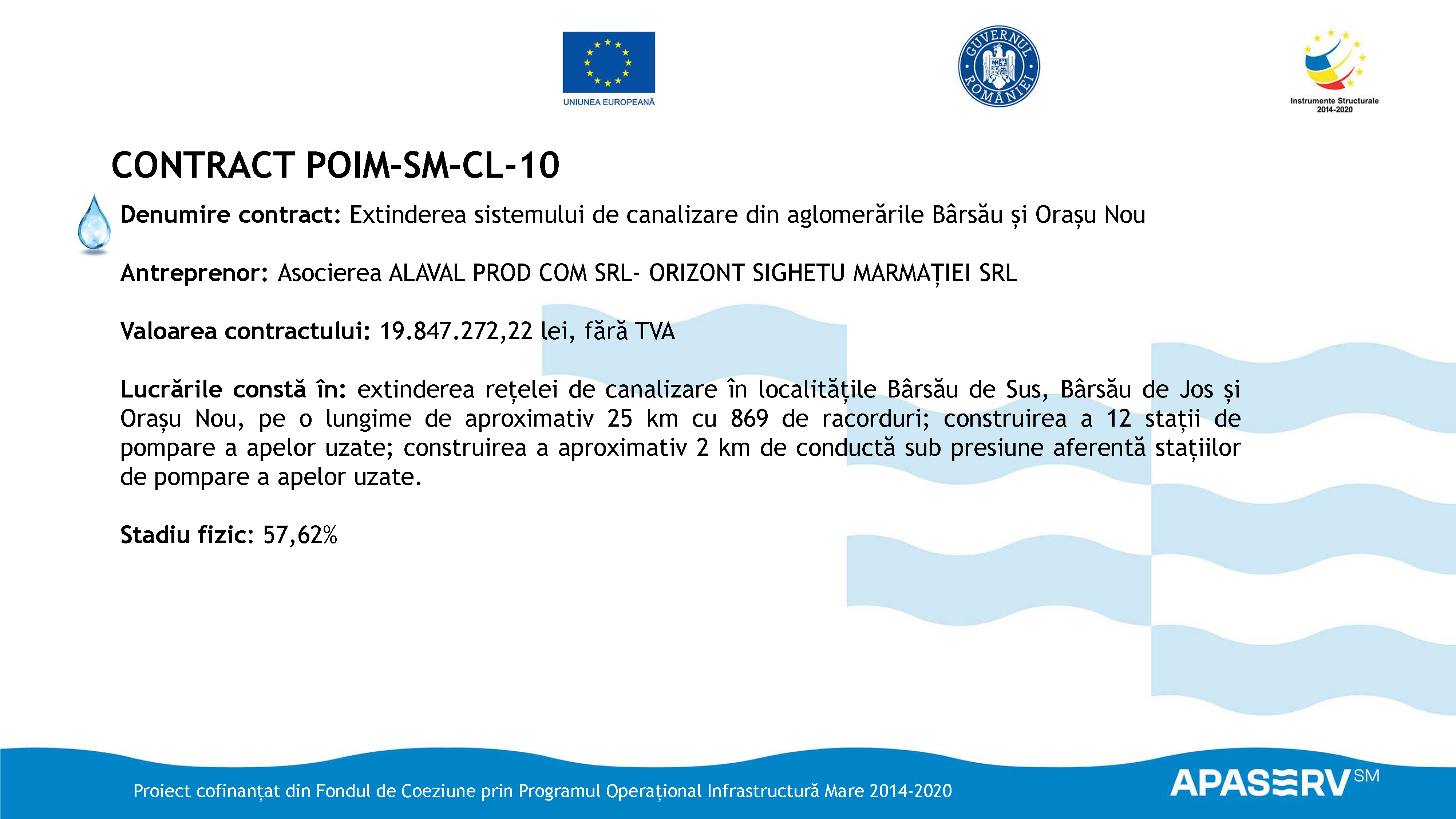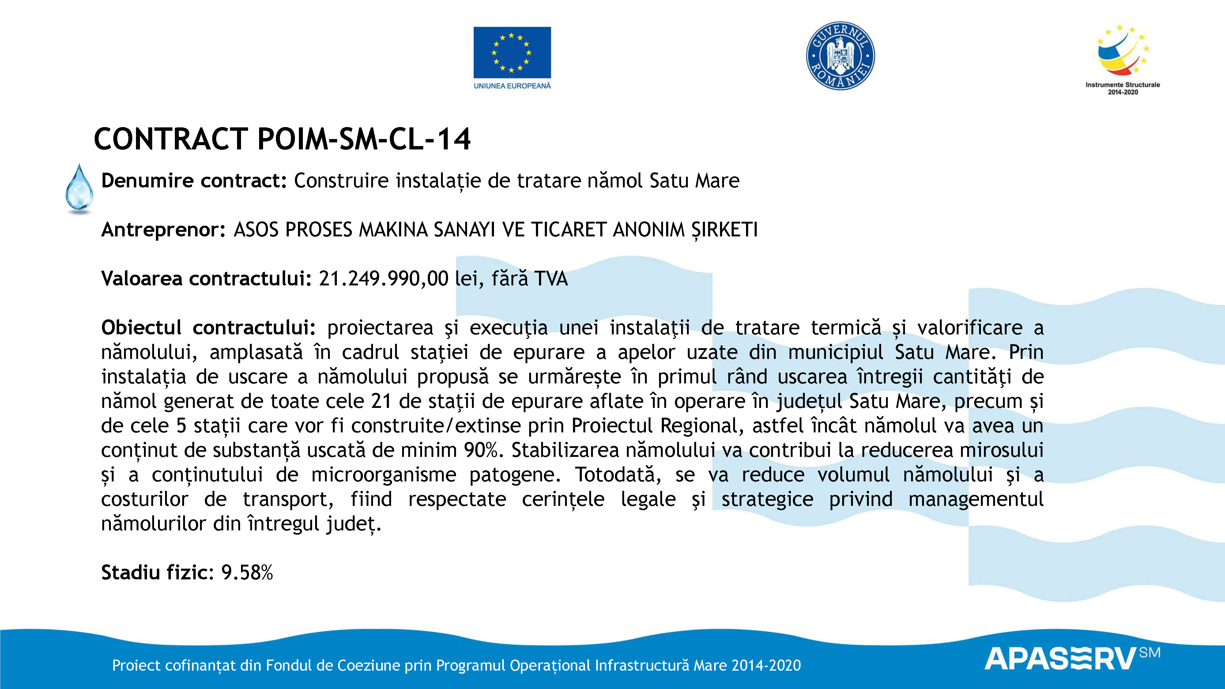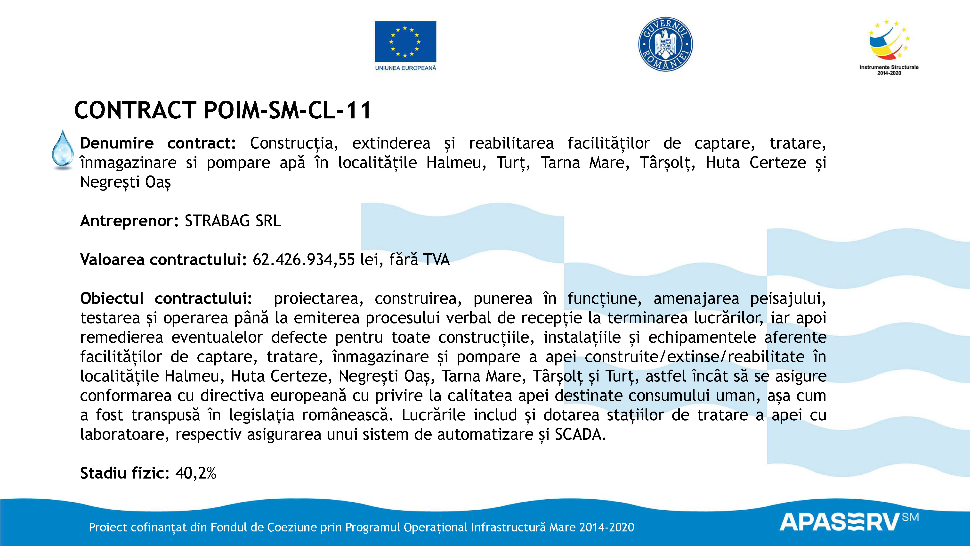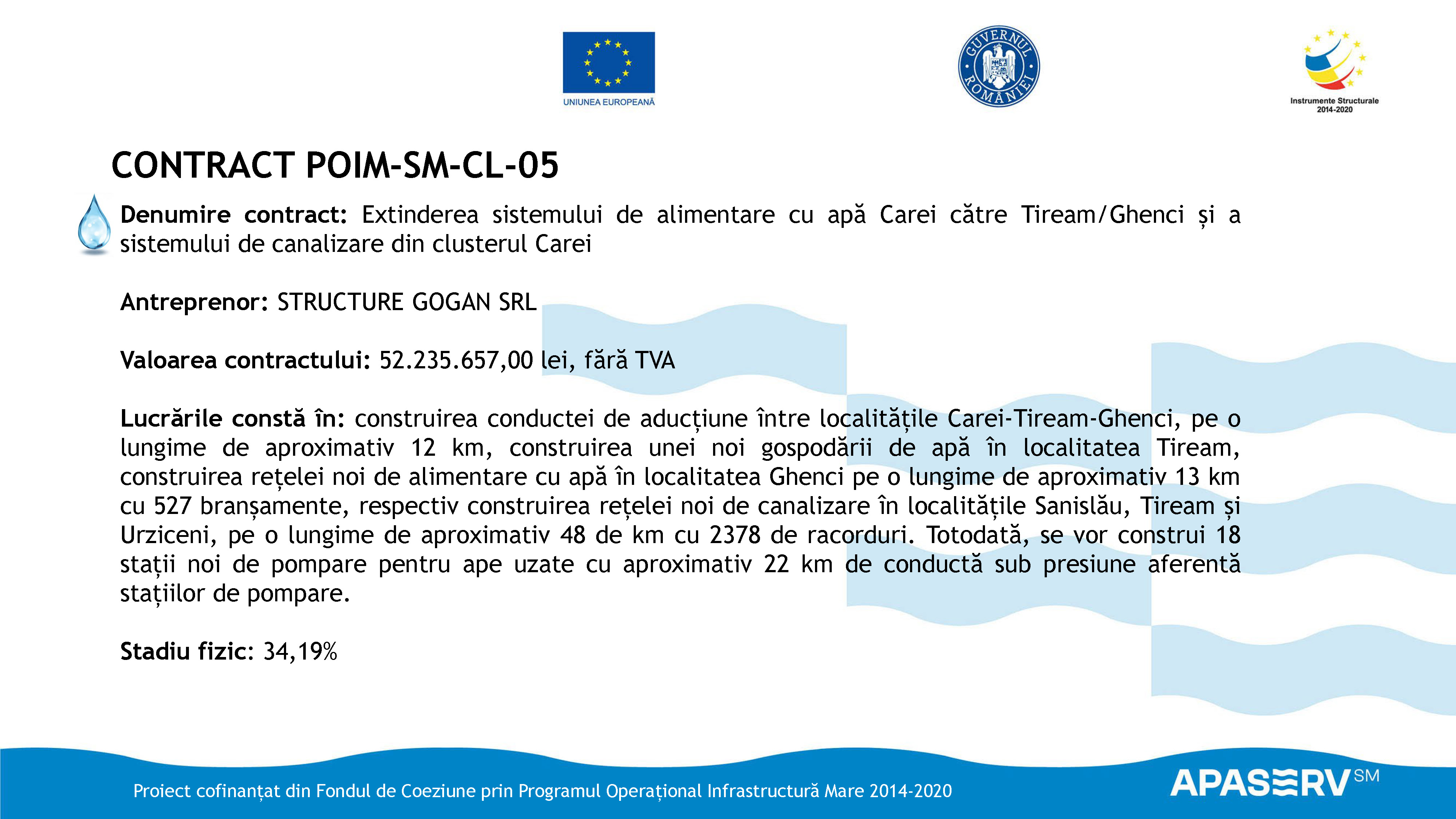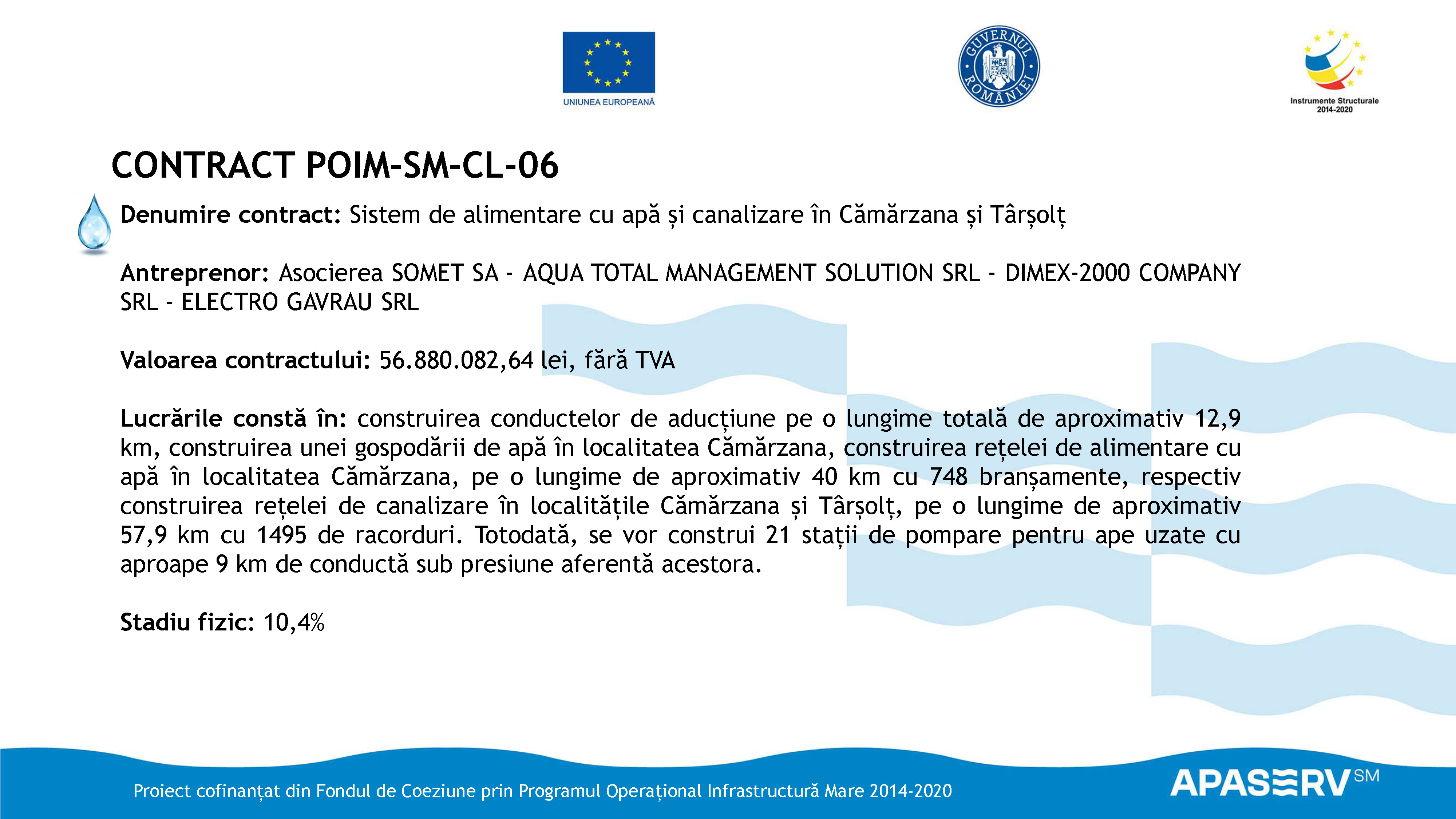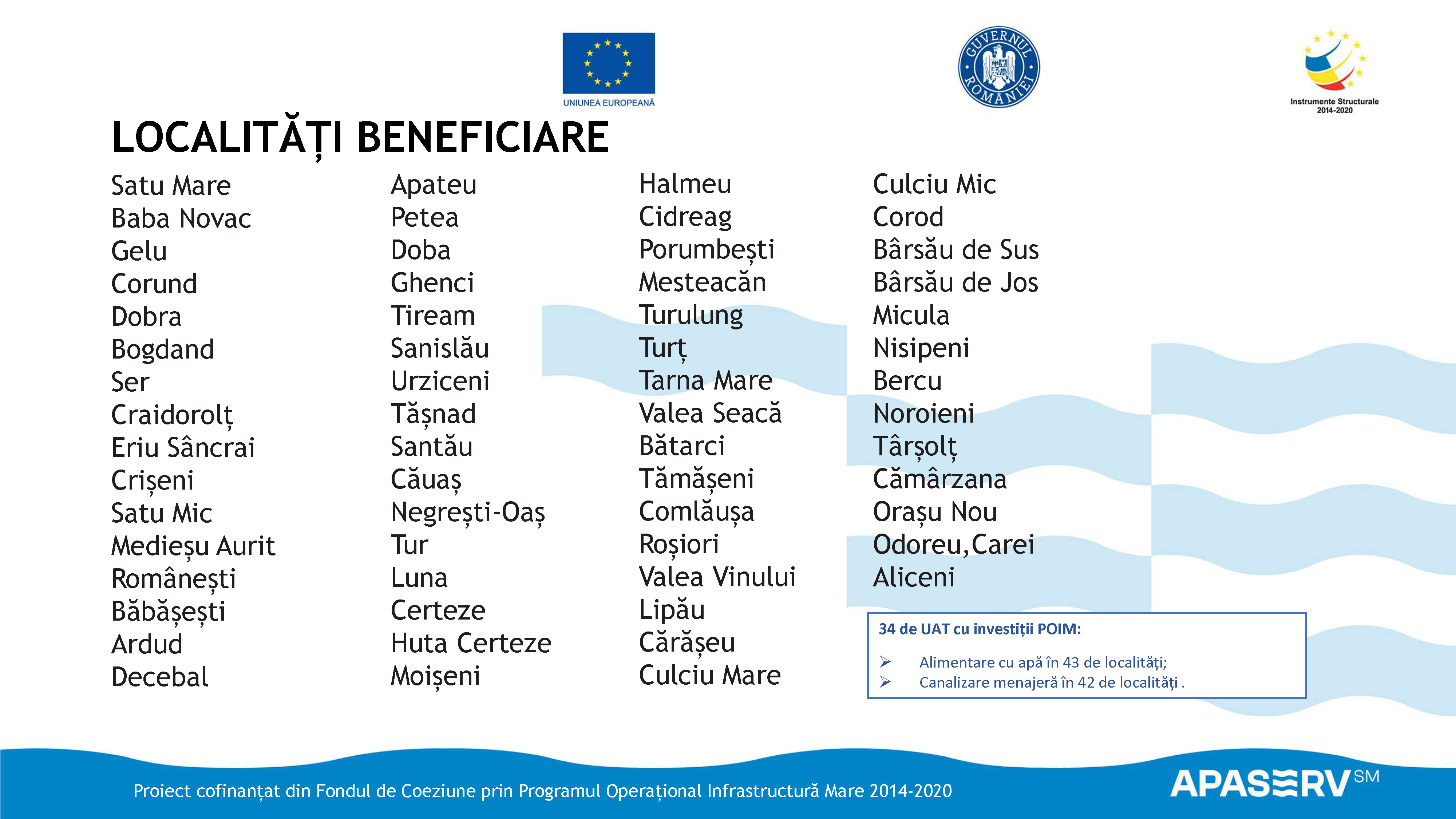 Apaserv S.A derulează cel mai mare proiect de infrastructură din județul Satu Mare. 1,2 miliarde de lei. Satu Mare va beneficia de investiții de 70 milioane de lei. Se vor realiza 16 stații de tratare a apei potabile, 166.5 km de conducte de aducțiune, 258.7 km de rețele de distribuție apă potabilă, 5 stații noi de epurare a apei uzate, 448 km de rețele de canalizare și 132.7 km de colector/conductă de refulare a apei uzate.