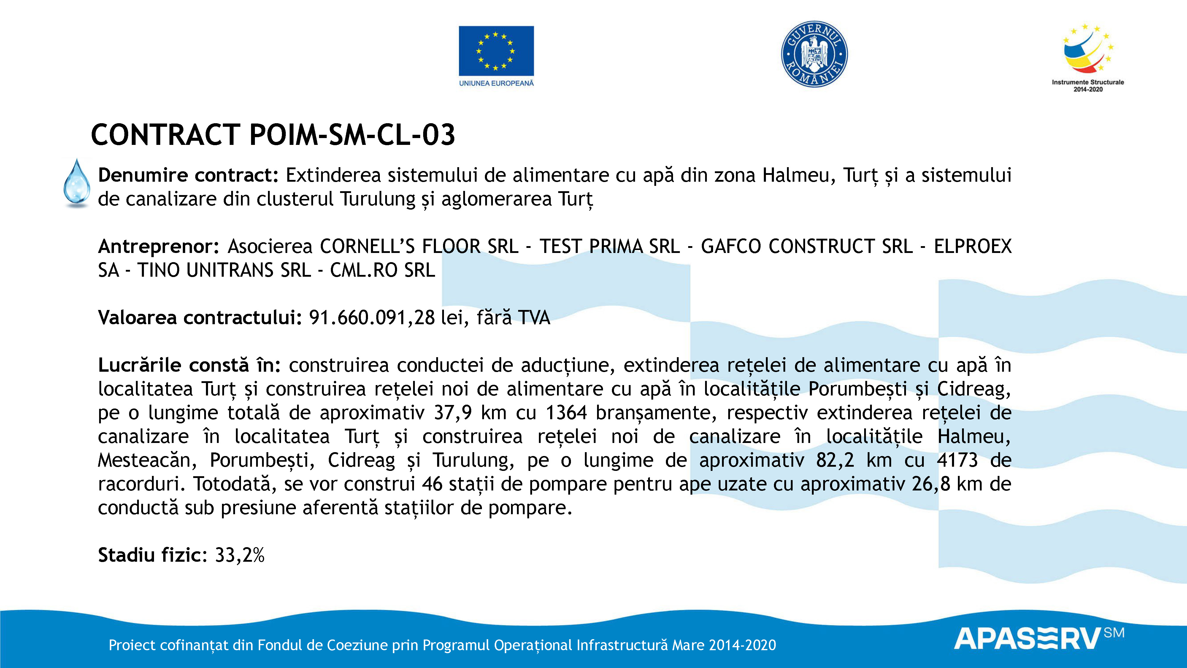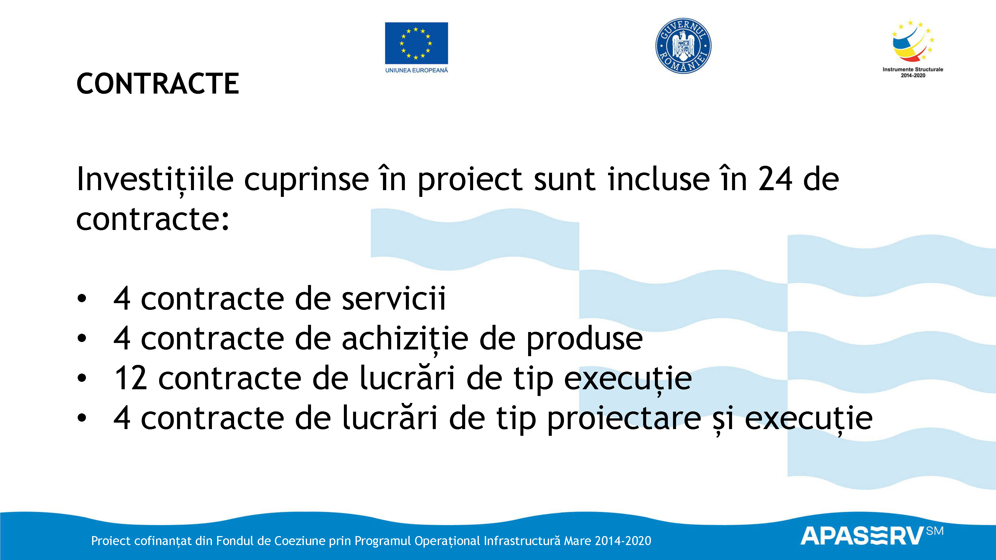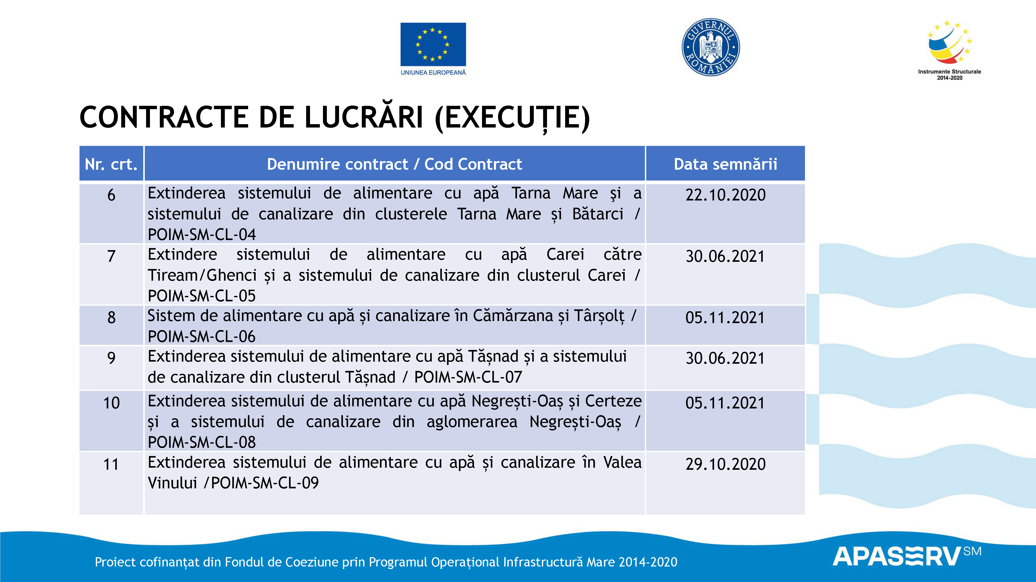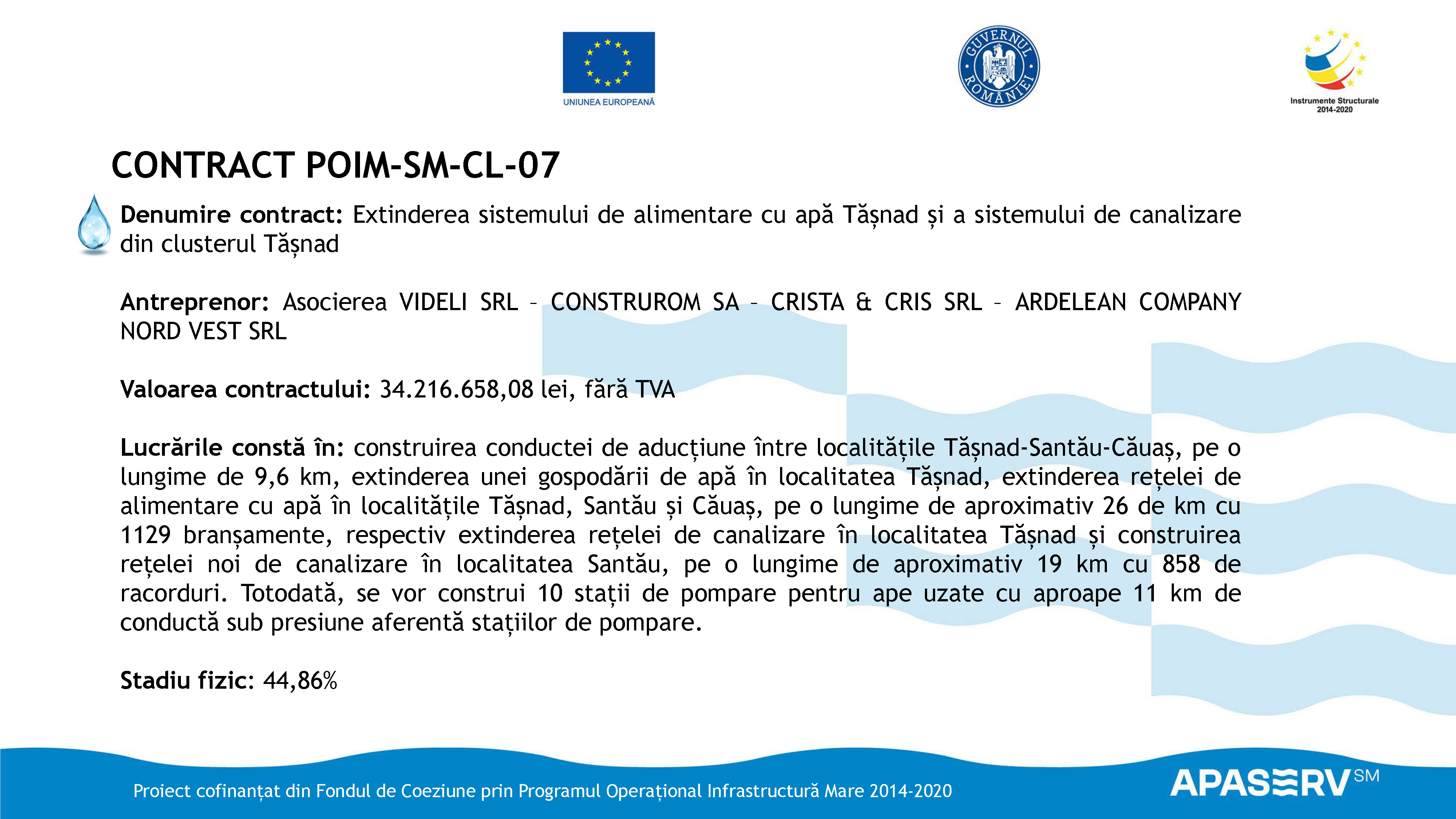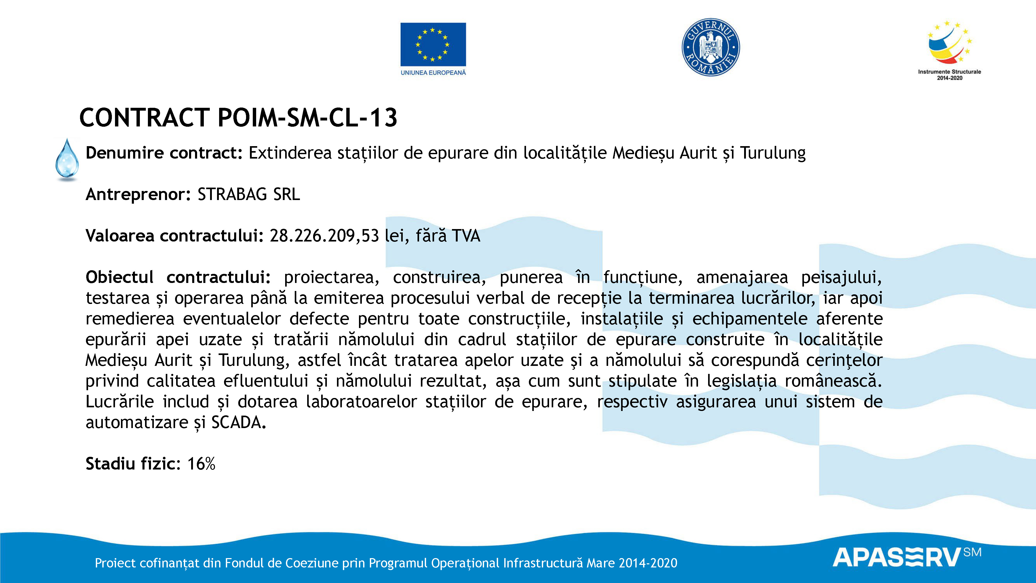 Apaserv S.A derulează cel mai mare proiect de infrastructură din județul Satu Mare. 1,2 miliarde de lei. Satu Mare va beneficia de investiții de 70 milioane de lei. Se vor realiza 16 stații de tratare a apei potabile, 166.5 km de conducte de aducțiune, 258.7 km de rețele de distribuție apă potabilă, 5 stații noi de epurare a apei uzate, 448 km de rețele de canalizare și 132.7 km de colector/conductă de refulare a apei uzate.