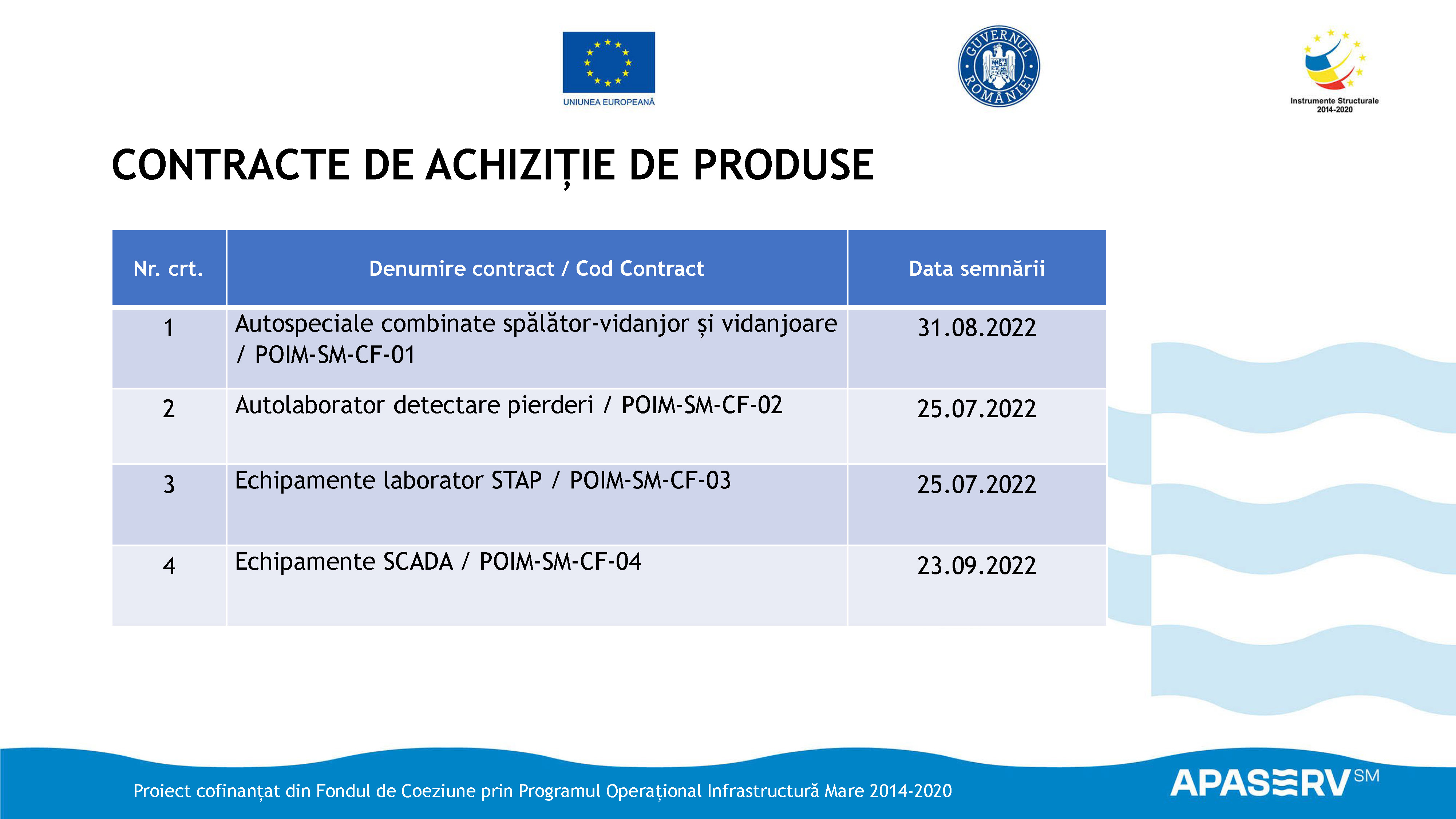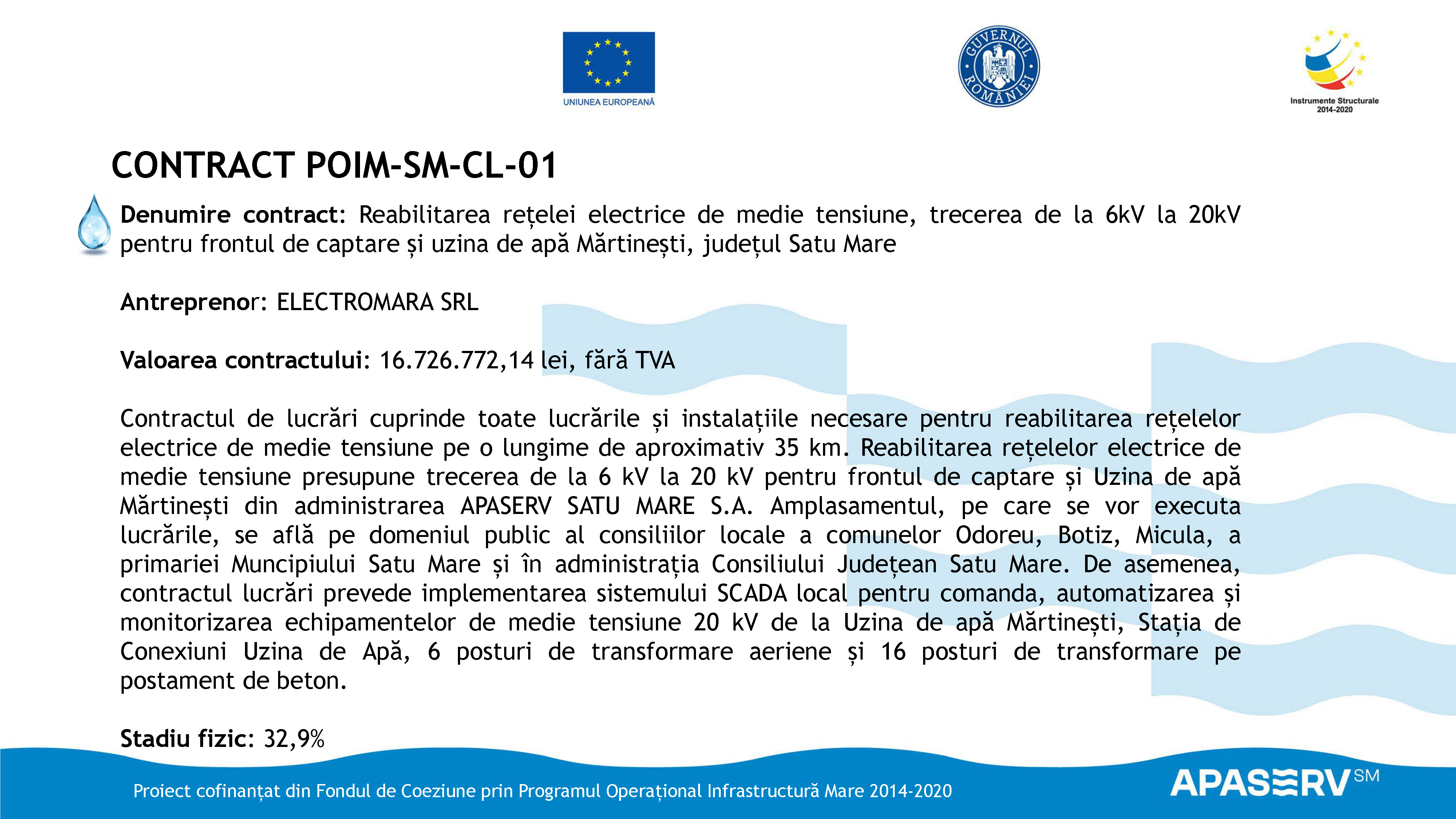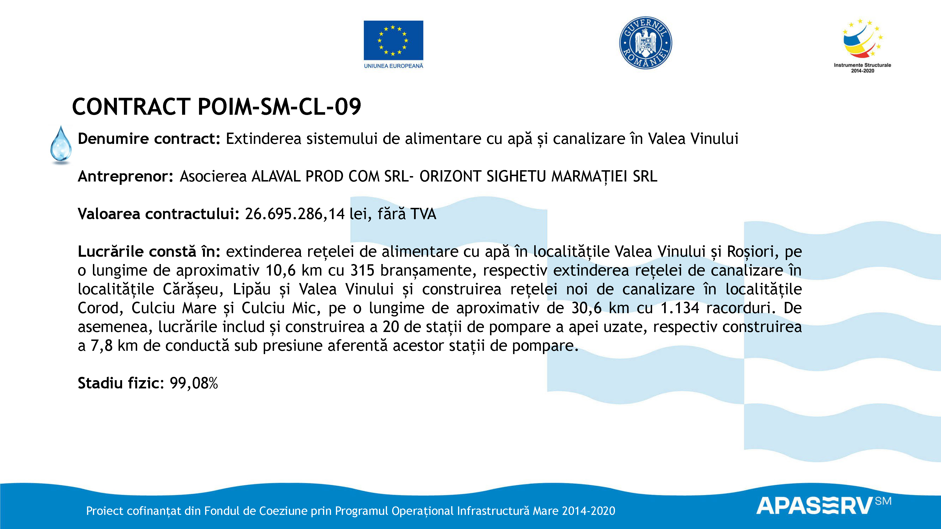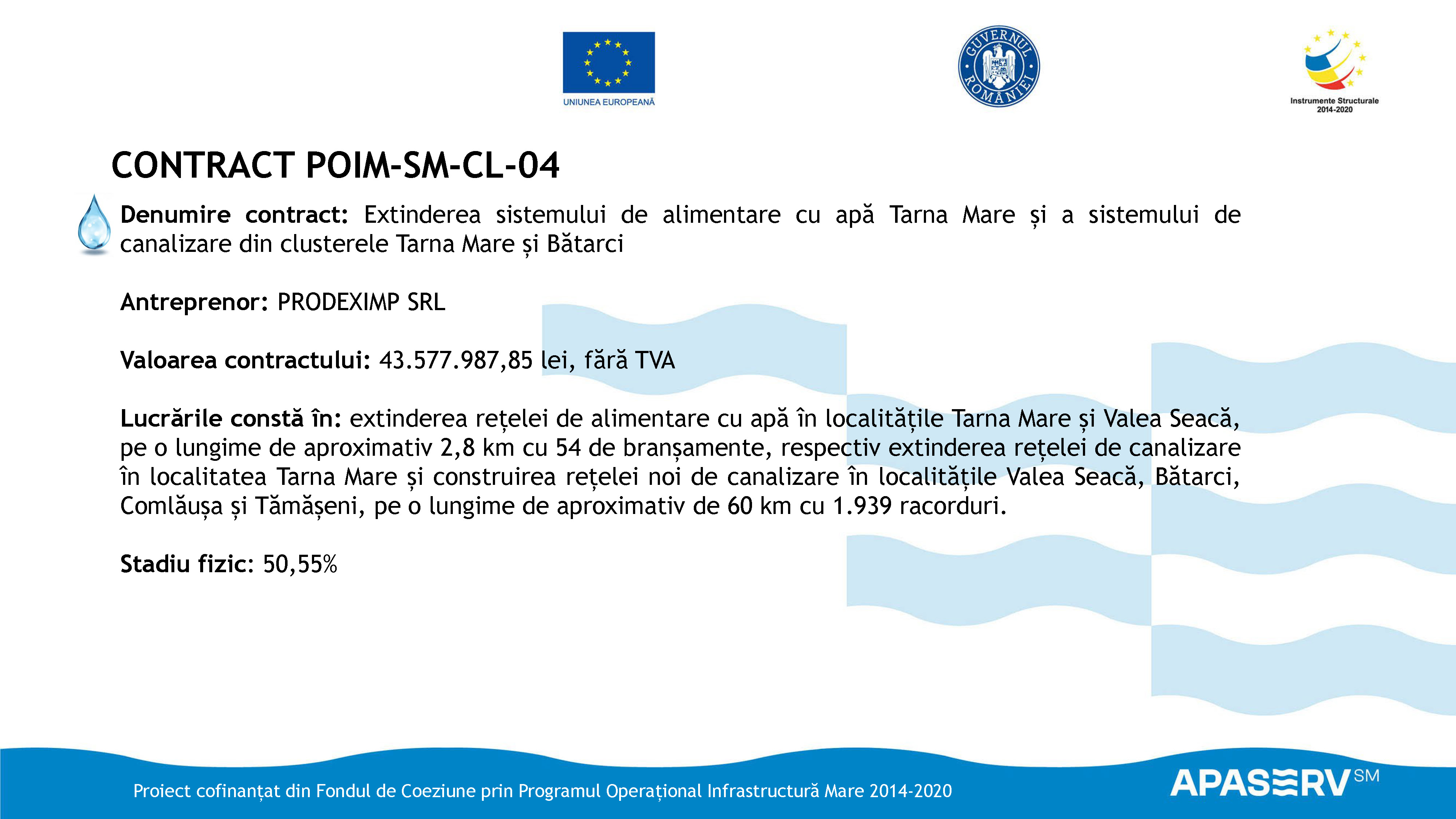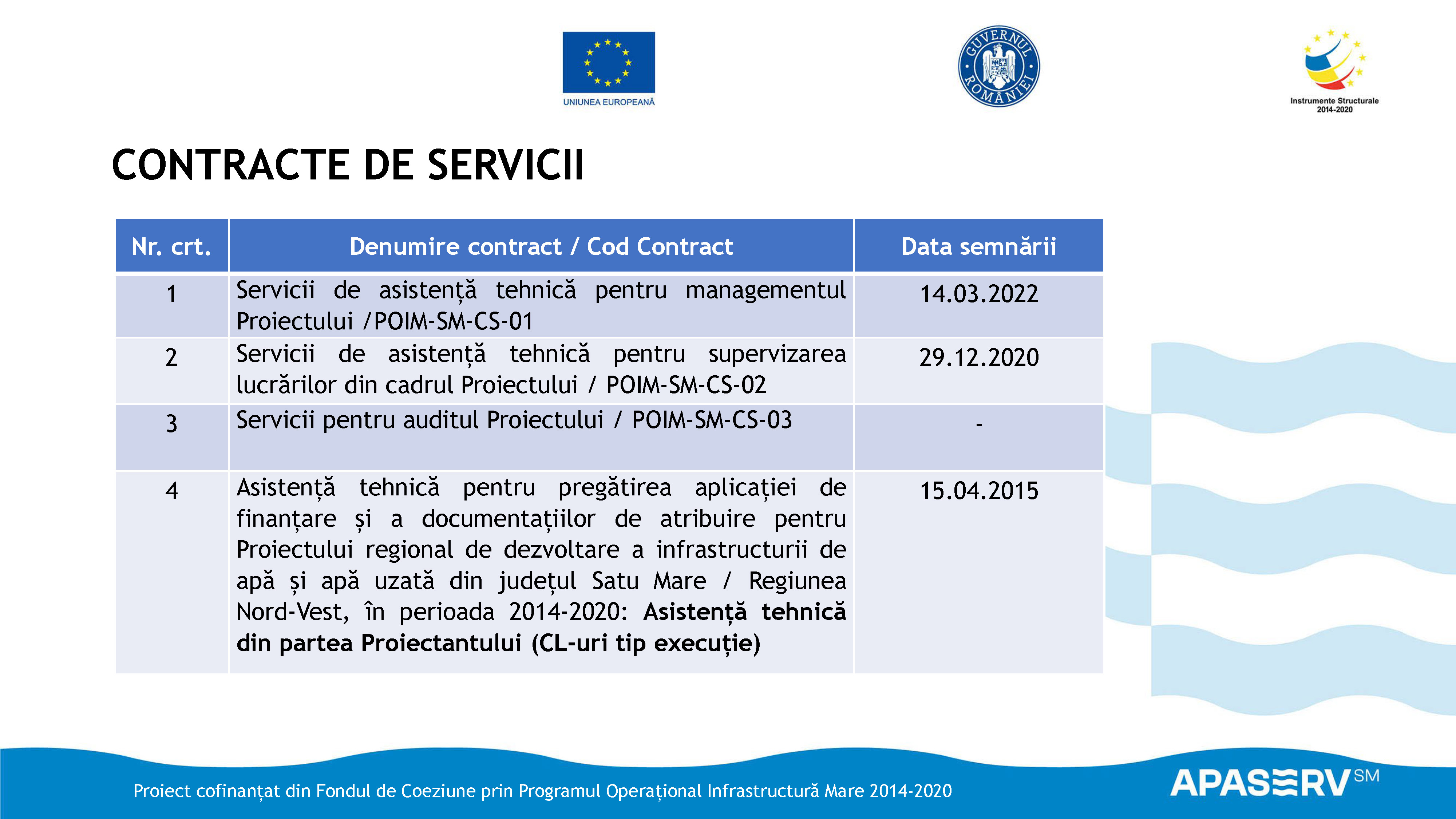 Apaserv S.A derulează cel mai mare proiect de infrastructură din județul Satu Mare. 1,2 miliarde de lei. Satu Mare va beneficia de investiții de 70 milioane de lei. Se vor realiza 16 stații de tratare a apei potabile, 166.5 km de conducte de aducțiune, 258.7 km de rețele de distribuție apă potabilă, 5 stații noi de epurare a apei uzate, 448 km de rețele de canalizare și 132.7 km de colector/conductă de refulare a apei uzate.