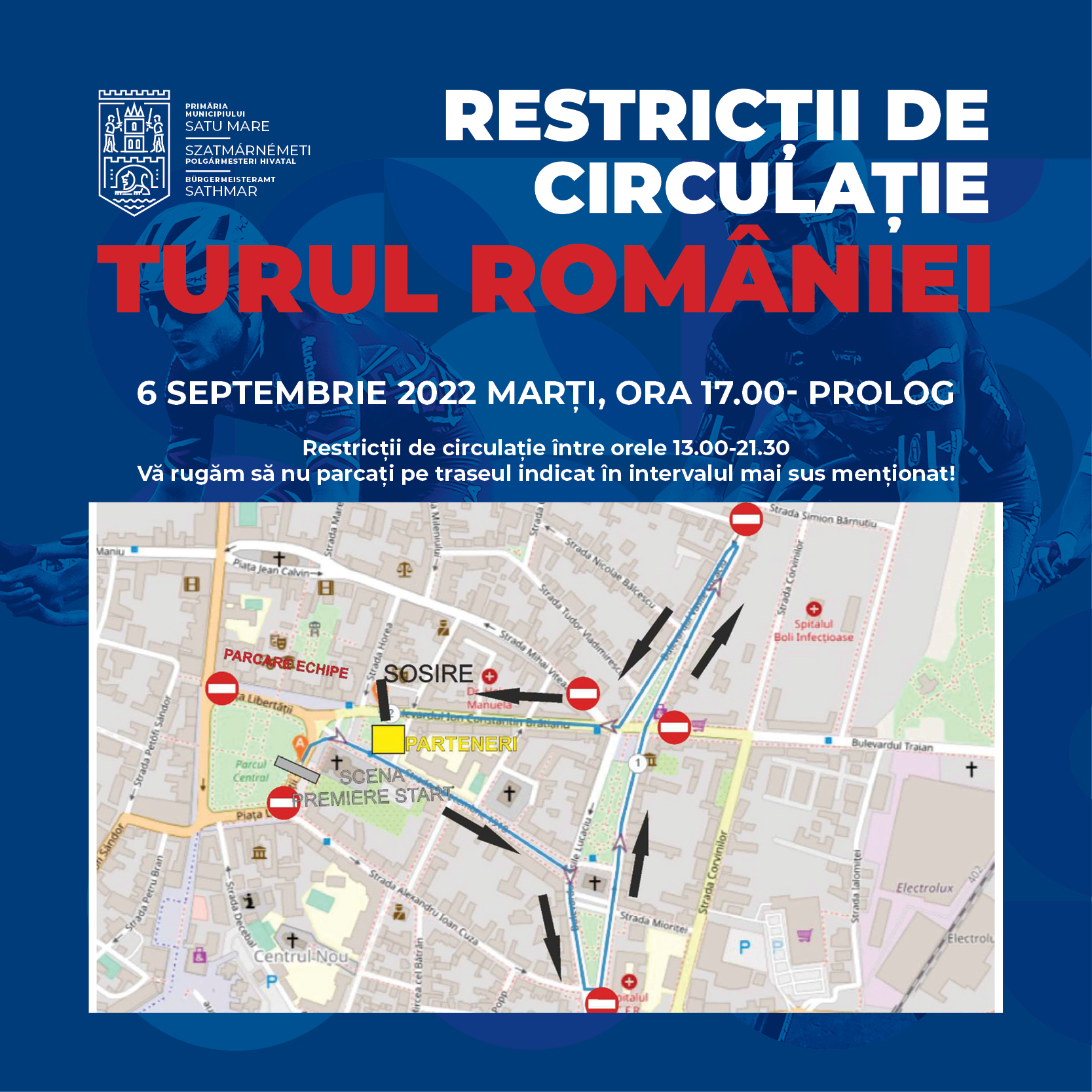 • Restricționarea circulației pentru plecarea caravanei cicliste, începând cu ora 12.00, până la trecerea ultimului sportiv, pe traseul: Piața Libertății – Strada 1 Decembrie 1918 – Bulevardul Lucaciu – Piața Romană – Pod Decebal – Bulevardul O Goga – Bulevardul L Blaga – strada Păulești – ieșire municipiul Satu Mare.