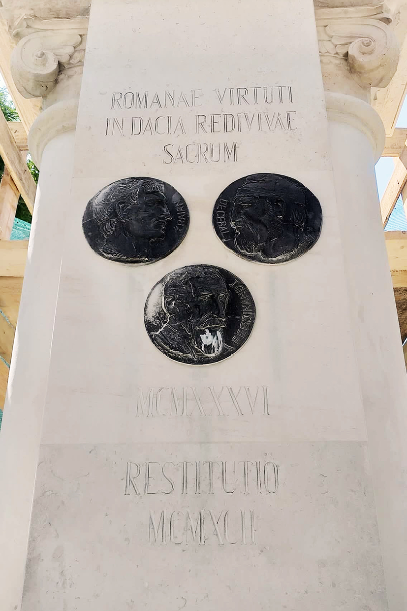 Statuia se află într-o stare de conservare foarte precară, necesitând lucrări de recondiționare a colțurilor și a muchiilor tuturor elementelor din piatră, îndepărtarea depunerilor de mușchi și licheni, curățirea mecanică a suprafeței din marmură, refacerea literelor care compun textul de pe fața și versoul soclului, precum și îndepărtarea desenelor tip graffiti şi a altor semne de vandalism. Statuia este o copie a celebrei „Lupa Capitolina” din capitala Italiei și redă legenda lui Romulus și Remus. Pe stâlpul susținător se găsește inscripția „ROMANAE VIRTUTI IN DACIA REDIVIVAE SACRUM” și trei medalioane turnate cu chipul lui Traian, Decebal și Regele Ferdinand I.