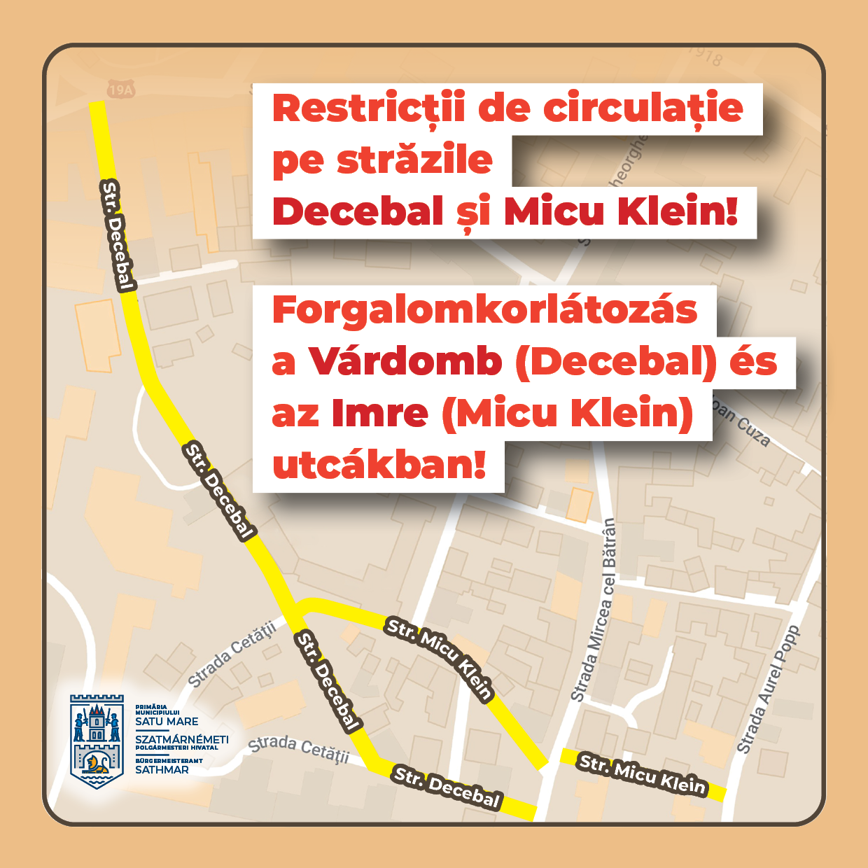 Continuăm lucrările de reabilitare pe str. Micu Klein și str. Decebal! De vineri, 19 august, ora 14.00, încep lucrările de frezare a carosabilului. Pe perioada lucrărilor vor exista restricții de circulație, motiv pentru care vă rugăm să folosiți rutele ocolitoare. Vă mulțumim pentru înțelegere.