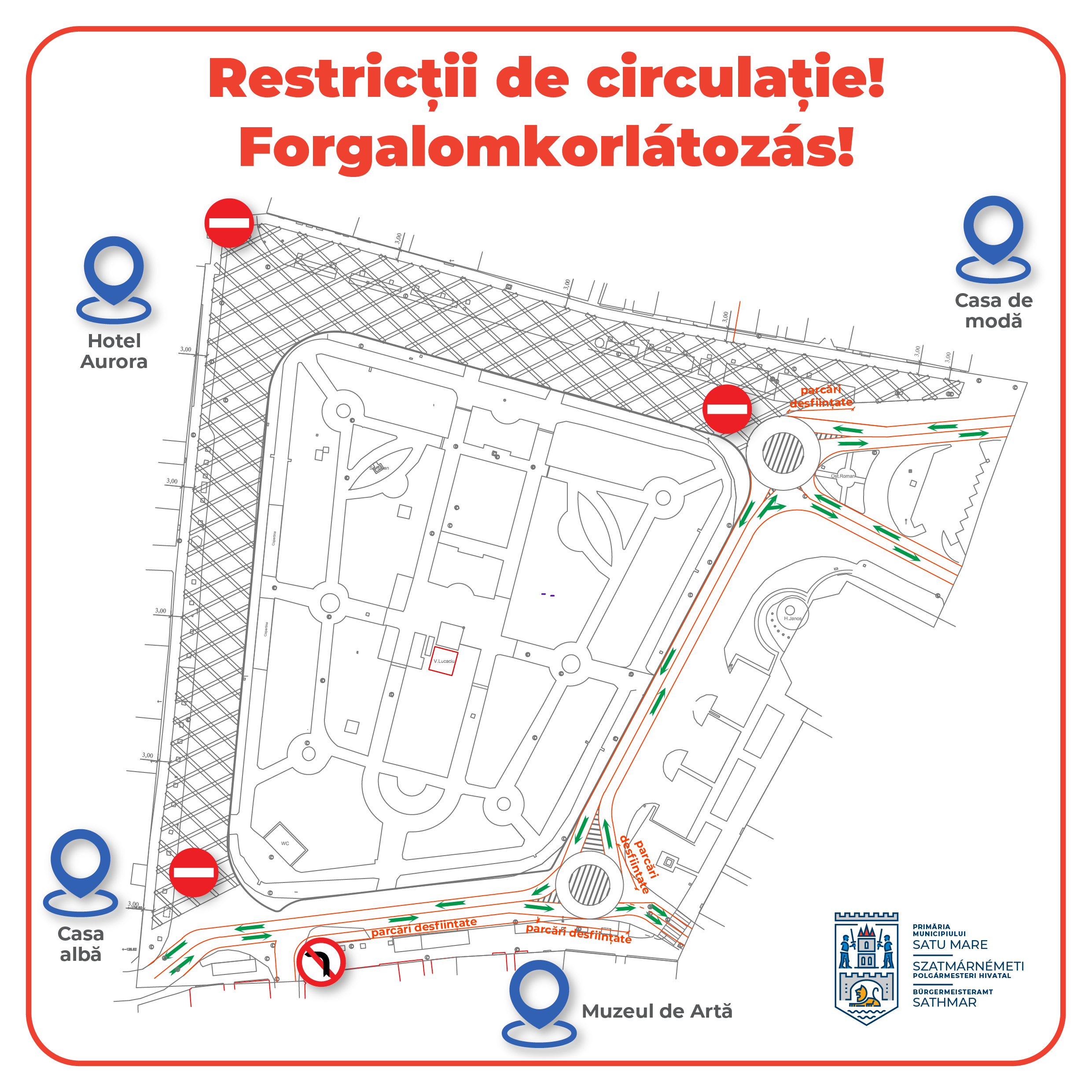 Continuăm reabilitarea Centrului Vechi al municipiului Satu Mare. Începând de sâmbătă, 24 iunie, ora 7.00, se vor aplica noi restricții de circulație în zona de nord a Pieței Libertății, după cum urmează: